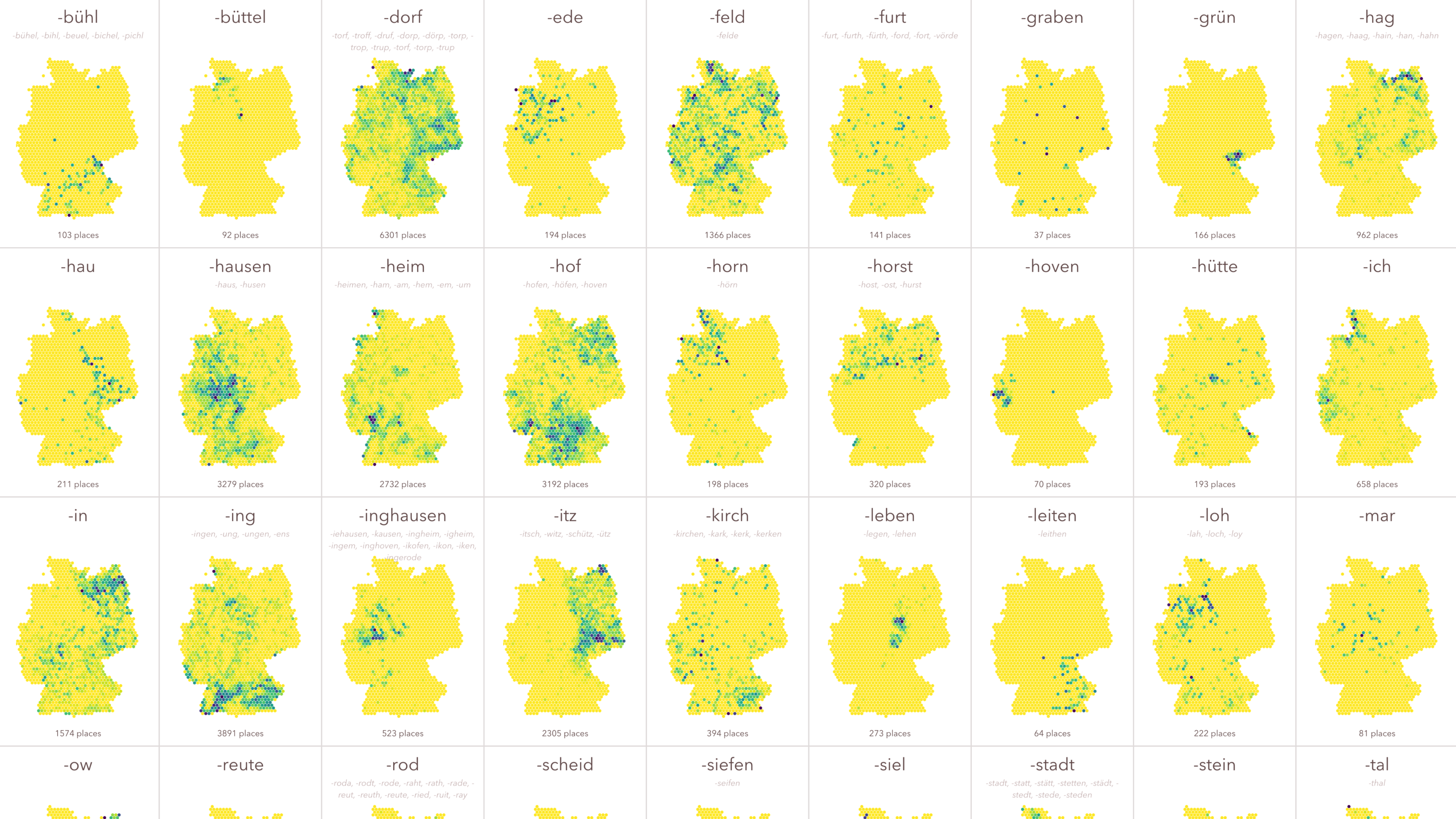 Darker colors indicate a higher proportion of place names with the respective suffix in a geographic cell. Hover over a cell for a while to see a tooltip with the place names.