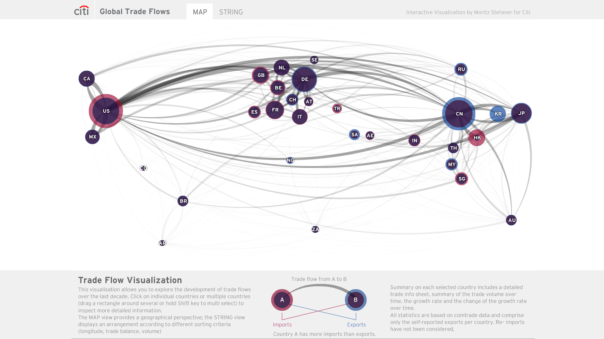The application shows the development of imports and exports in 40 selected countries over the last decade. Users can play back the last ten years on a world map or an ordered display of the countries similar to beads on a string, sorted by trade volume, balance, or latitude.