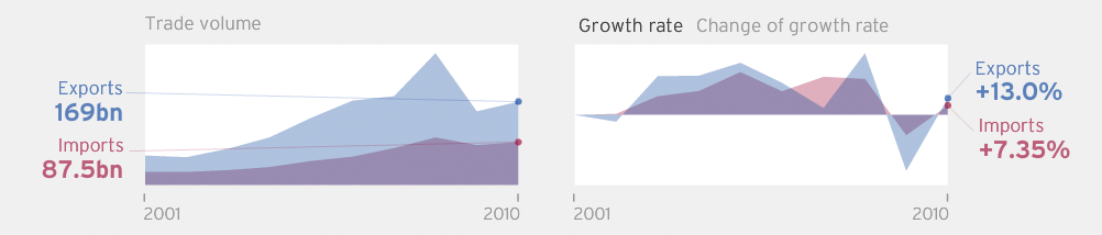 In addition to the overview visualizations that allow perception of global patterns and shifts, precise values can be read from tooltips and a detail panel on the bottom.Finance buffs will appreciate how the detail panels show not only the absolute numbers over time, but also the relative change from year to year (first derivative), as well as the "change of the change" (second derivative).