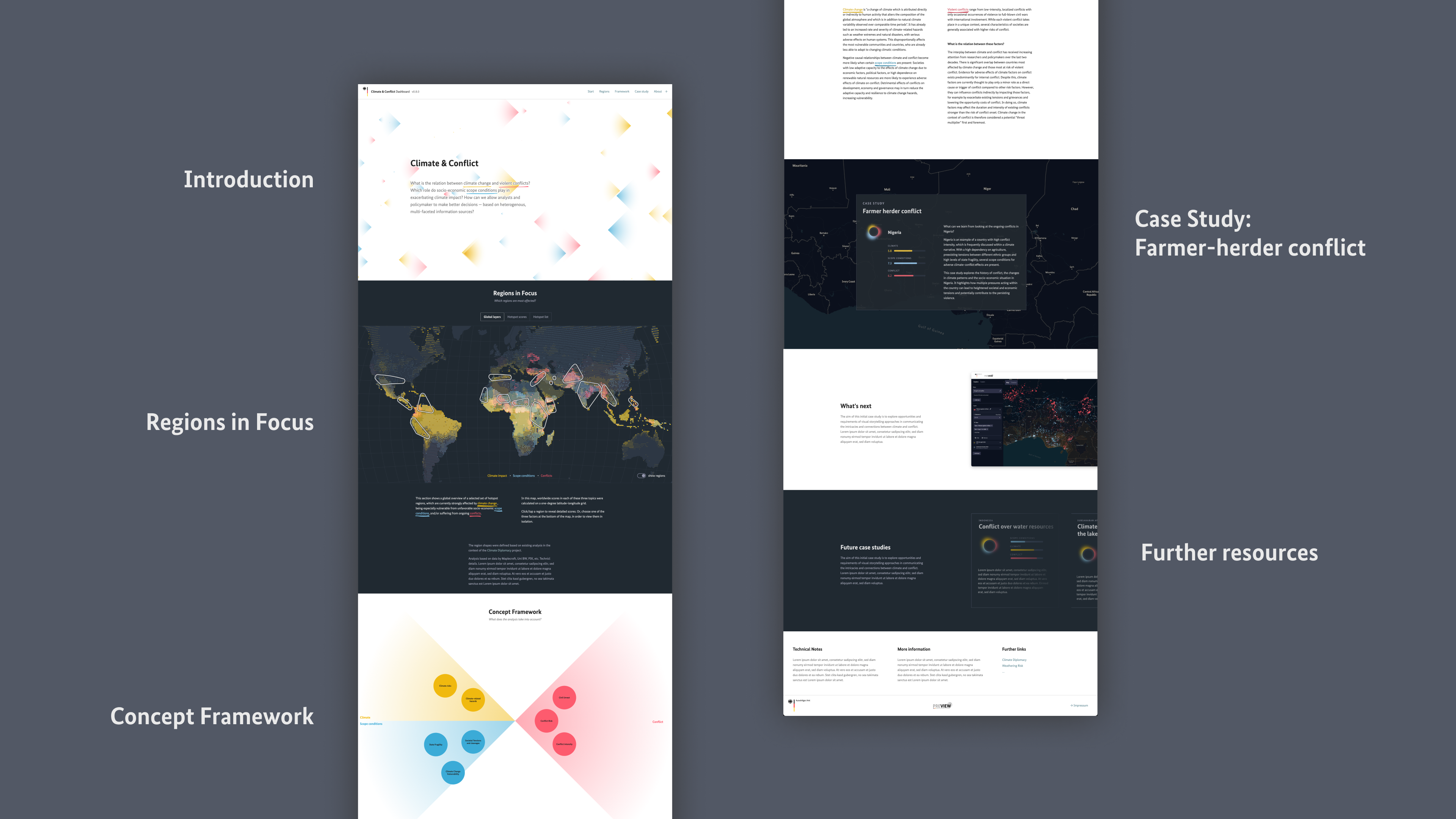 In collaboration with the PREVIEW team at the German Federal Foreign Office, we set out to explore and visually explain the relationship between climate change and conflict. As part of the project, a consistent, expressive data design language was developed and first demonstrated in a web application introducing the topic to wider audiences.