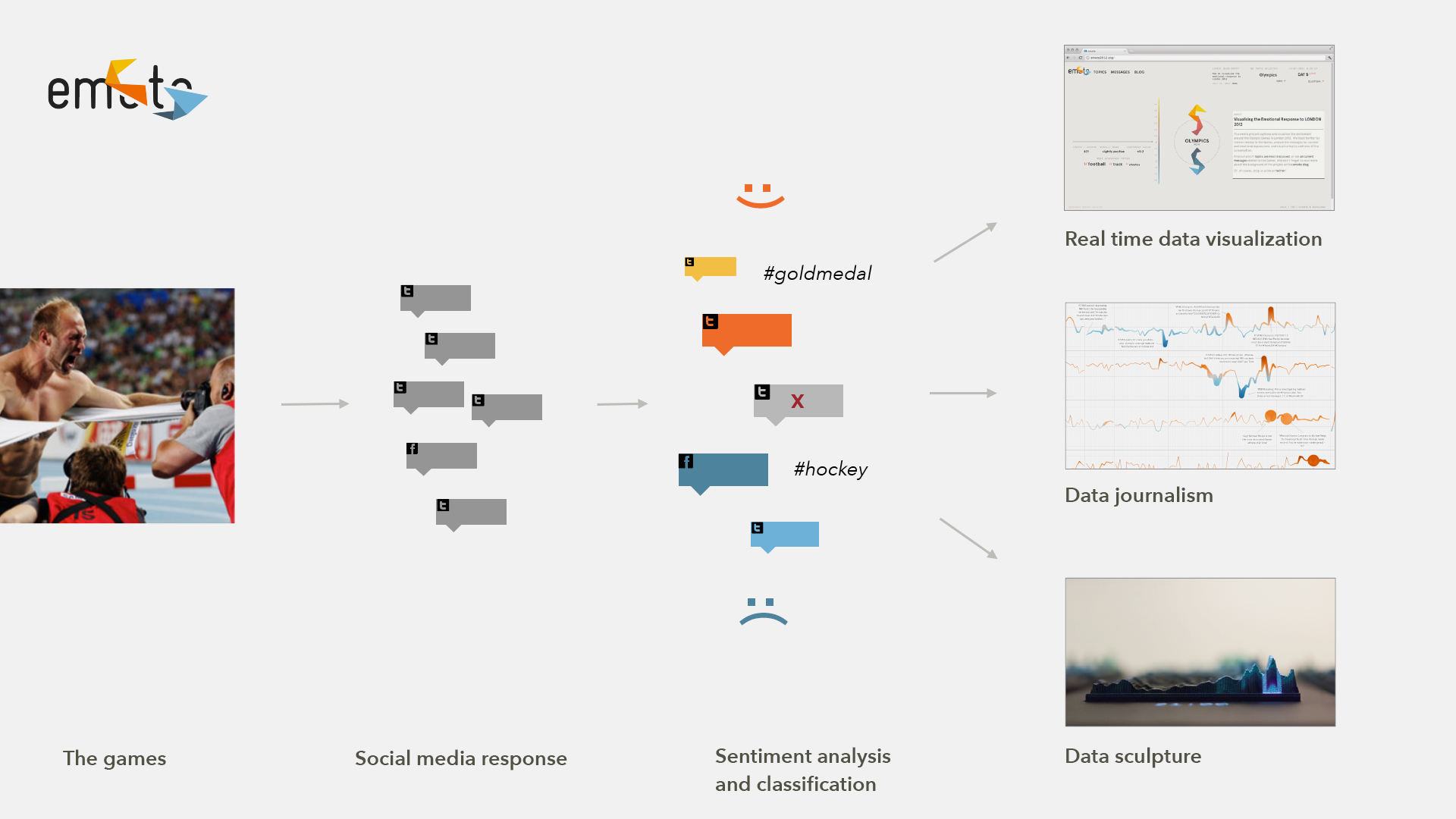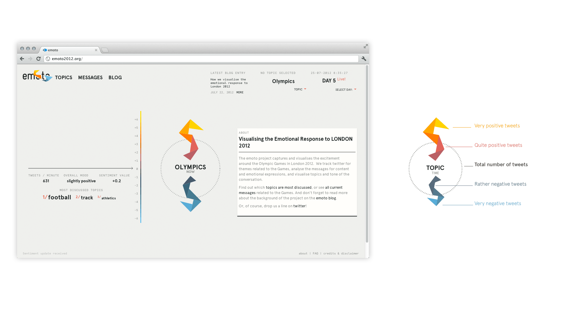 During the Games, we visualized the emotional online response in real-time in a web-based interactive application. Our custom infrastructure consumed the Twitter Streaming API, looking for tweets related to the Olympics and categorized these into sentiment categories (from "happy" to "angry" or "sad" messages). In addition, we detected topics of interest such as disciplines, athletes, nationalities, etc., so in the end we ended up with a real-time sentiment profile for topics relevant to the games. These sentiment profiles were visualized based on a unique origami-like visualization form, allowing easy comparison of how popular or controversial different topics were at a given time. In addition, incoming tweets were visualized in a stream-like message view, featuring an "inverse parallax" effect, where bigger ("more important") tweets would float more slowly on top, while less cited or referred to tweets were flying by faster in the background.