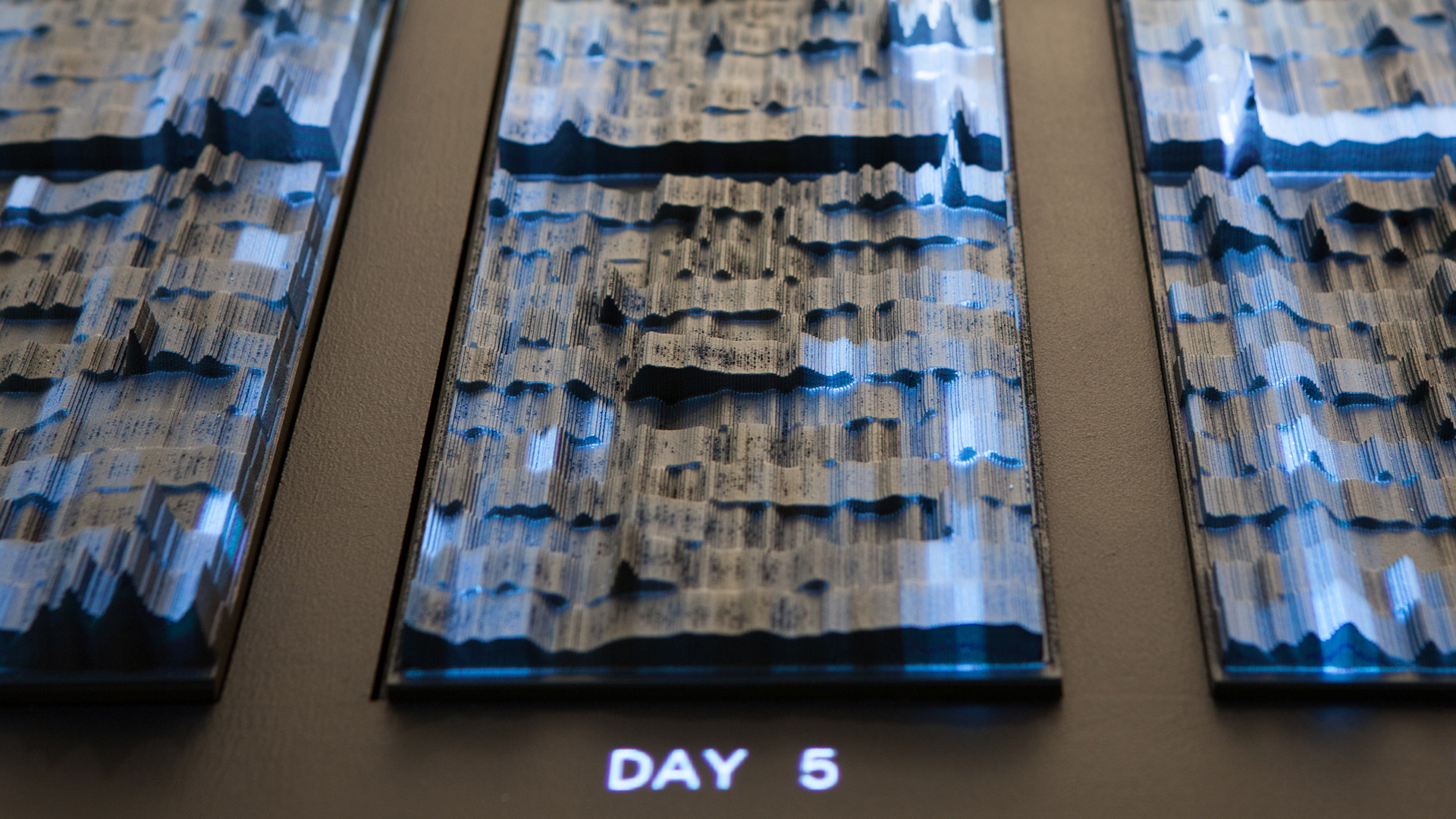 In many ways the crowning piece of the project, and a conceptual counterpoint to the ephemeral web activities, our data sculpture preserved the more than 12 million tweets in physical form. We had 17 plates CNC-milled — one for each day of the games — with a relief heatmap indicating the emotional highs and lows of each day. Overlay projections highlighted individual stories, and visitors could scroll through the most retweeted tweets per hour for each story using a control knob.