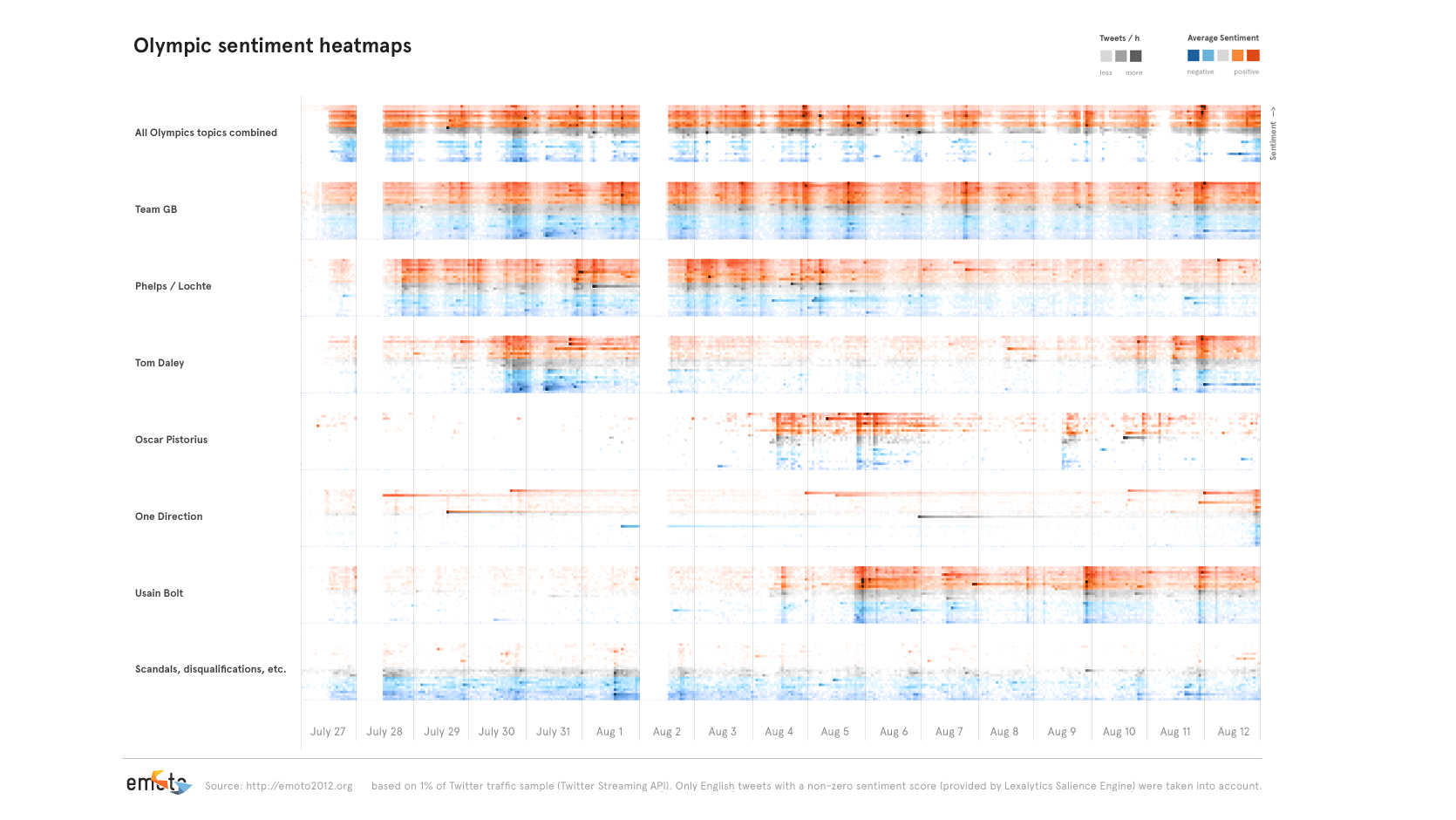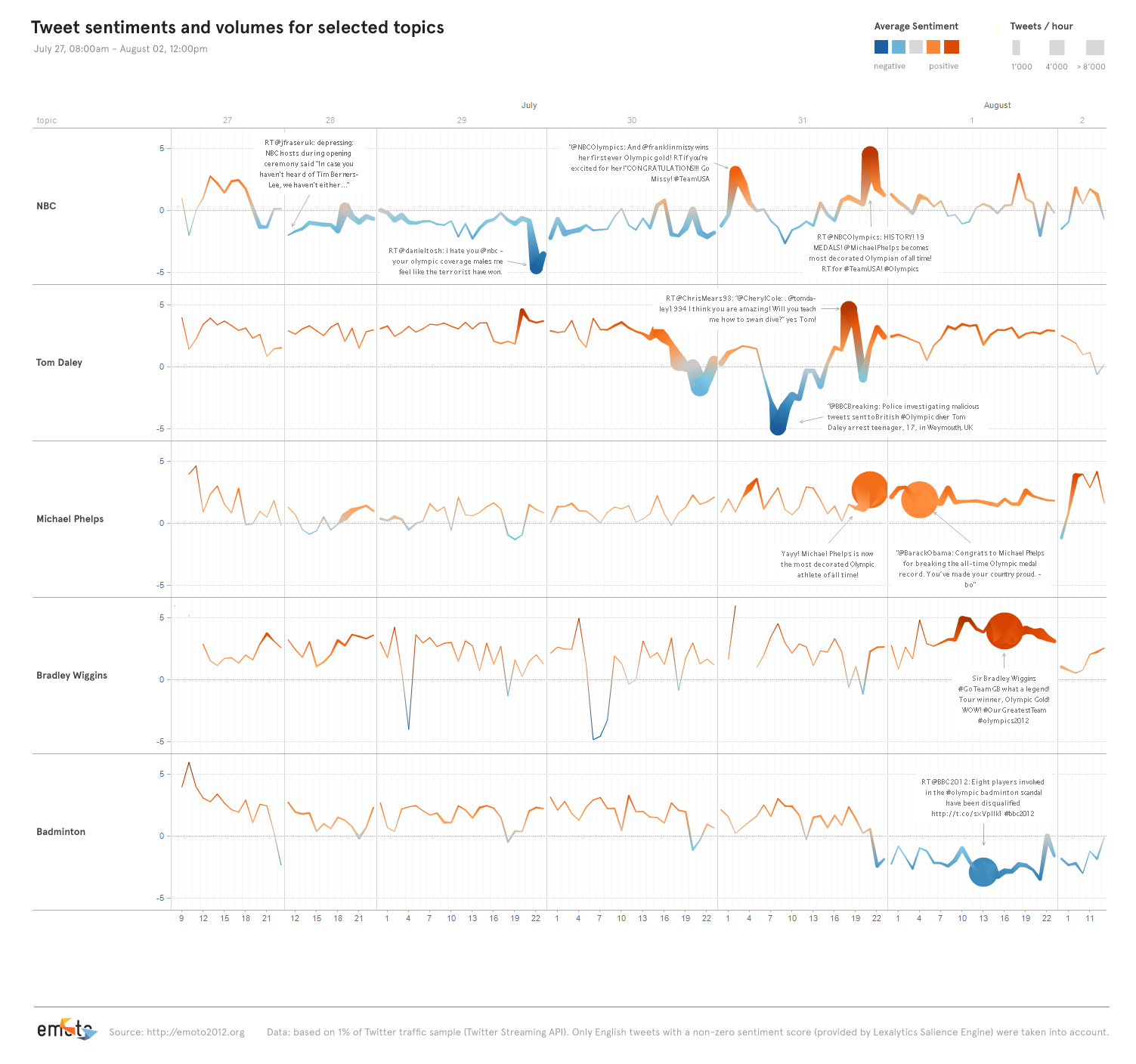In this context, we developed a chart type we called "sentigraph", which encodes sentiment in color and vertical position of a line, and at the same time the number of messages in line strength — it proved to be highly effective.