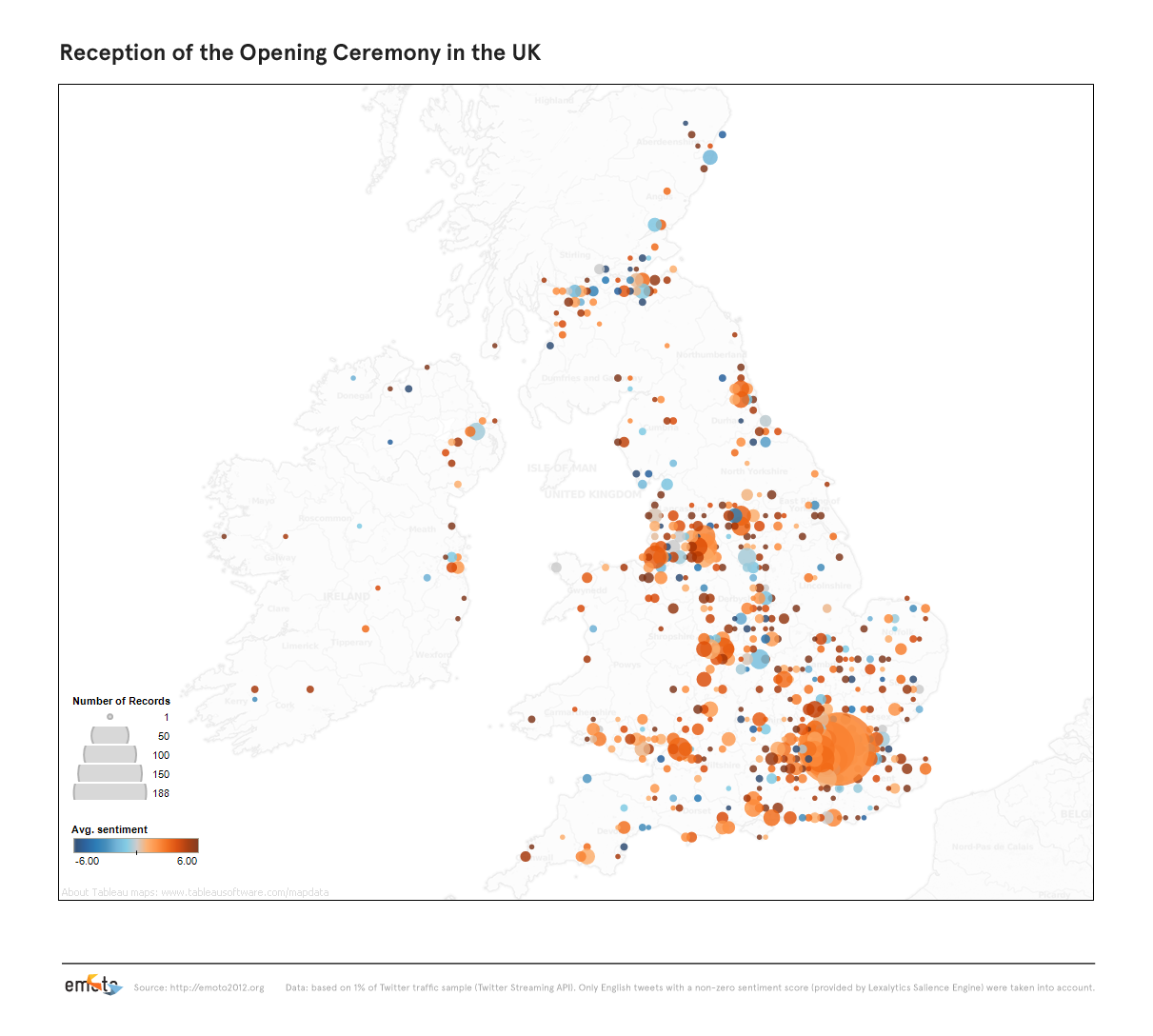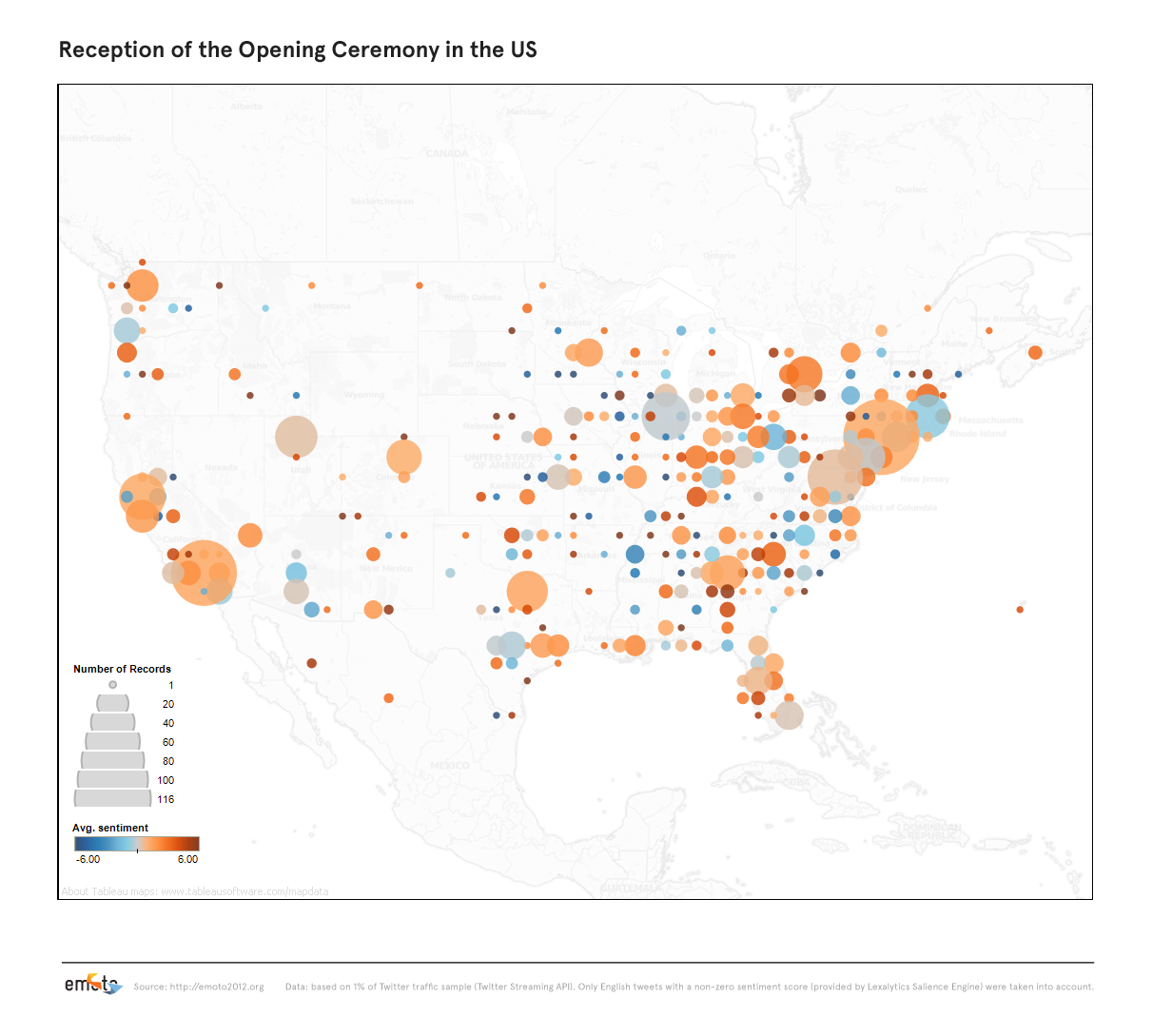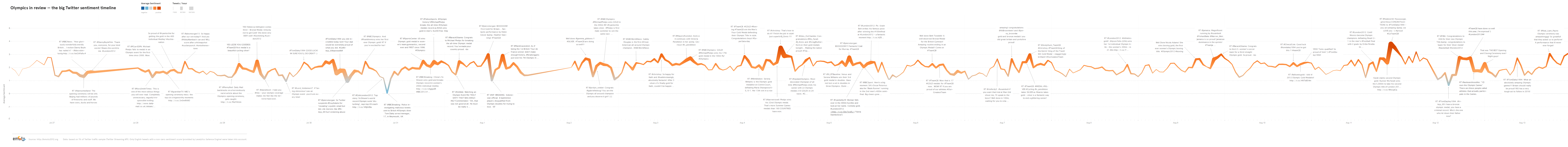 As a complement to the fast-moving, ever-changing real-time popularity contest, we investigated various individual stories, such as the reception of the opening ceremony in the US and the UK, or the sentiment development of individual topics on the opening weekend.