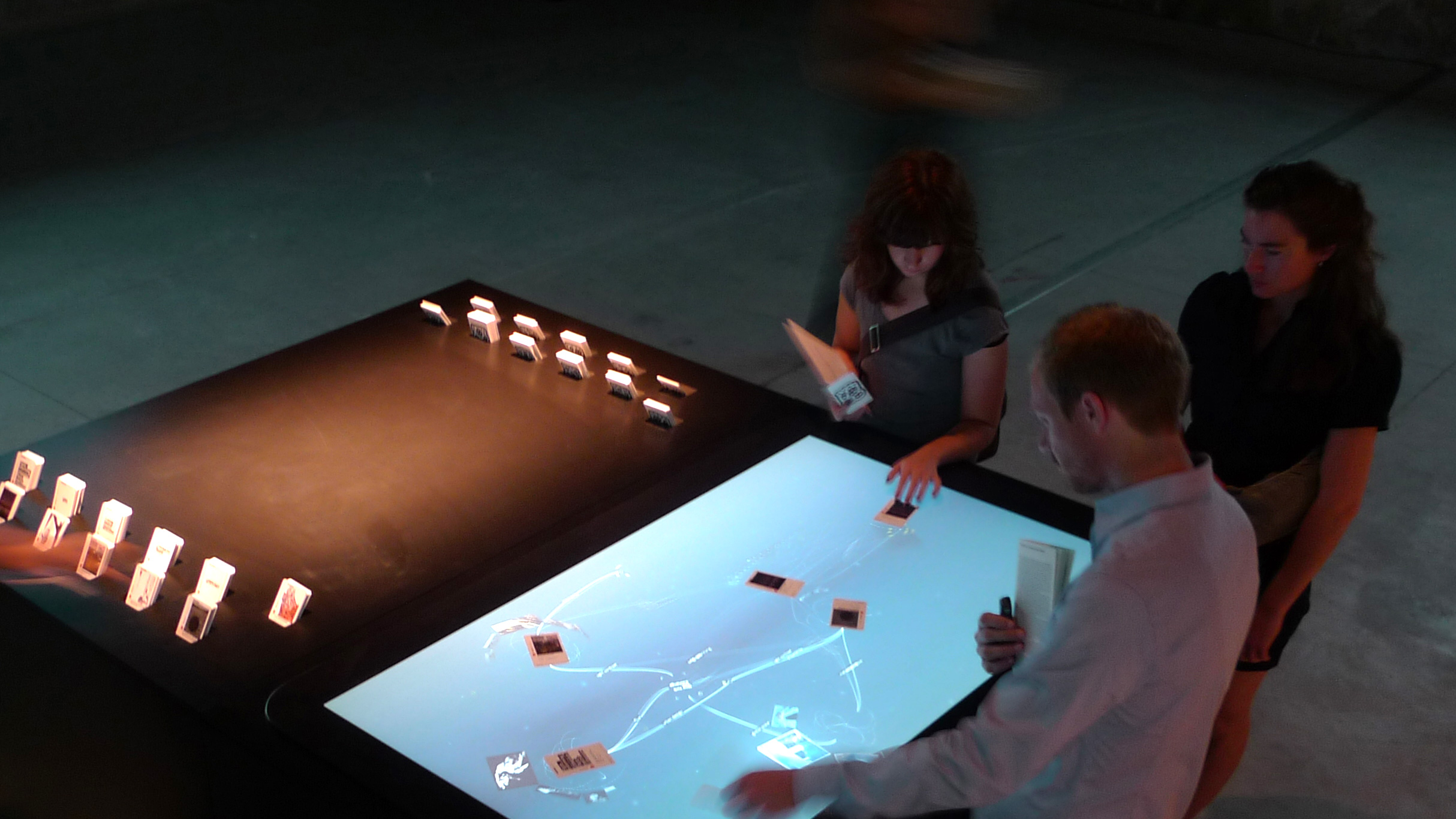 At the Venice Biennale 2008, the mæve installation connects the entries of the EveryVille student competition and puts them into the larger context of MACE content and metadata. By placing physical project cards on an interactive surface, the visitors can explore an organic network of projects, people and media. mæve has been designed and developed by a team of students and researchers under the lead of Prof. Boris Müller and Till Nagel. I initiated the project, consulted the design and development team, and realized the side projections.