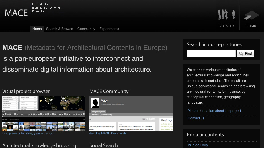 MACE (Metadata for Architectural Contents in Europe) was a pan-european initiative to interconnect and disseminate digital information about architecture. In this ambitious research project, I had a central role in designing the user interfaces and data visualizations developed over the course of the project.