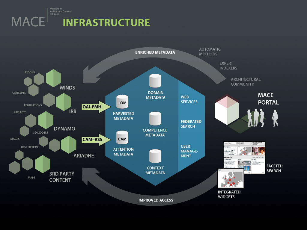 The project connects various repositories of architectural knowledge and enriches their contents with metadata. The result are unique services for searching and browsing architectural contents, for instance, by conceptual connection, geography, language.
