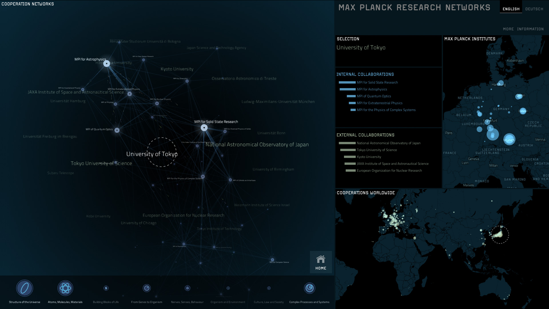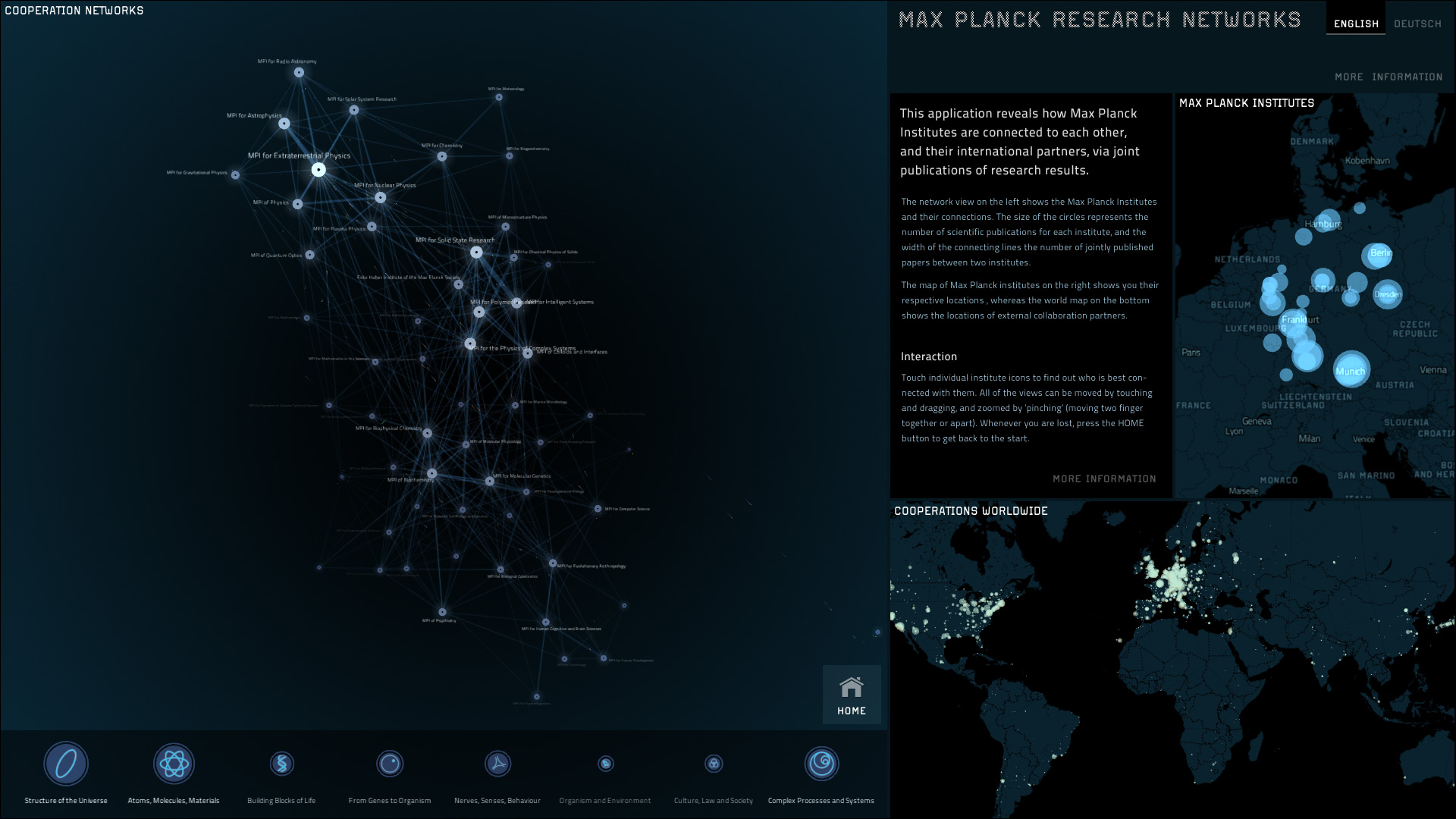 This multi-touch installation reveals how Max Planck Institutes collaborate with each other, and with their international partners. This high-end data visualization is on display at the Max Planck Science Gallery, an ambitious interactive exhibition space presenting new forms of science communication in Berlin.