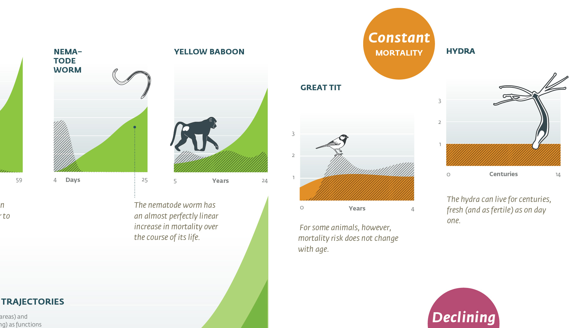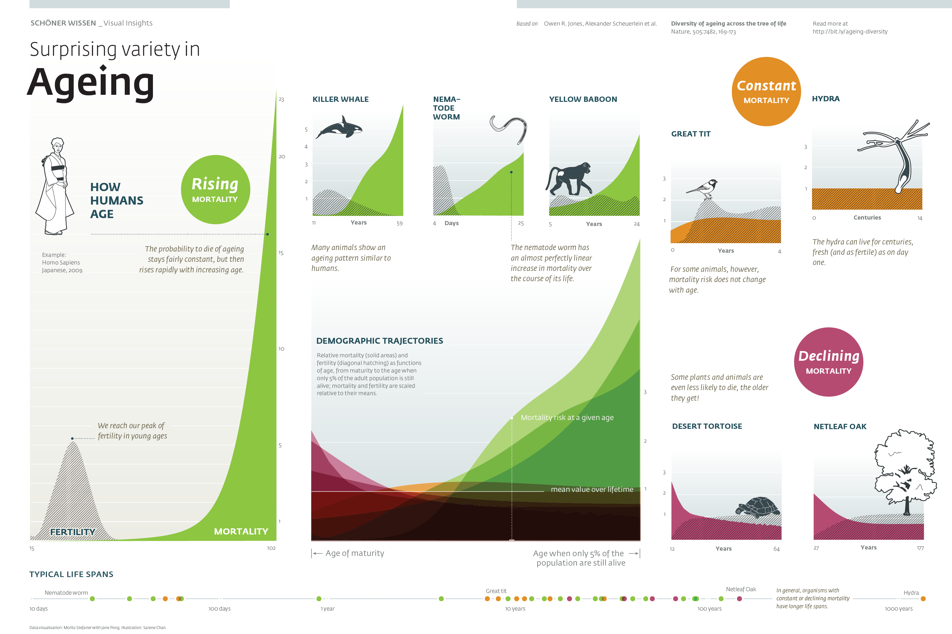 The graphic highlights an interesting finding, as described in the Nature paper "Diversity of ageing across the tree of life": Not all living beings have the development of mortality (i.e. the probability to die of ageing) over the course of their life. While for humans, it becomes more and more likely to die the older they get, some animals and plants have the opposite curve — they get actually less likely to die, the older they become. The graphic highlights this surprising fact and shows a few of the most characteristic curves.