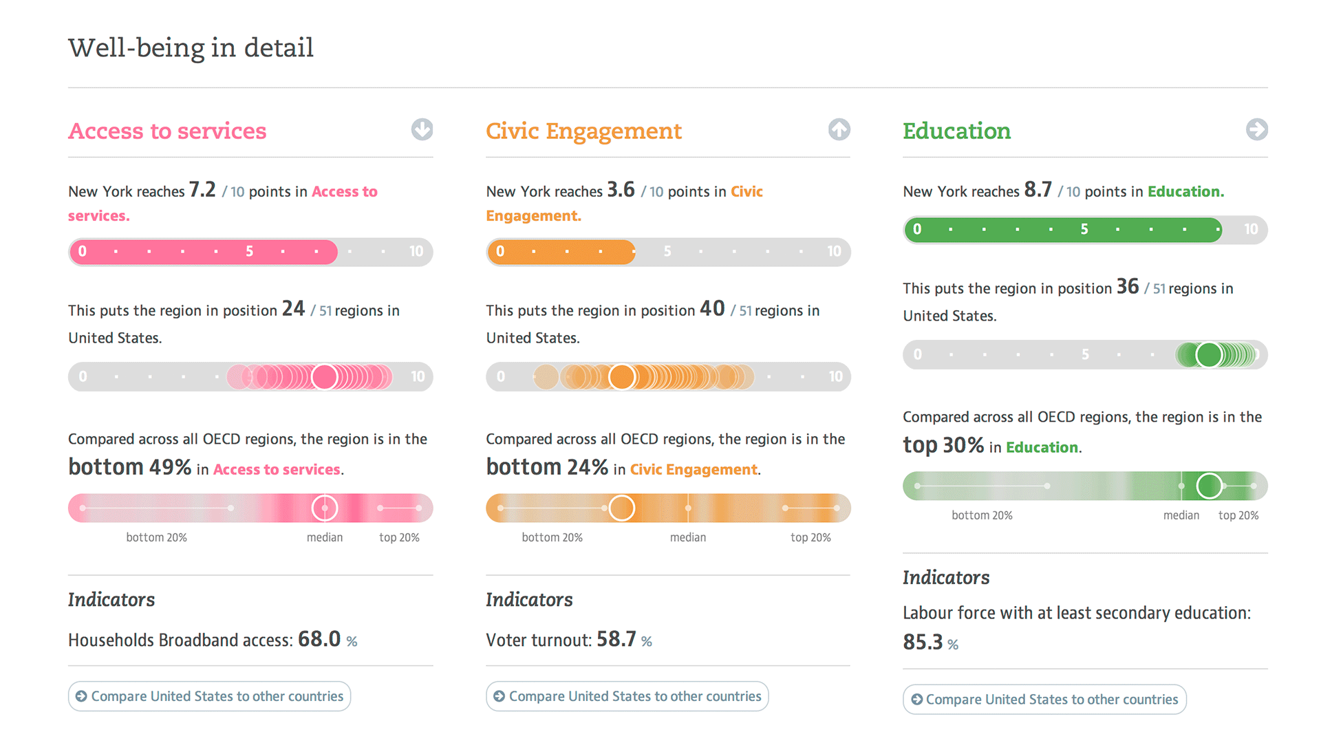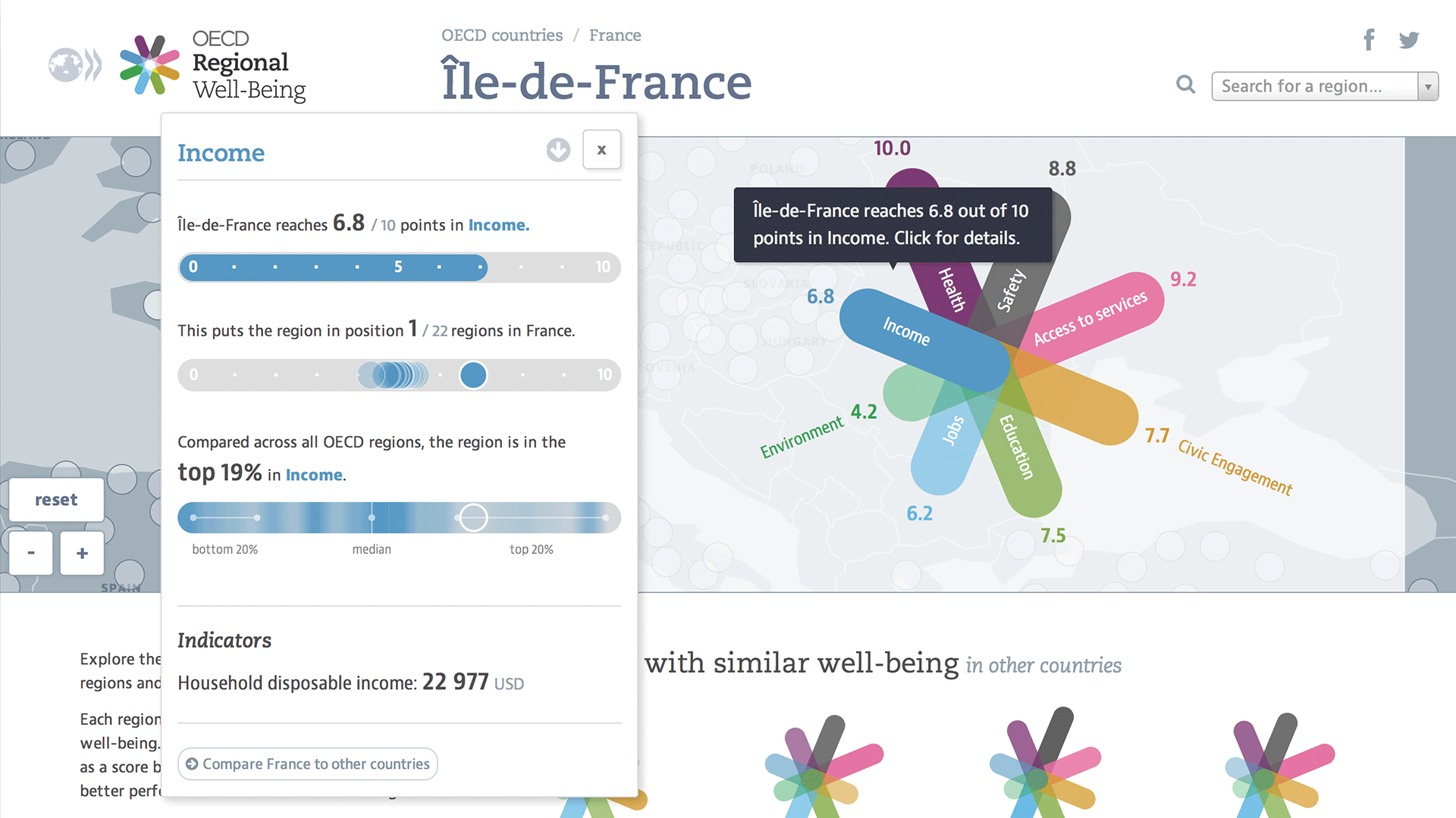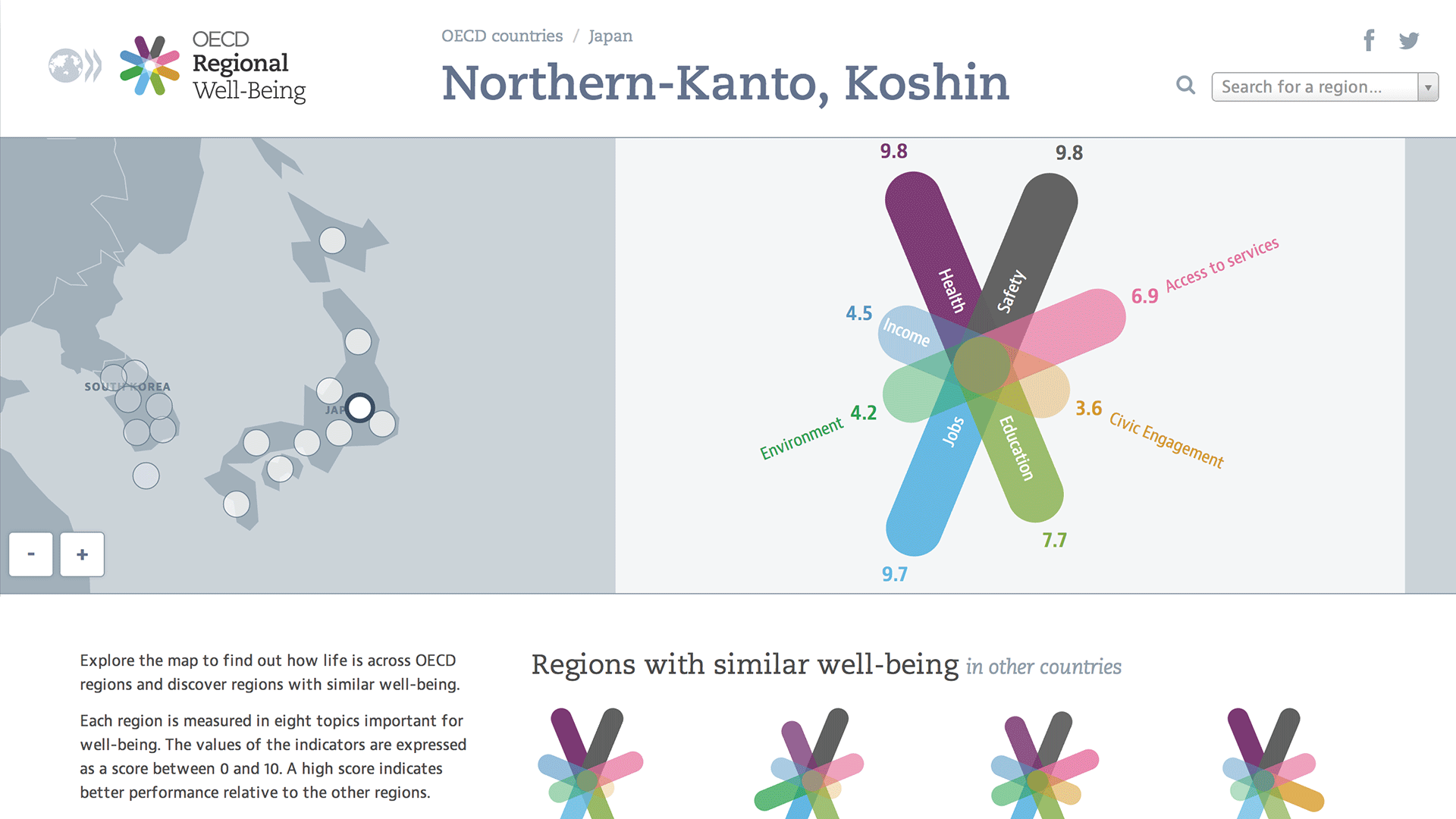Reflecting your own region in context provides a natural starting point for further explorations. One particular option we offer is the “Regions with similar well-being” section, which suggests regions with similar indiator values all over the world. Who knew that Texas and Scotland are actually not that far apart, when it comes to well-being (well, except for the Safety aspect)? Or that Berlin has a similar profile as Alsace?