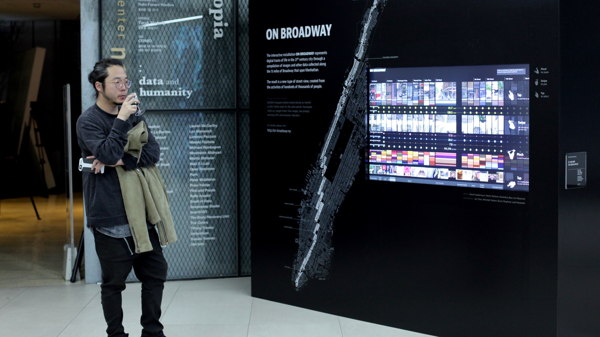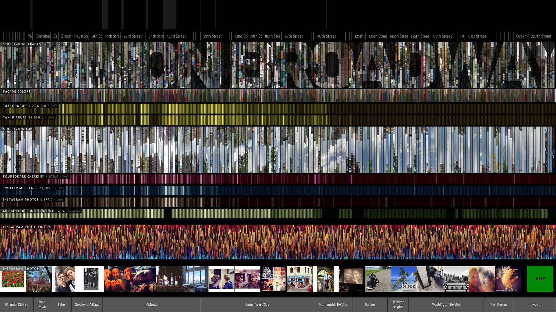 This interactive installation represents life in the 21st-century city through a compilation of images and data collected along the 13 miles of Broadway that span Manhattan. The result is a new type of city view, created from the activities of hundreds of thousands of people.