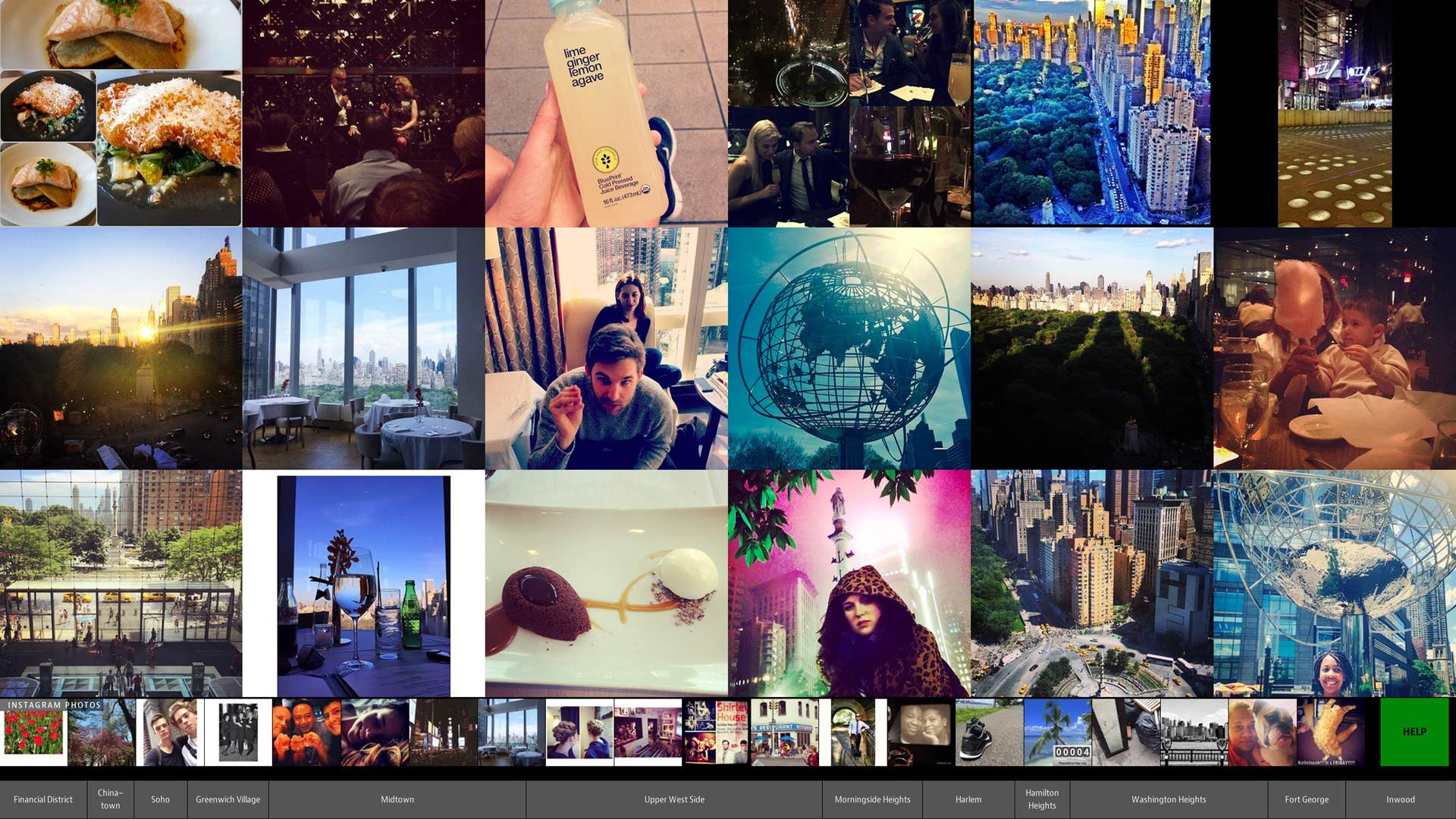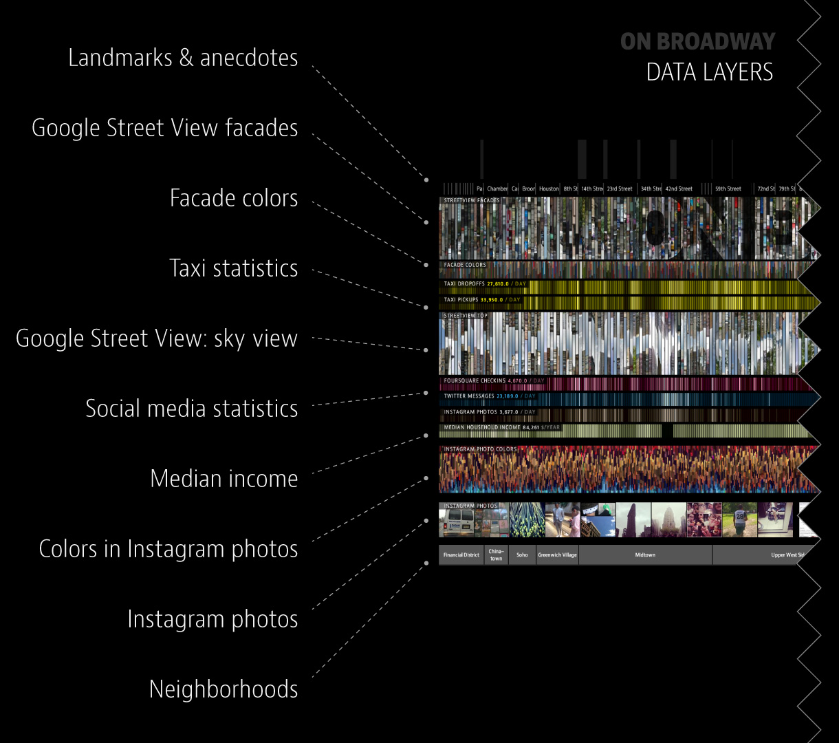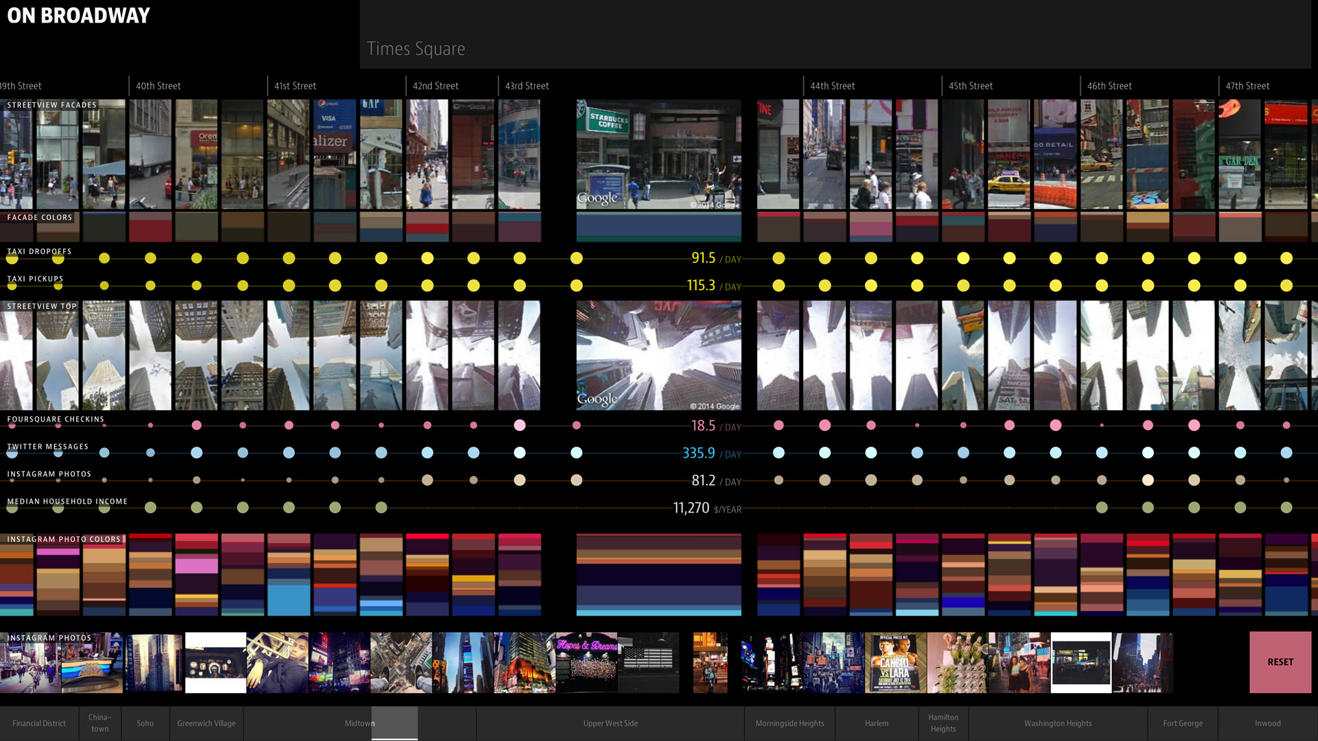 The project proposes a new visual metaphor for thinking about the city: a vertical stack of image and data layers. There are 13 such layers in the project, all aligned to locations along Broadway. As you move along the street, you see a selection of Instagram photos from each area, left, right, and top Google Street View images and extracted top colors from these image sources. We also show average numbers of taxi pickups and drop-offs, Twitter posts with images, and average family income for the parts of the city crossed by Broadway. To help with navigation, we added additional layers showing names of Manhattan neighborhoods crossed by Broadway, cross-streets and landmarks.