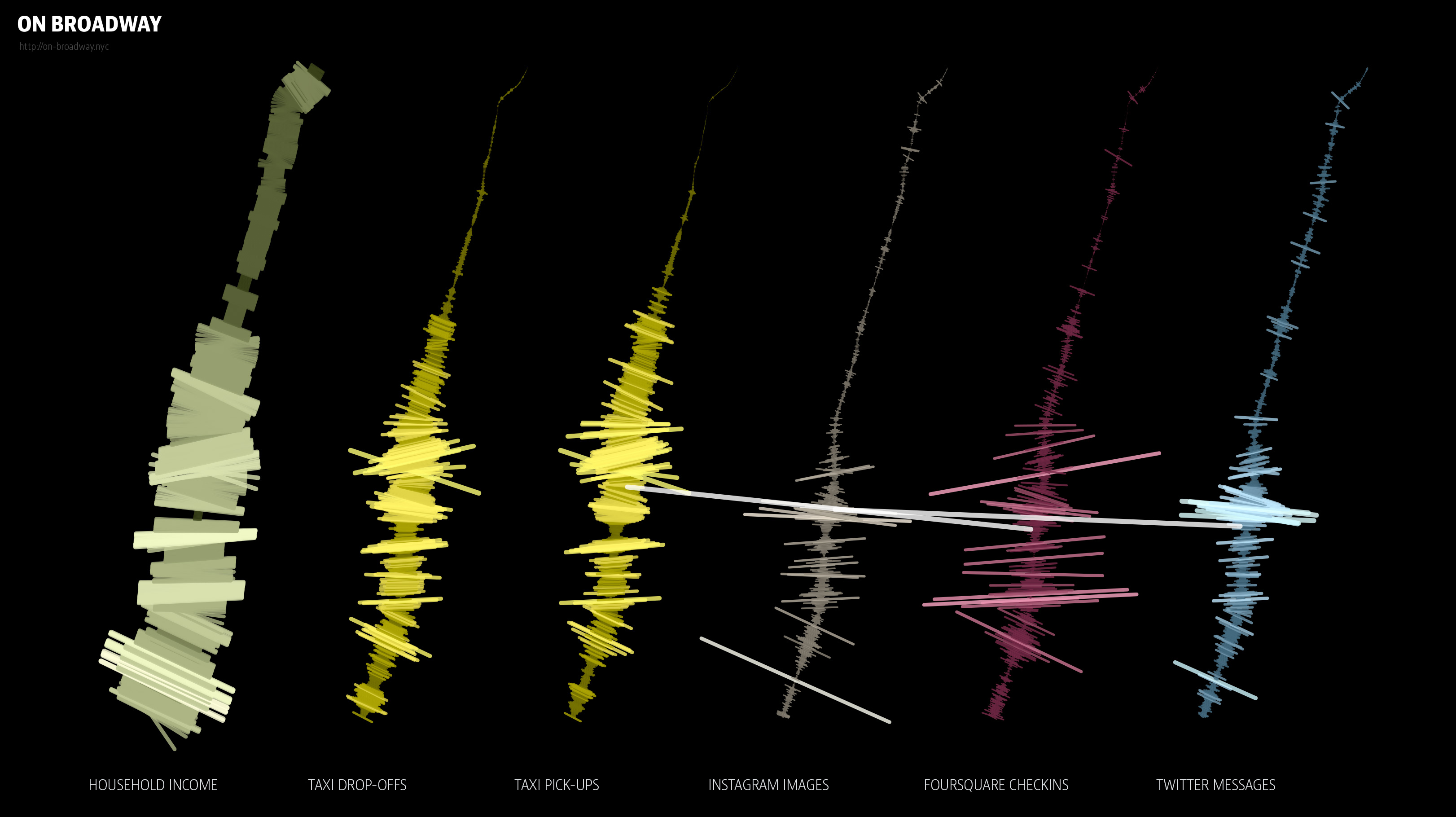On Broadway enables seamless navigation between high-level condensed views of the city and zoomed in, anecdotal data. In the exploratory phase of the project, we experimented a lot with different remixes and montages of the many data and image materials we had available. The final application reflects this enormous data diversity and richness: from taxi rides and median income to color palettes and Twitter messages.