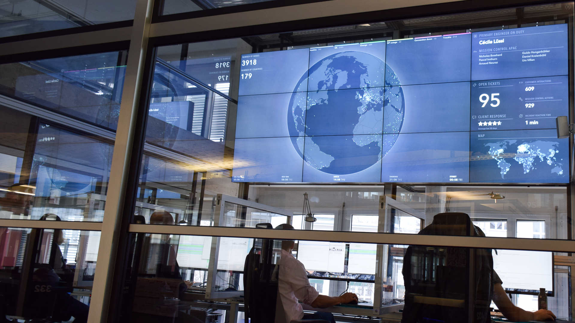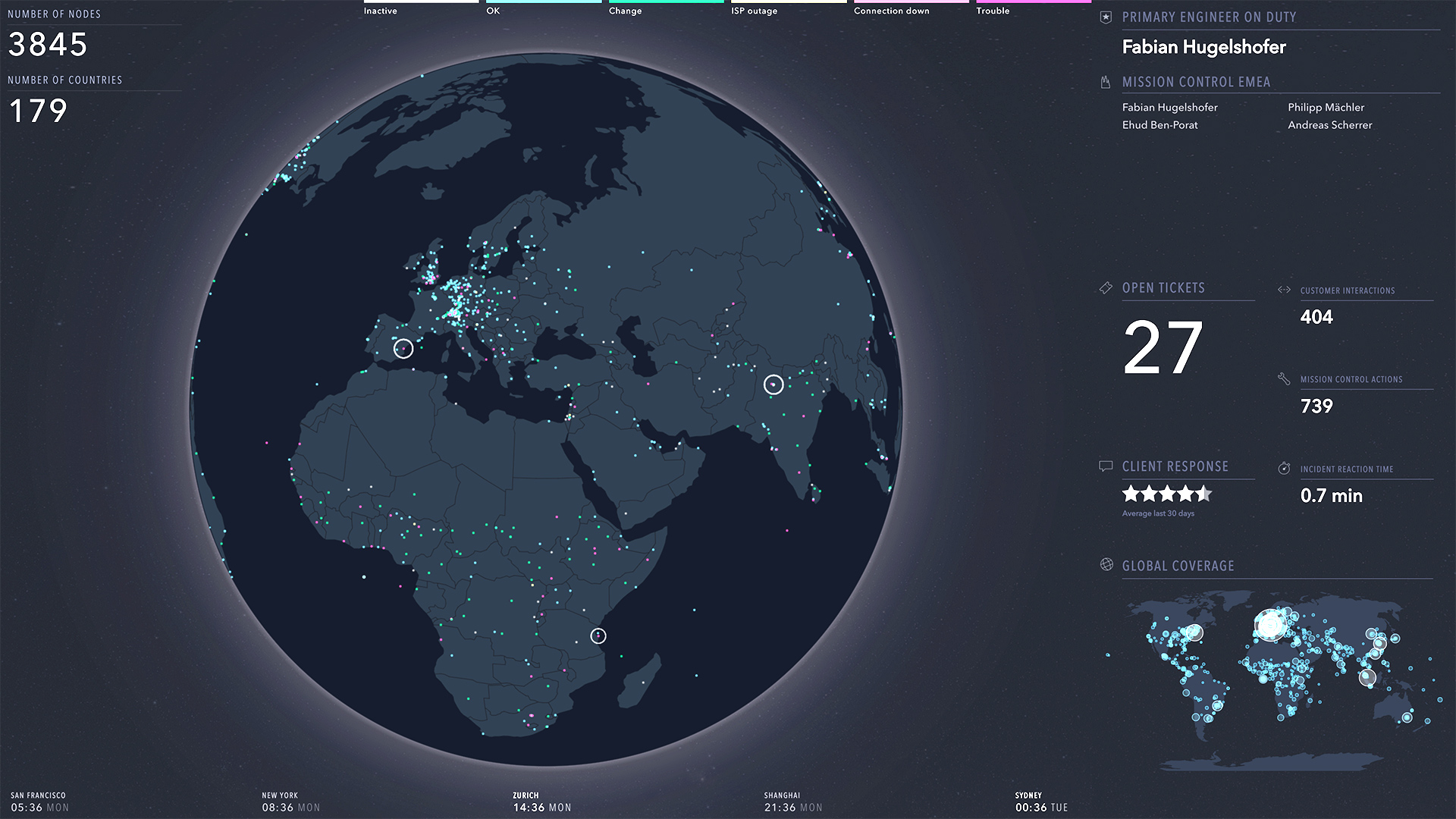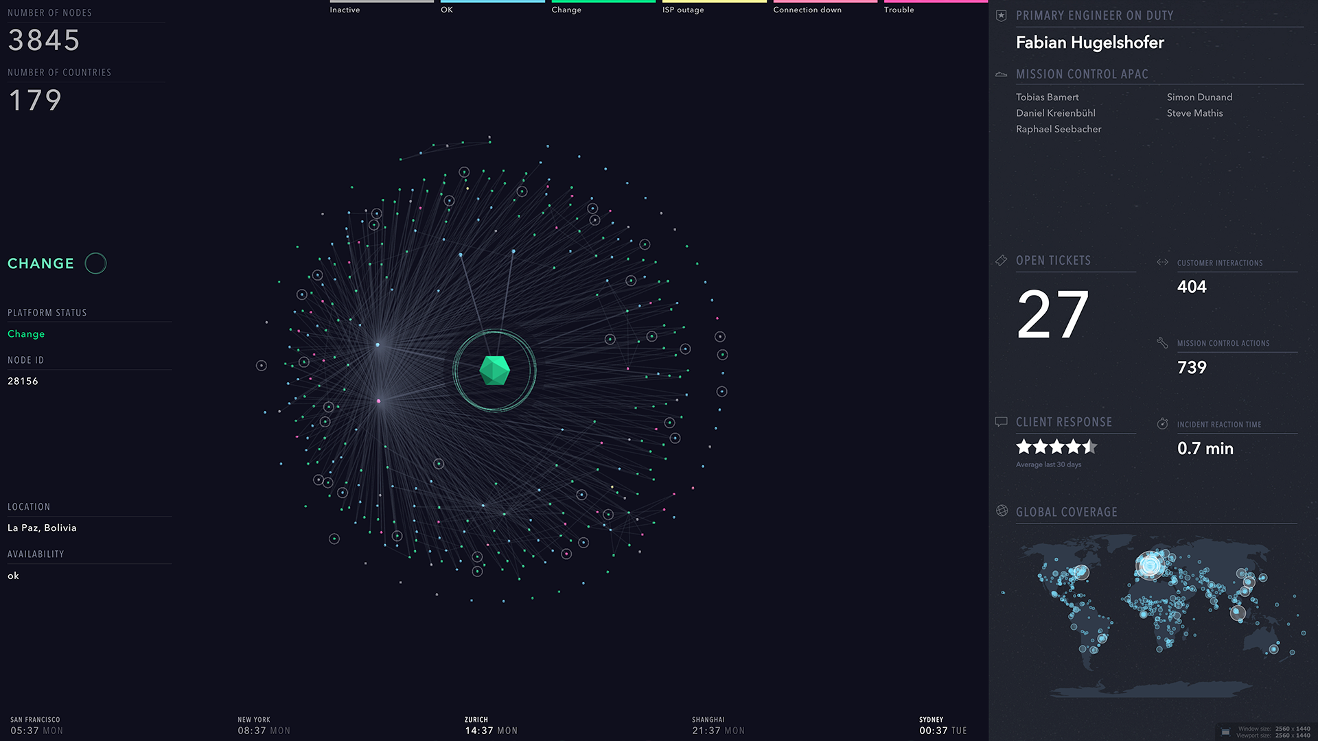 Responsiveness is critical for internet security services. The Open Systems Wall Display provides the Mission Control team with a constant overview and ambient awareness of the vast network of services they run for their clients. Security events, change of server status and configuration rollouts are visualized in real-time on large displays consisting of 12 full HD panels each.