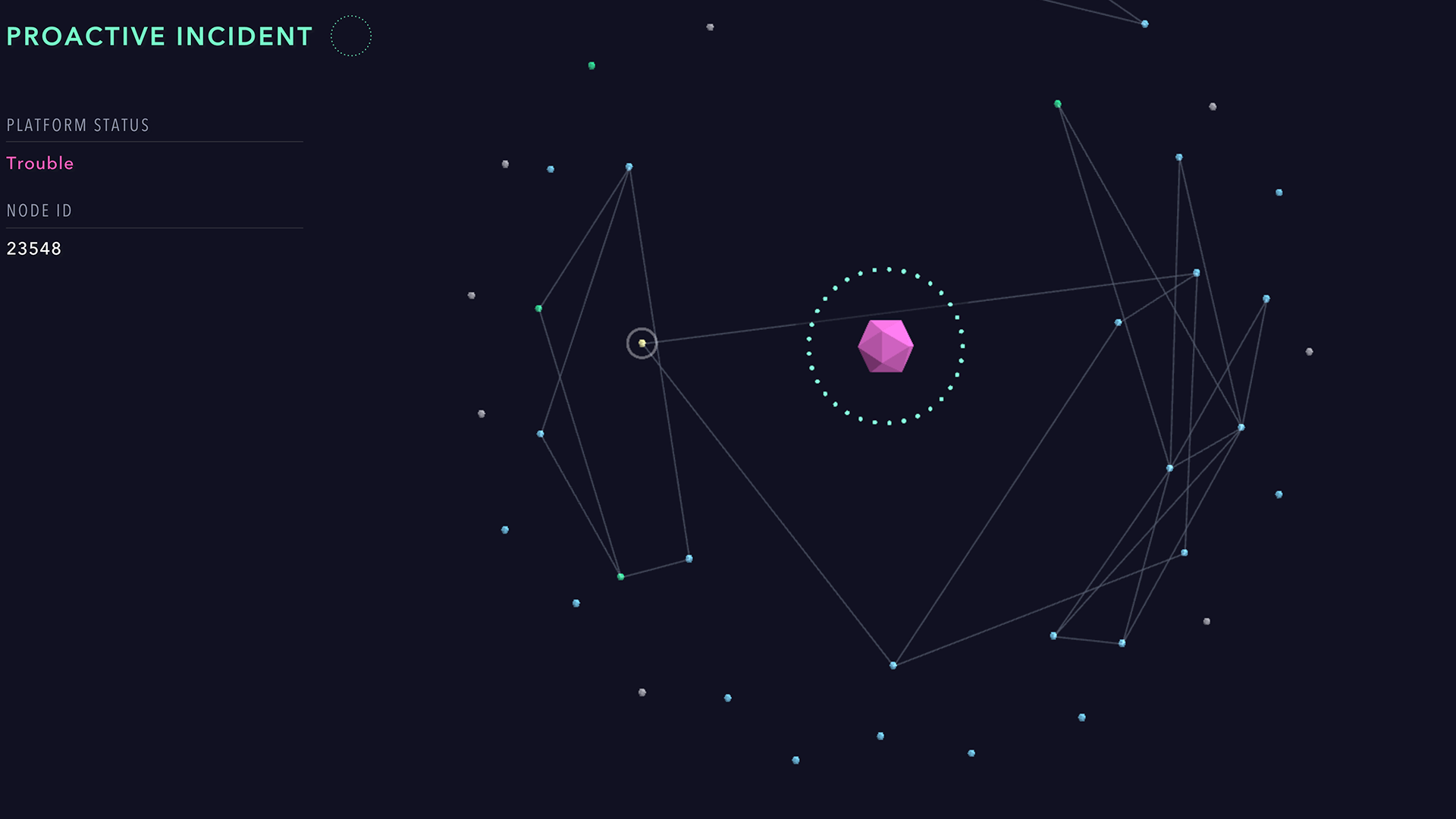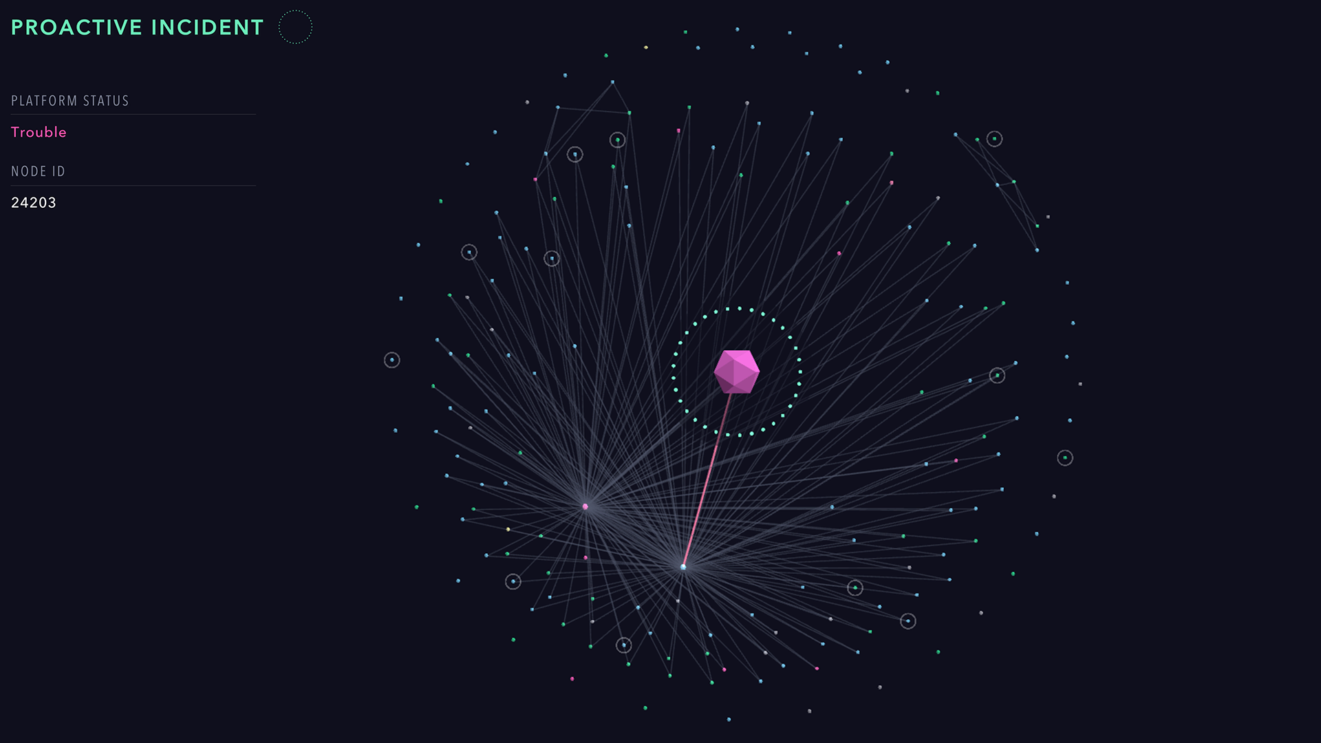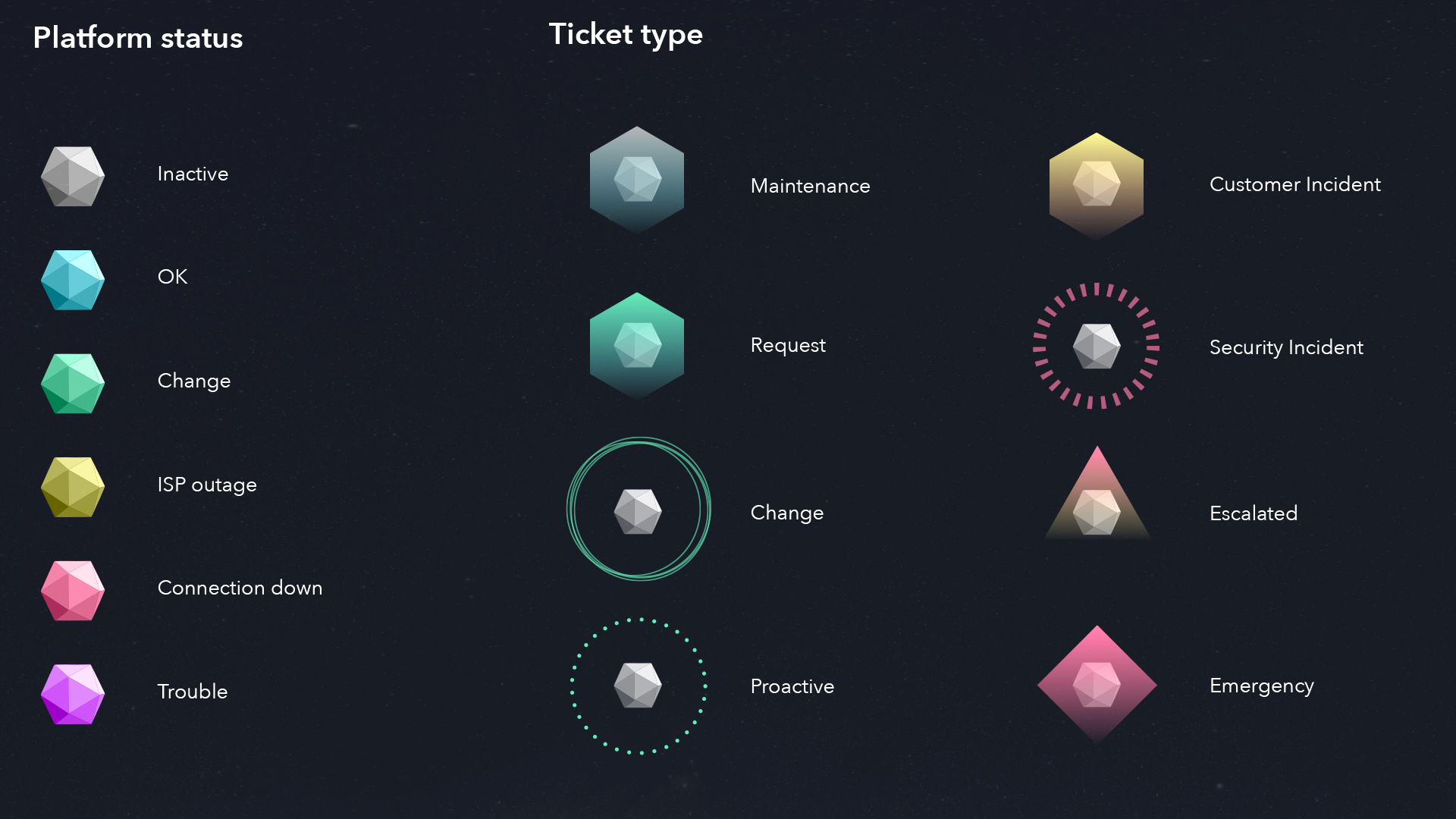 At the heart of the visual design is a visual language which encodes server statuses in color (in an escalating color scale from cool to hot) and activities (such as patches, fixes, alerts) as external shell or particle elements around the server symbol. These two language elements can be used in isolation or combined, in a variety of sizes and situations.