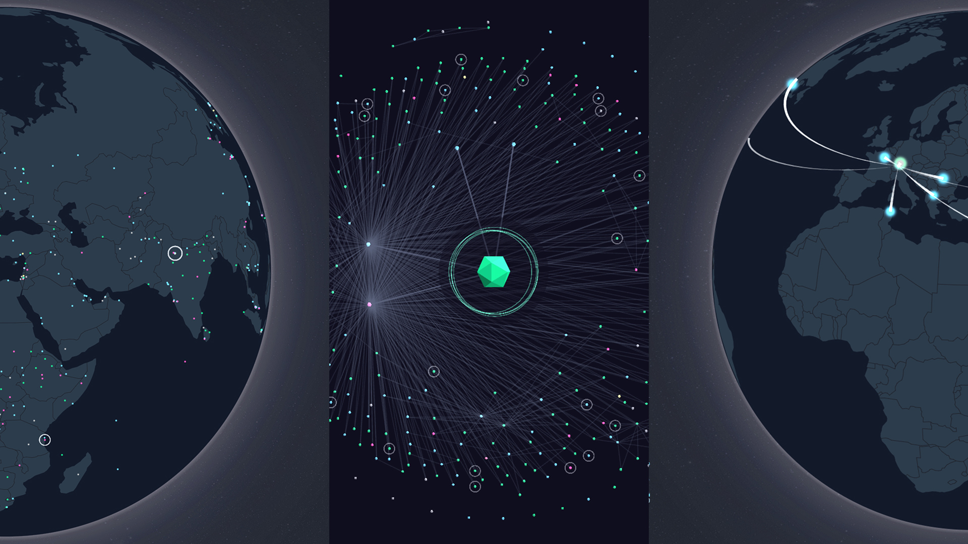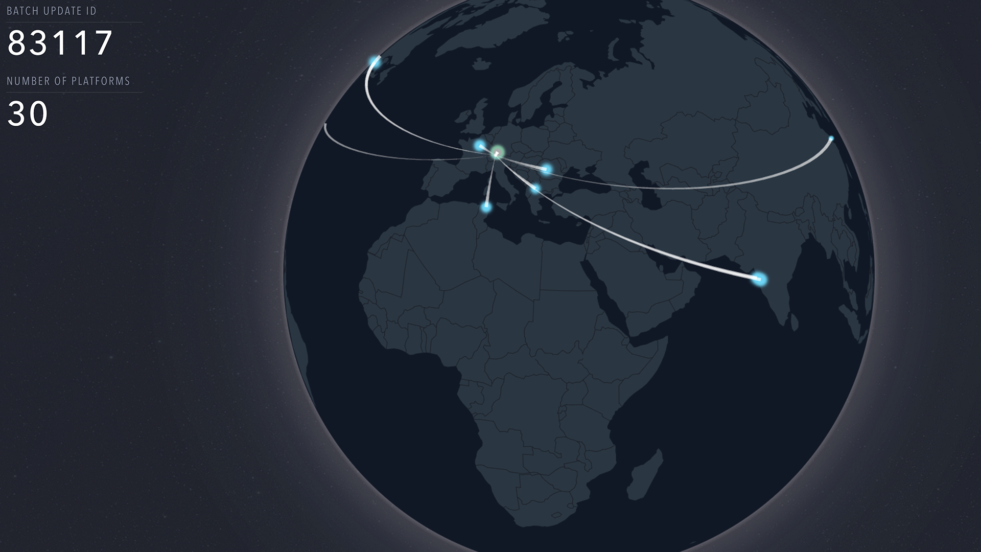 In the animation sequencing, special emphasis was put on finding a good automatic selection of view successions and "trip planning" around the world. The priority queue takes urgency, novelty, type, travel distance and other parameters into account, in order to select the next — most relevant — focus. Each sequence has slightly variable parameters (such as durations, zoom levels, …) to keep the animations interesting also after repeated watching.