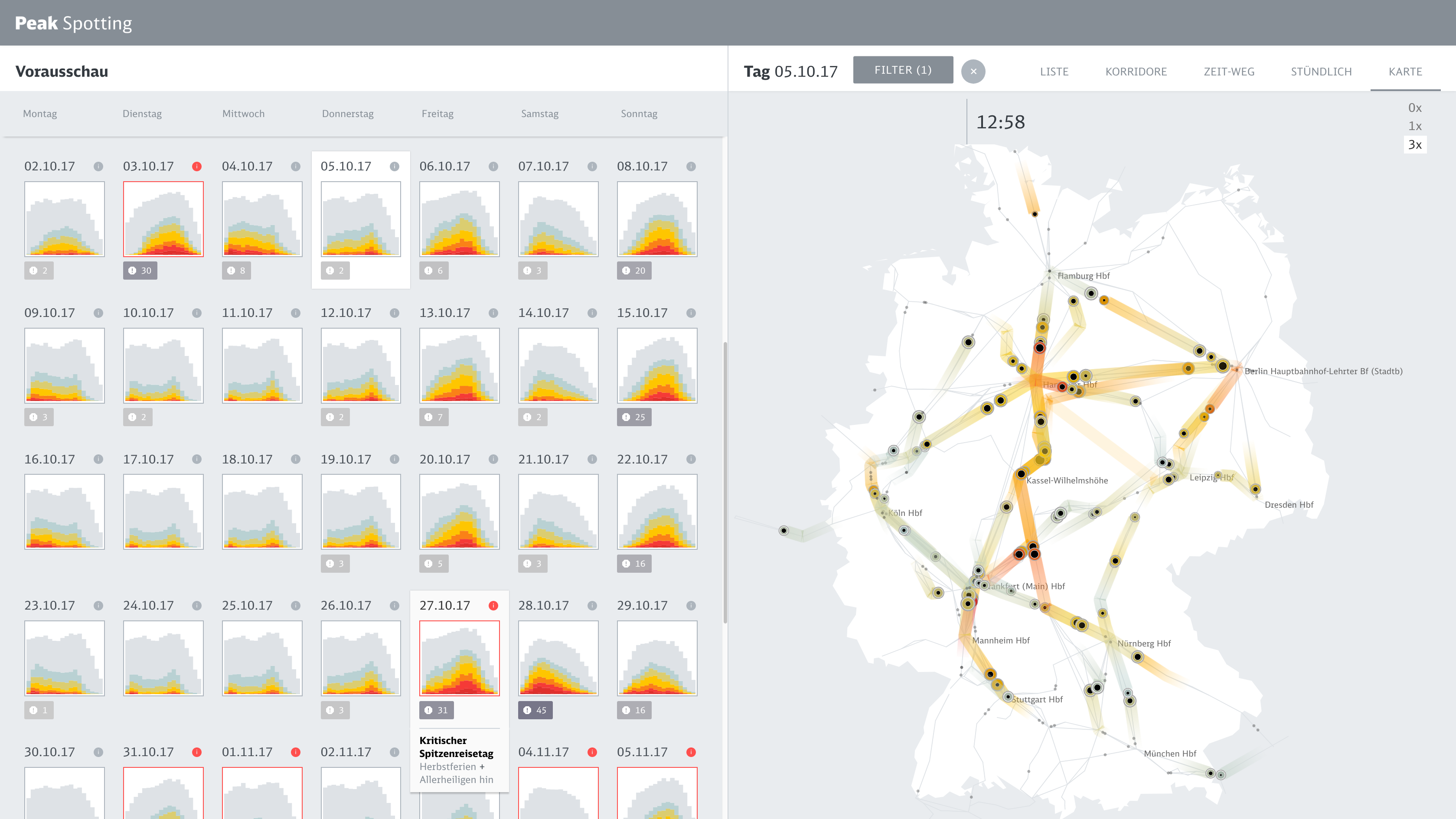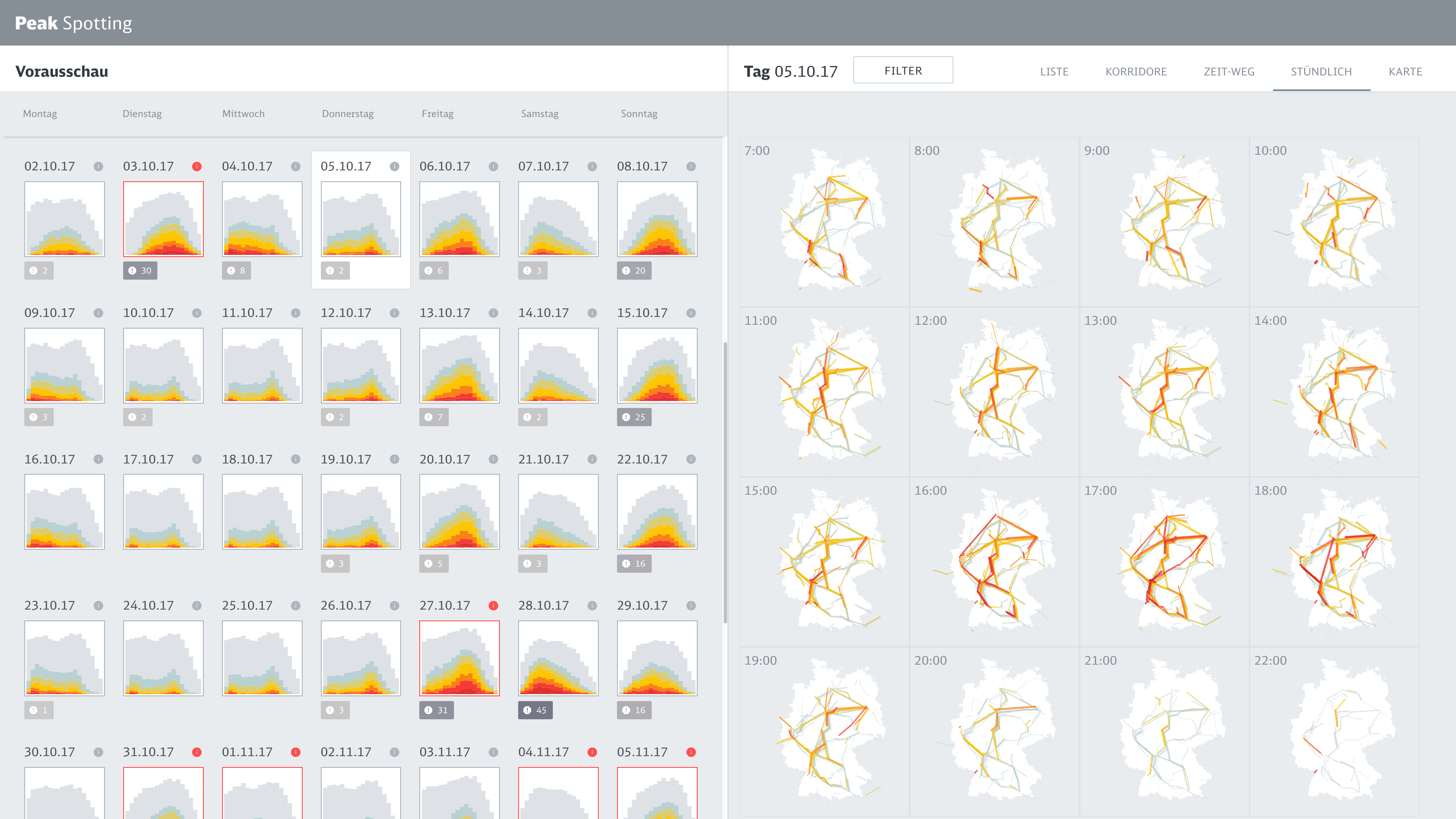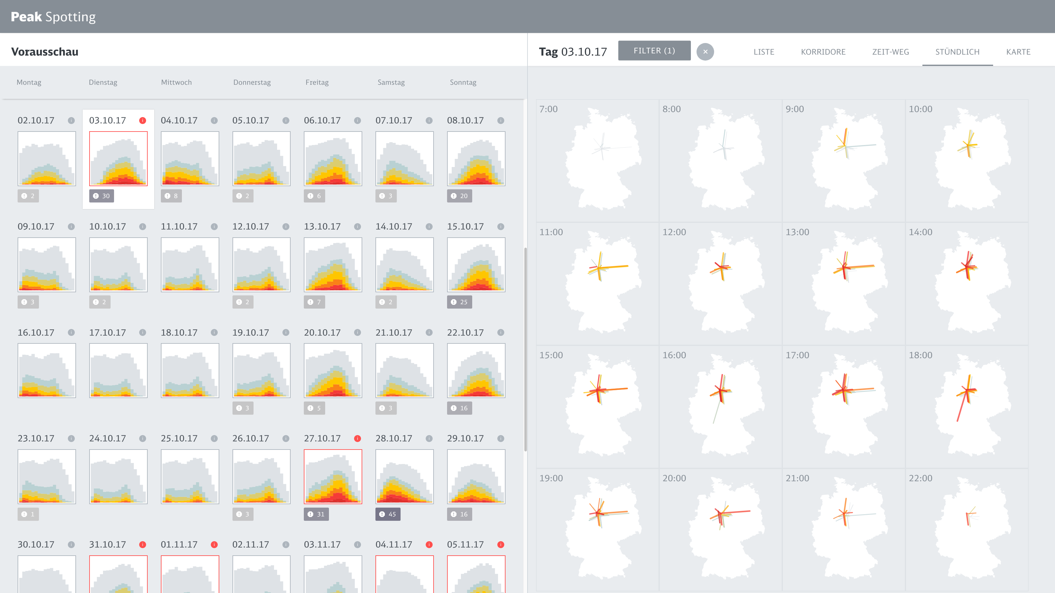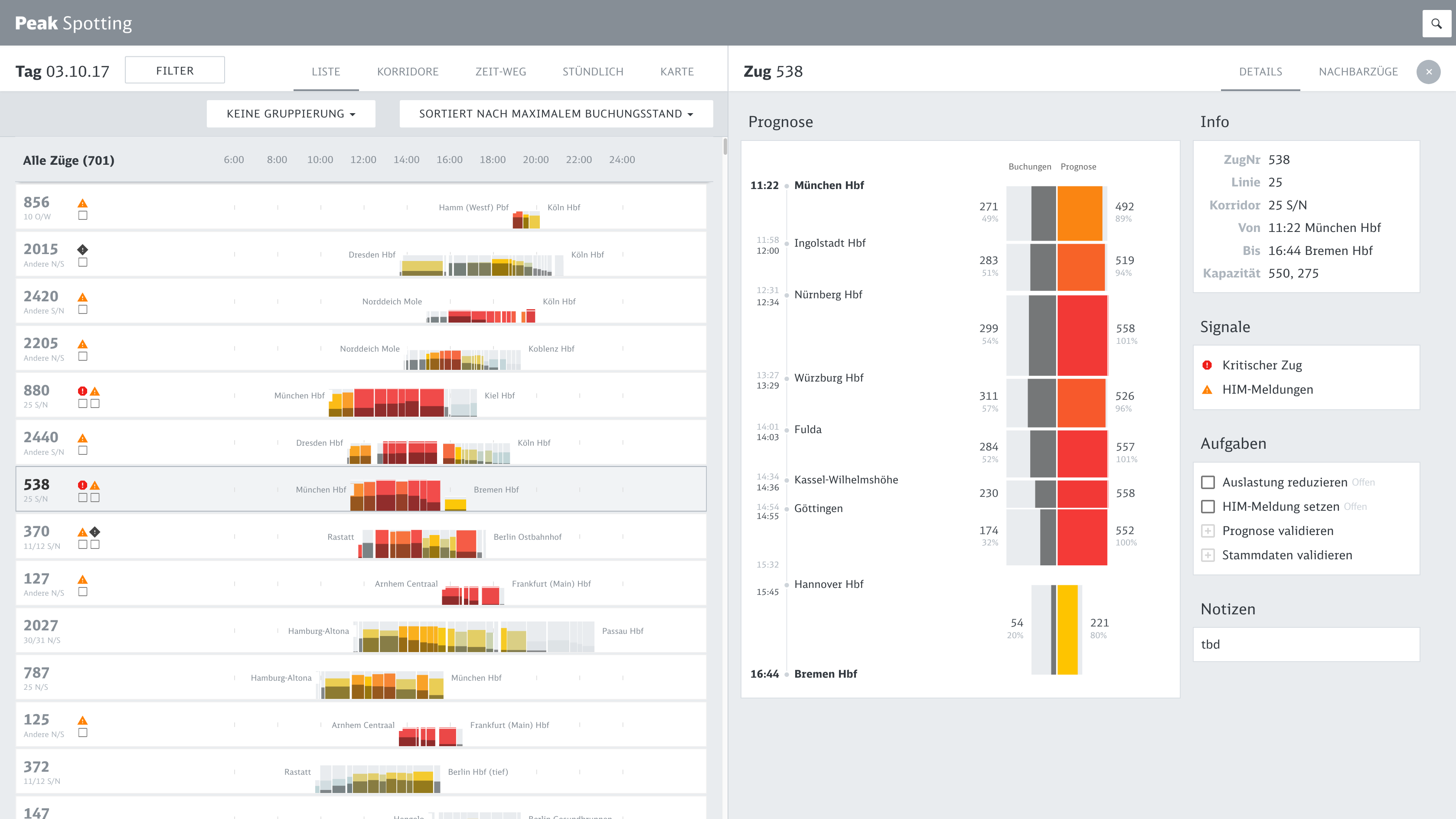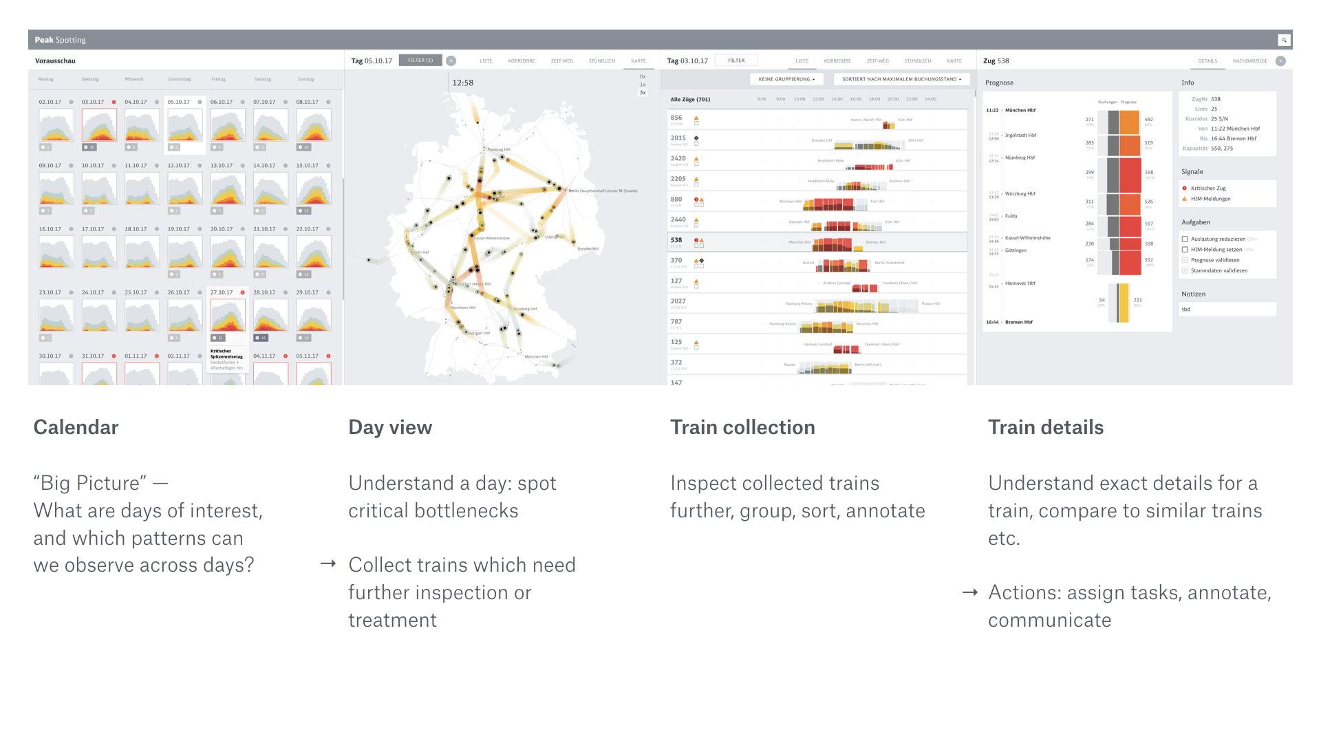 Based on a coherent visual language which maps important dimensions like actual bookings or prognosis values to meaningful visual dimensions, we developed a variety of data perspectives to allow planers to spot and isolate critical bottlenecks and tricky traffic situations.