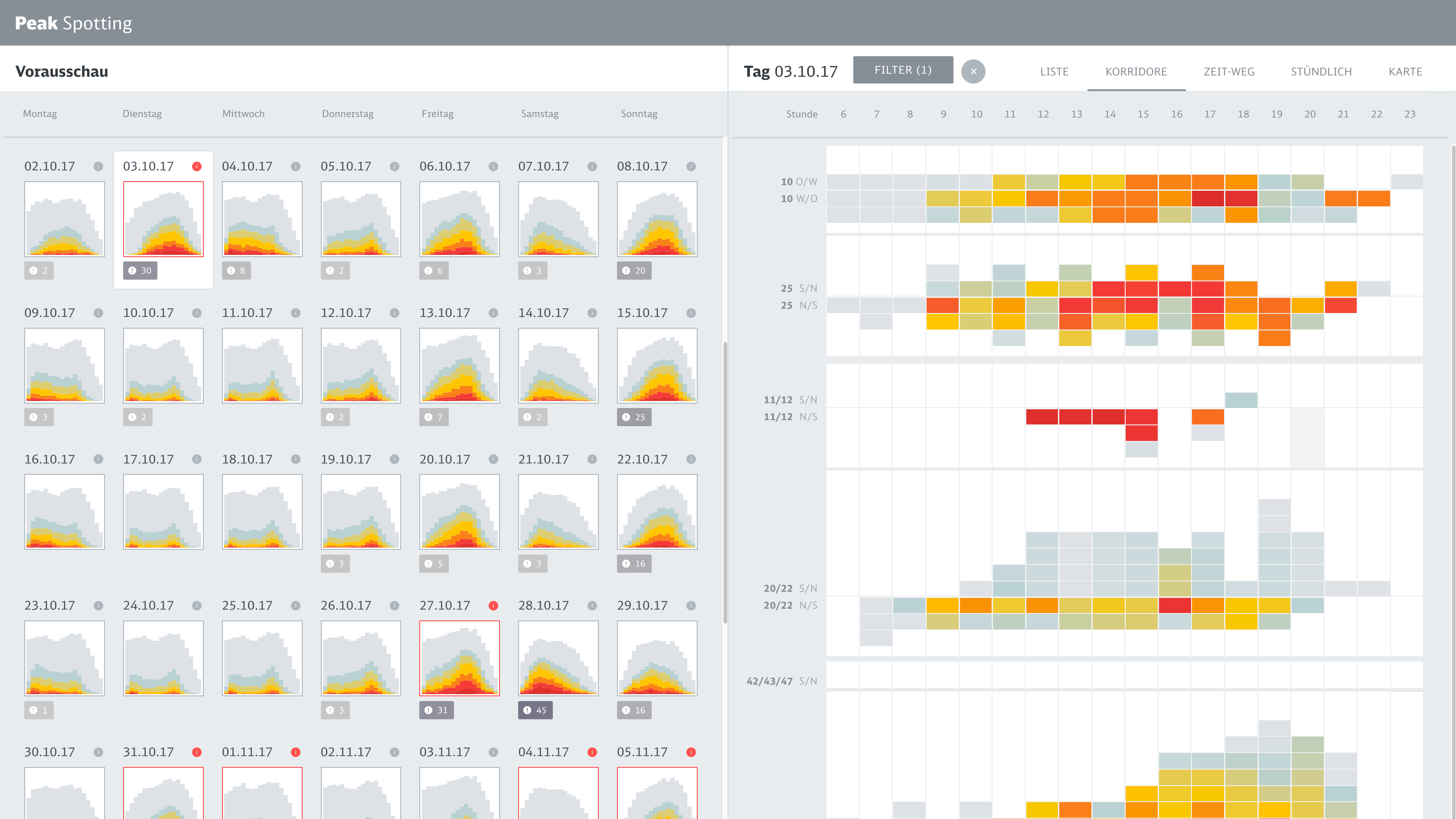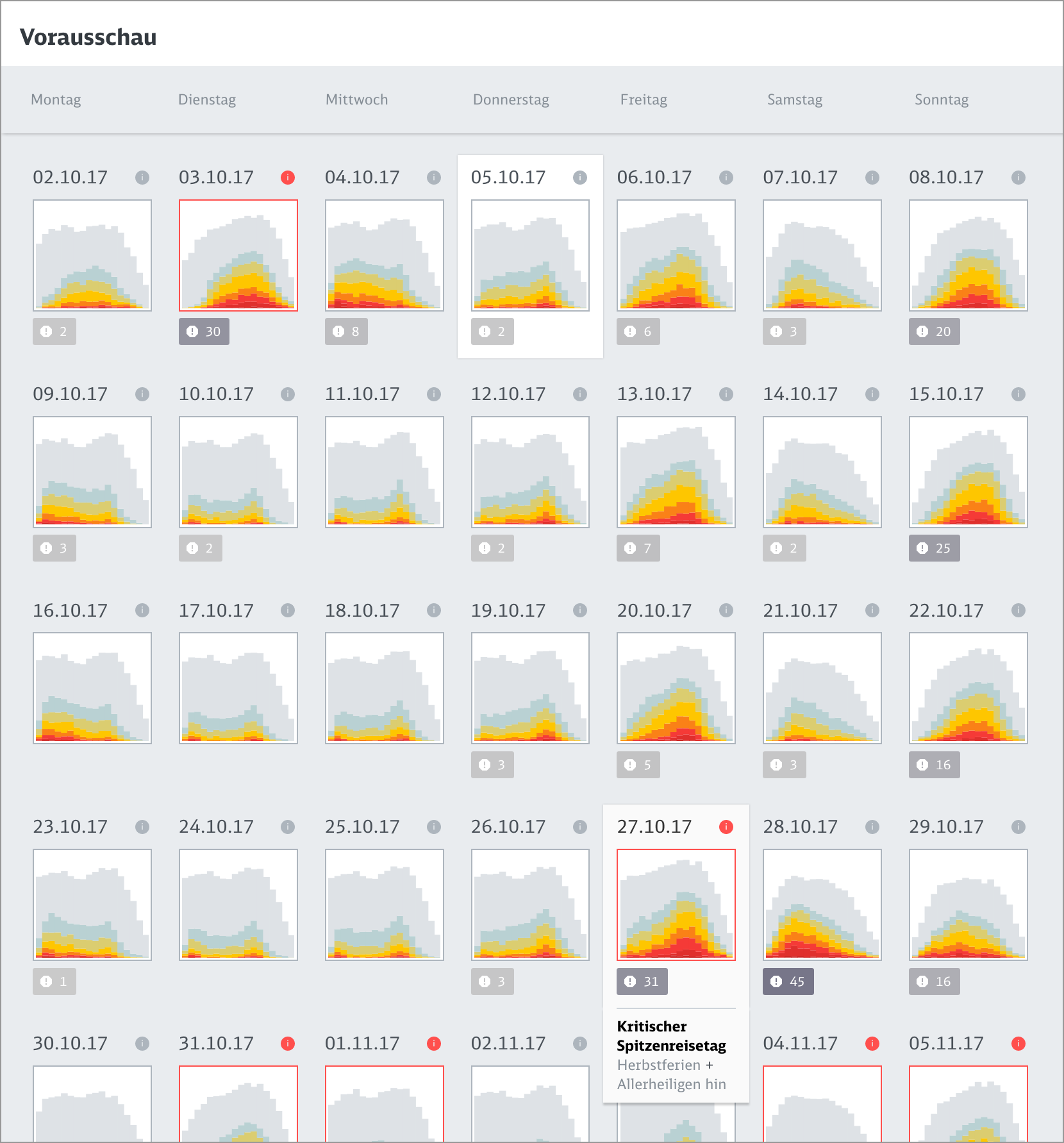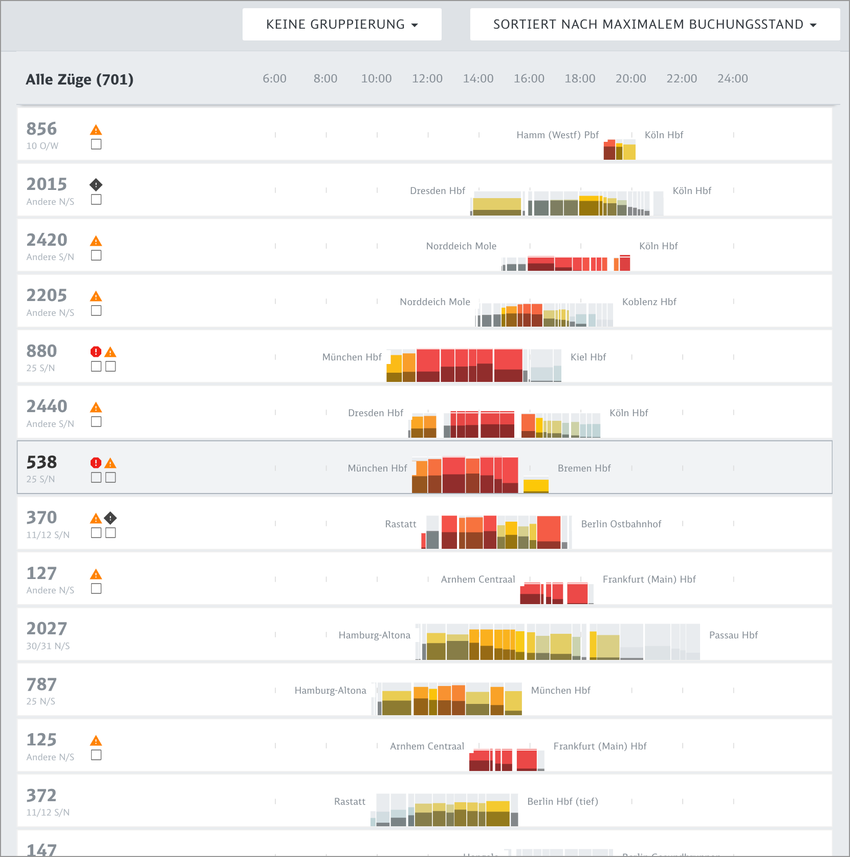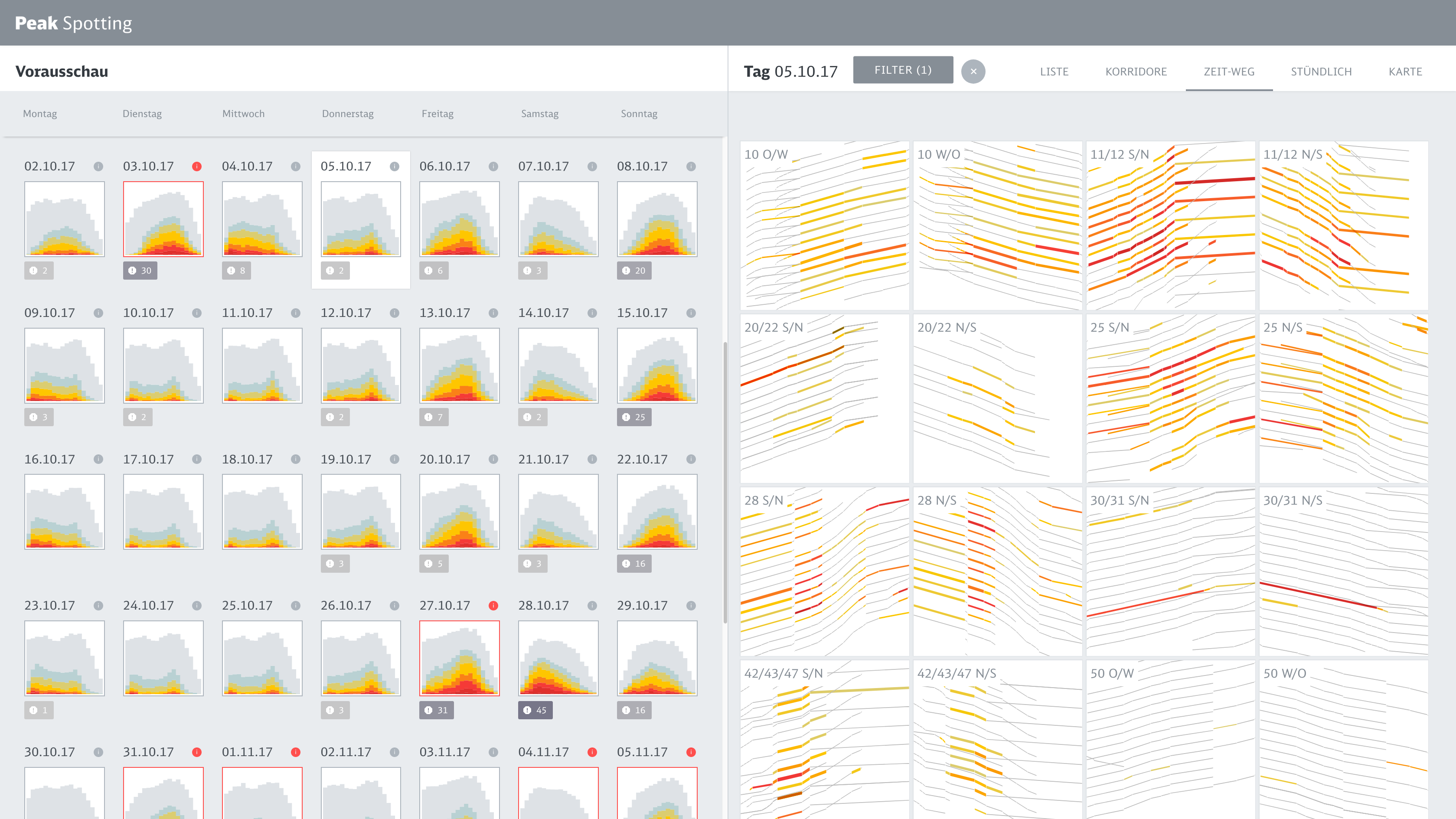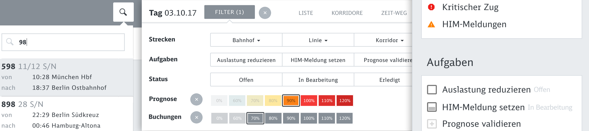 Based on a coherent visual language which maps important dimensions like actual bookings or prognosis values to meaningful visual dimensions, we developed a variety of data perspectives to allow planers to spot and isolate critical bottlenecks and tricky traffic situations.