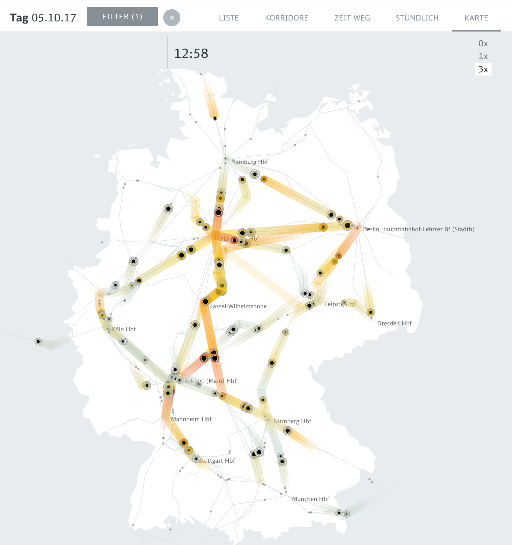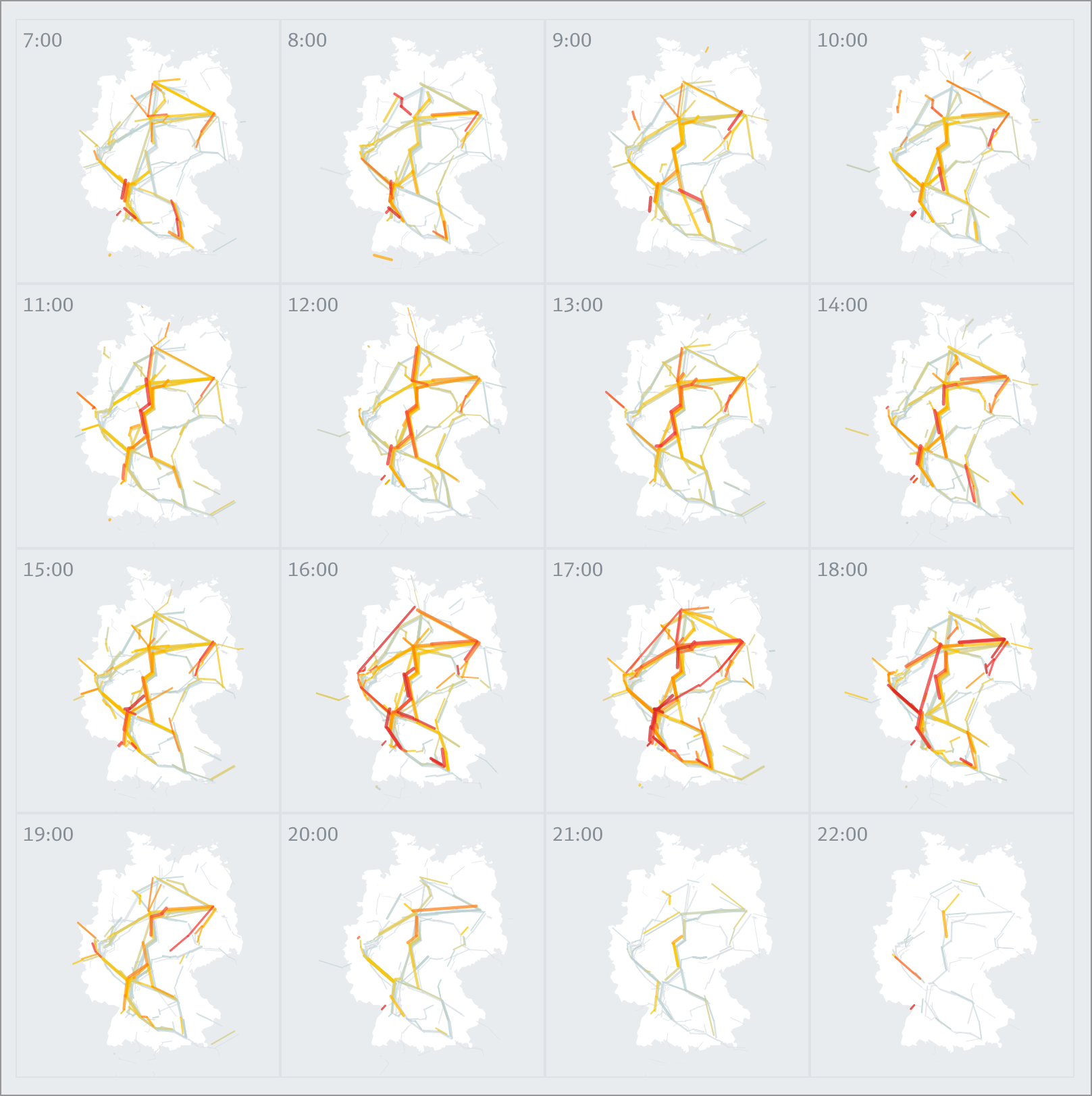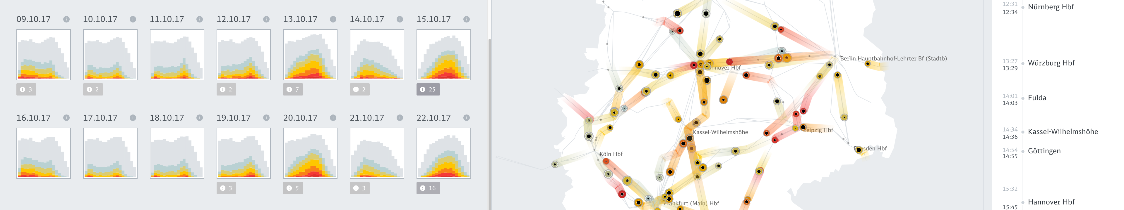 Based on passenger load predictions from neural nets and random forest models, the web application integrates millions of datapoints over 100 days into the future, allowing to inspect the data on custom developed visual tools such as animated maps, stacked histograms, path-time-diagrams and powerful lists with miniature visualizations.