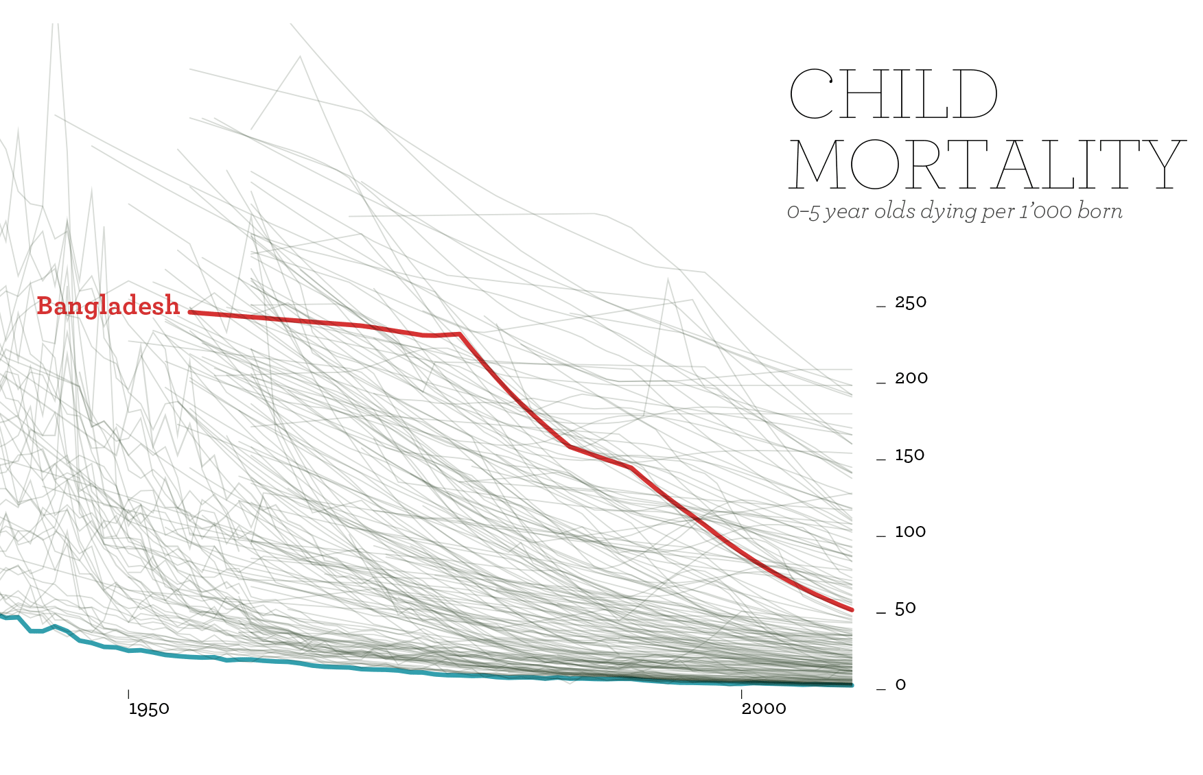 This chart dramatically shows how Bangladesh manages to reduce its child mortality with a rate faster than Sweden ever did. In the background, the mortality rates of all countries are plotted in light grey lines, in order to provide a sense of the density and distribution of the data over the years. Note how measurements seem to fluctuate strongly before the 1950s.