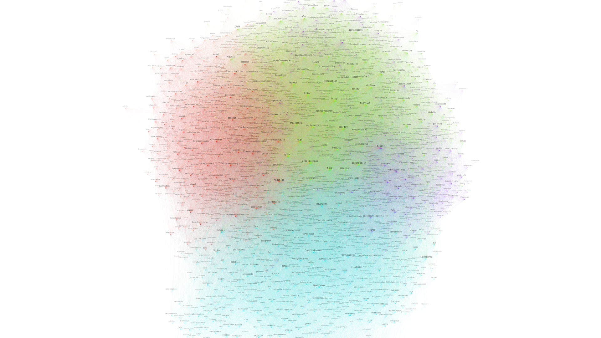 This map shows a selection of 2114 Twitter accounts related to the resonate festival and their 175’380 followership relations. We collected all Twitter users that are followed by a list of seed accounts (festival speakers, organizers and attendees). This map presents a selection of users that are followed by at least 8 people in this extended network. The size of each username corresponds to the number of followers in this network. The layout attempts to minimize link lengths; consequently, nodes that share a lot of links are placed next to each other. Each node is assigned a color depending on an automatic clustering algorithm. Each link represents followership and is colored depending on the source node (the follower).