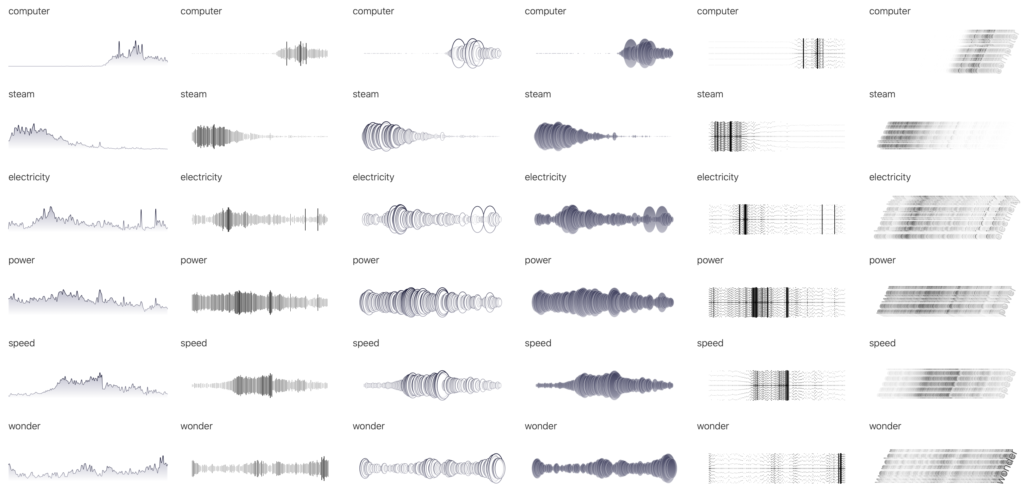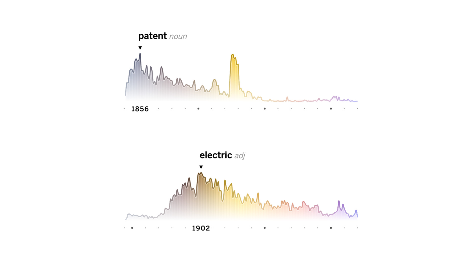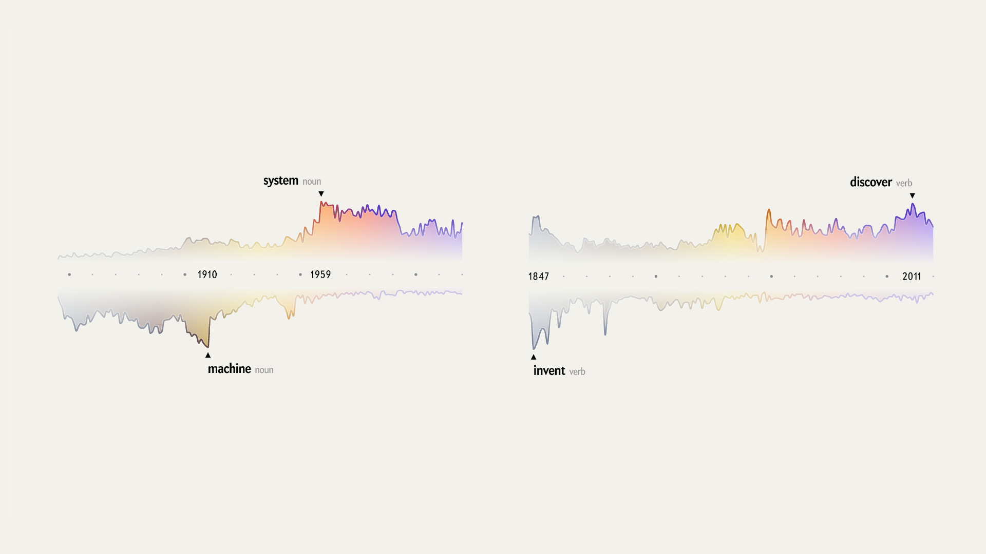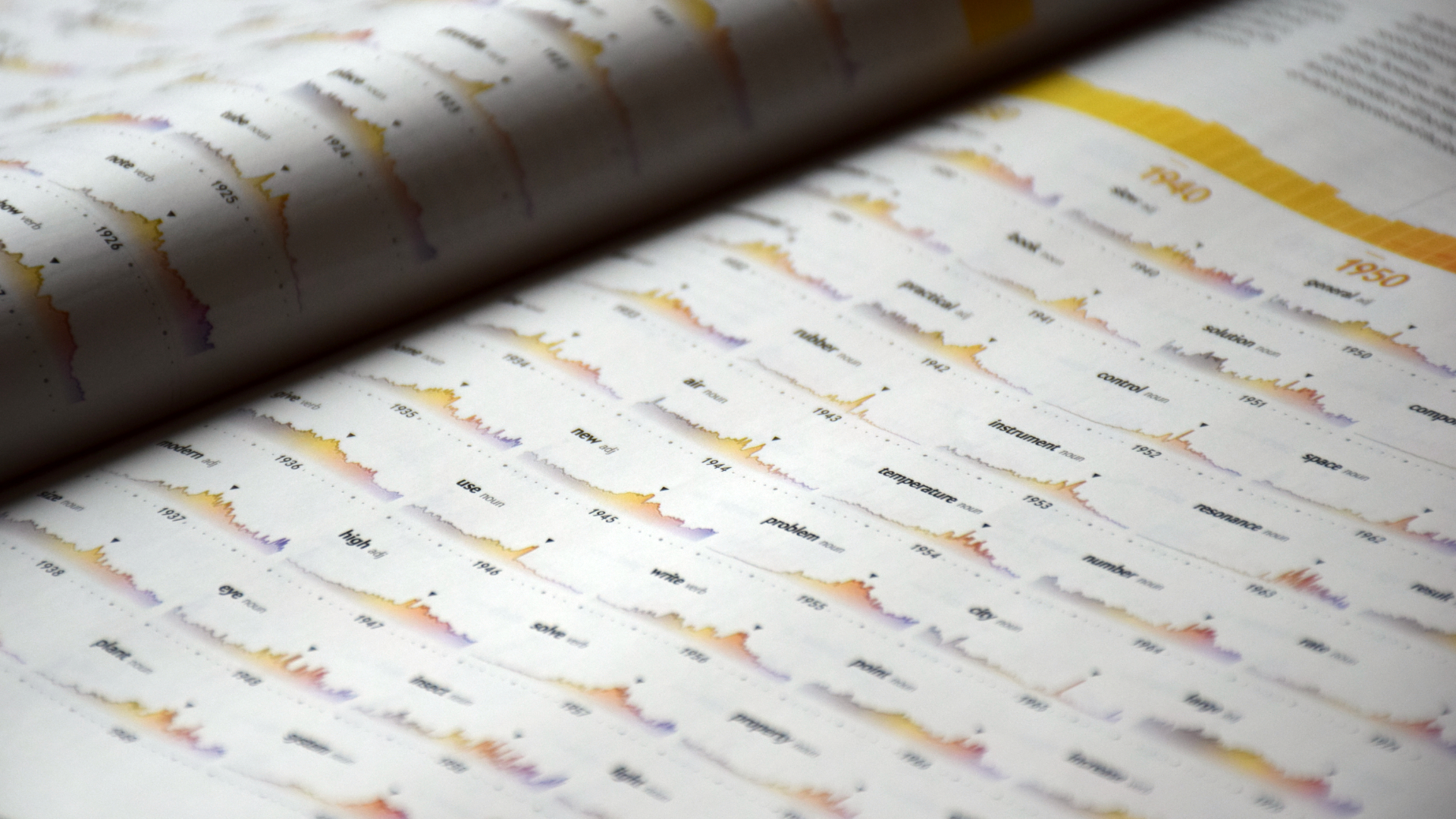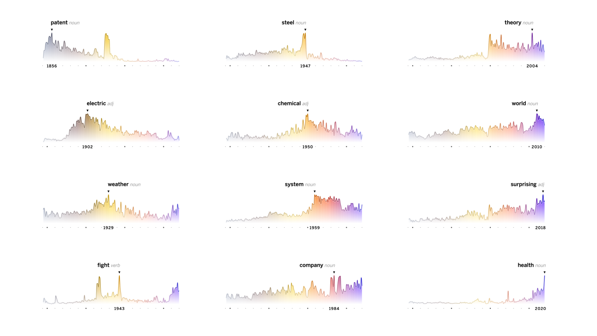This high-level view of the major shifts in vocabulary, shown as “sediment layers,” is complemented by the individual miniature line charts showing the evolution of each top peaking word per year. Both charts are connected through a custom color scale from vintage brown to modern purple, to tie the various graphics together and to support a quick visual classification of the central trend.
