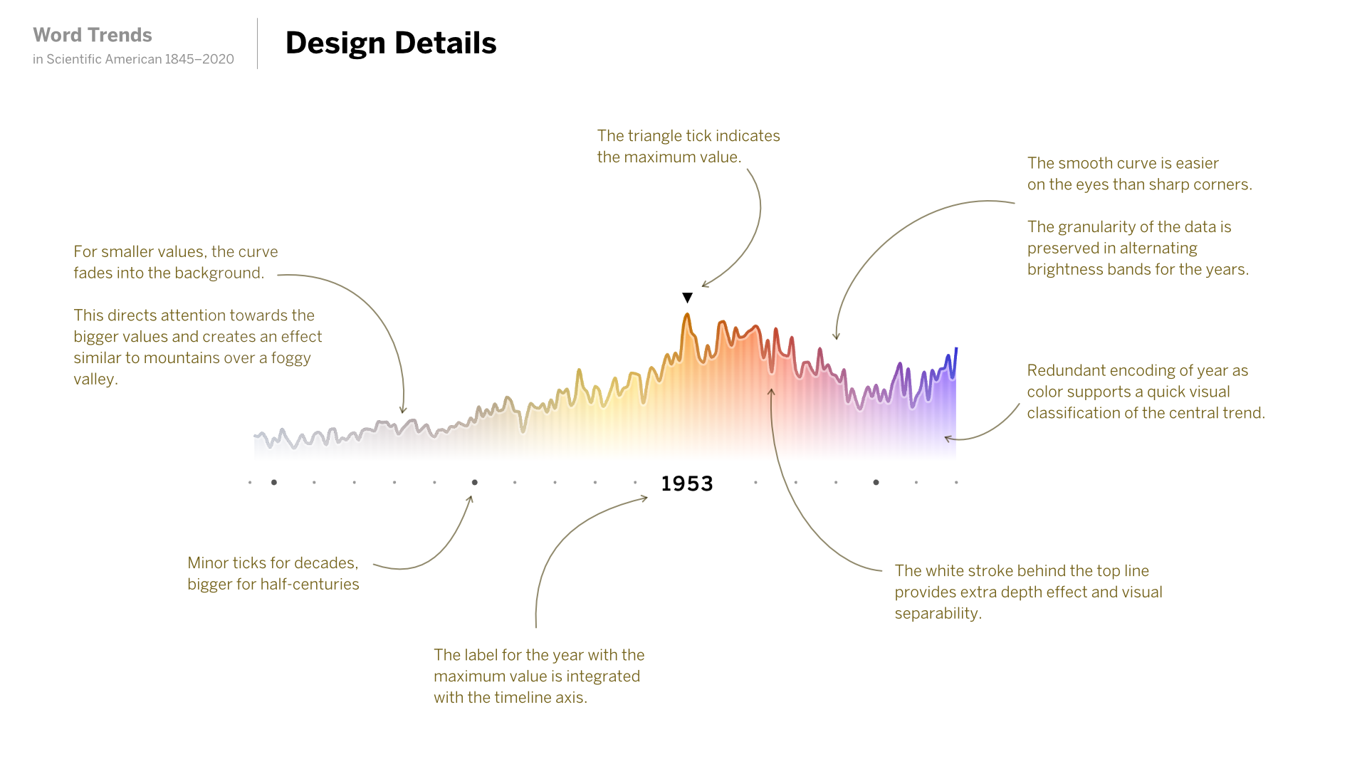 Finally, I believe finding a simple, straight-forward way to detect and present noteworthy trends — such as the yearly peaking terms, but also the curated juxtapositions — in combination with the thoughtful annotation and commentary on sides of the writer at Scientific American has been key to the success of this project.