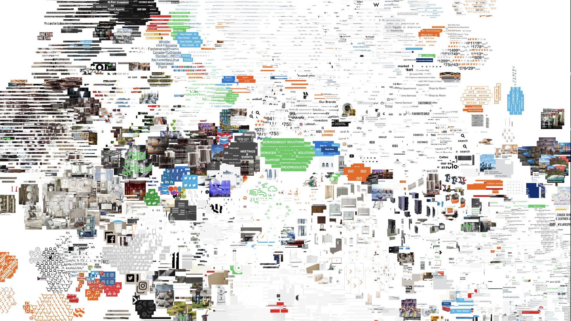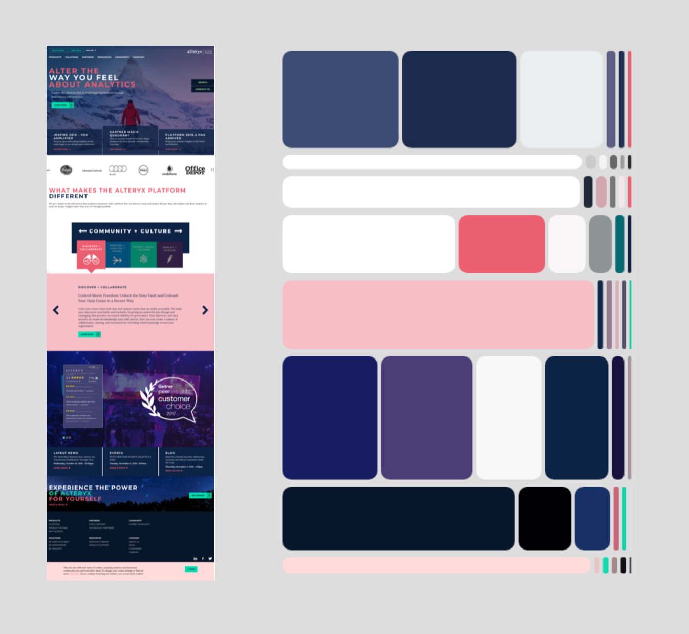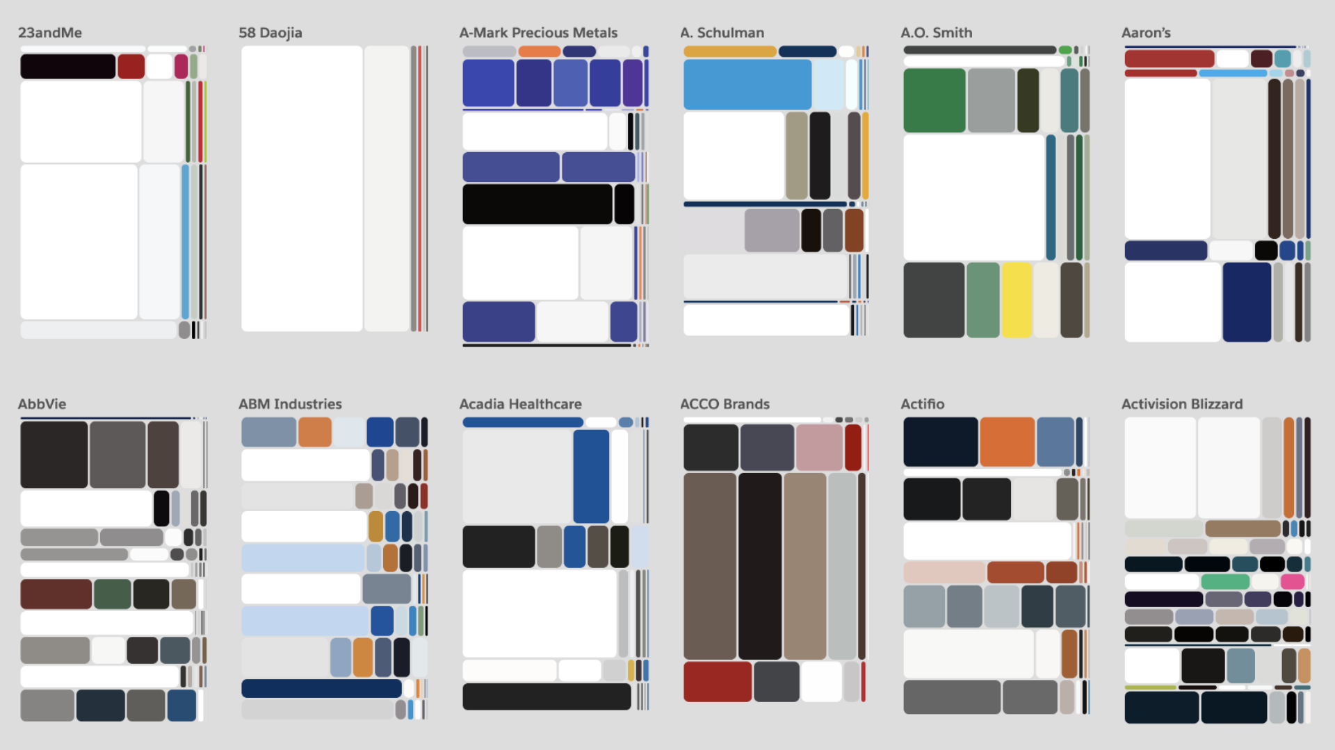 The results were fascinating: For instance, we learned that there isn’t a single color palette for a site or page, but that web design today favors slices — using different color palettes for different portions of a single web page. Second, a color palette is also not just defined the set of colors used, but also critically by their weights, i.e. how much space they occupy relative to each other. The visualization captures both the vertical, slicing rhythm as well the weights in a clear and comparable way.