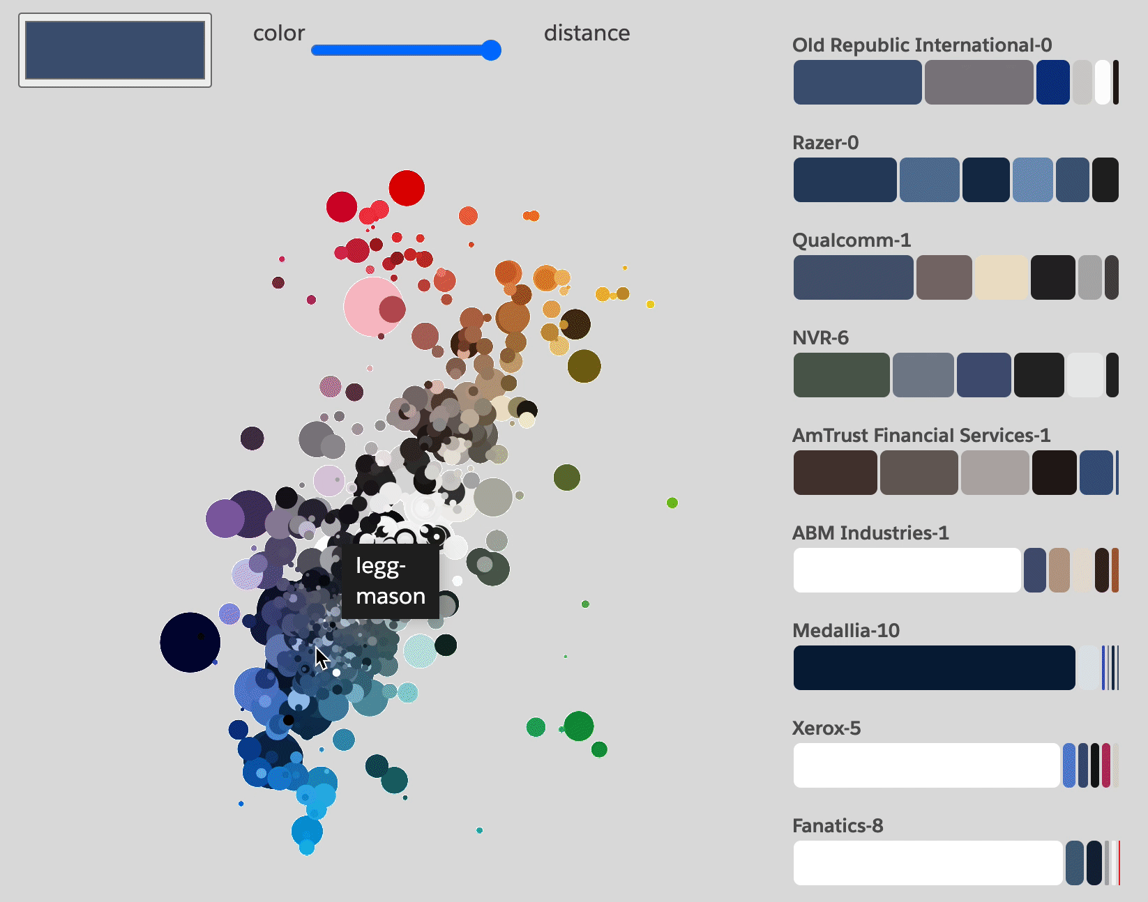 Based on this analysis, we built an interactive tool that allows to find matching color palettes and probability neighborhoods based on a selected anchor color.