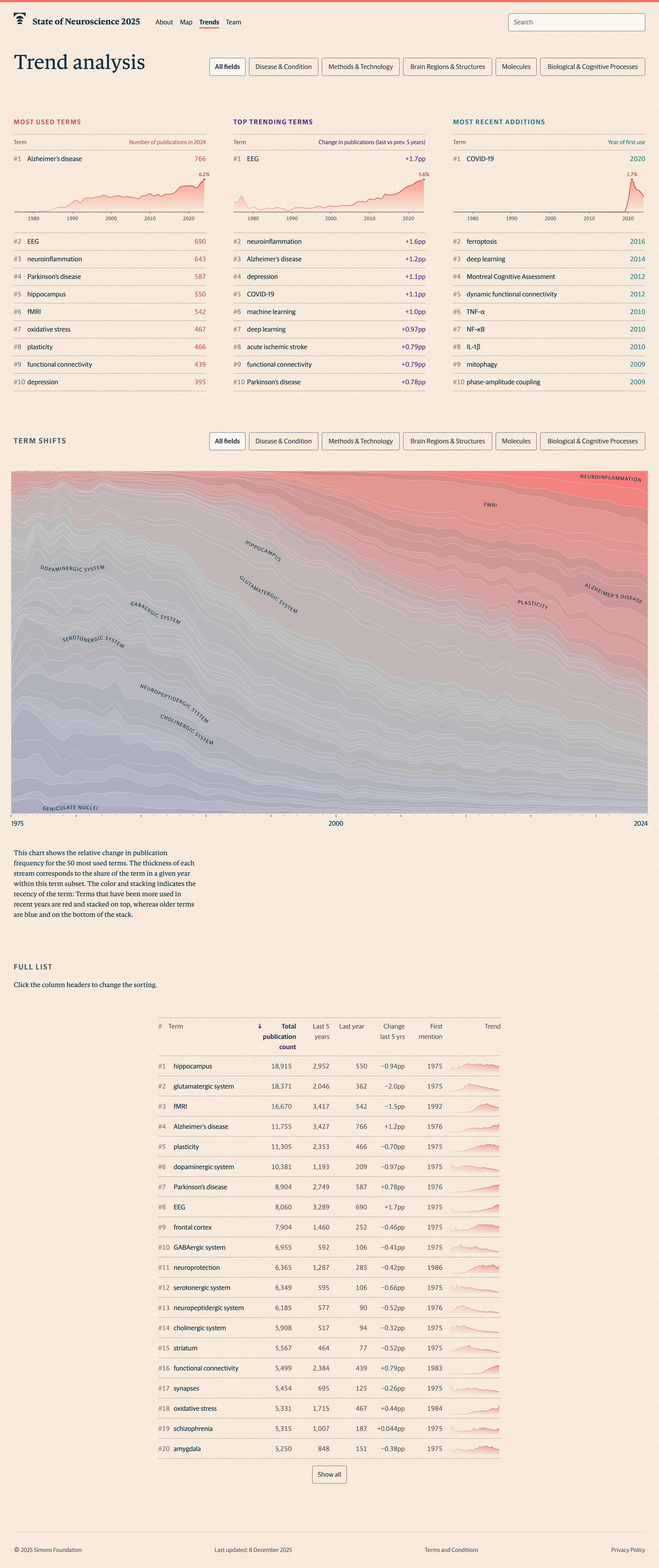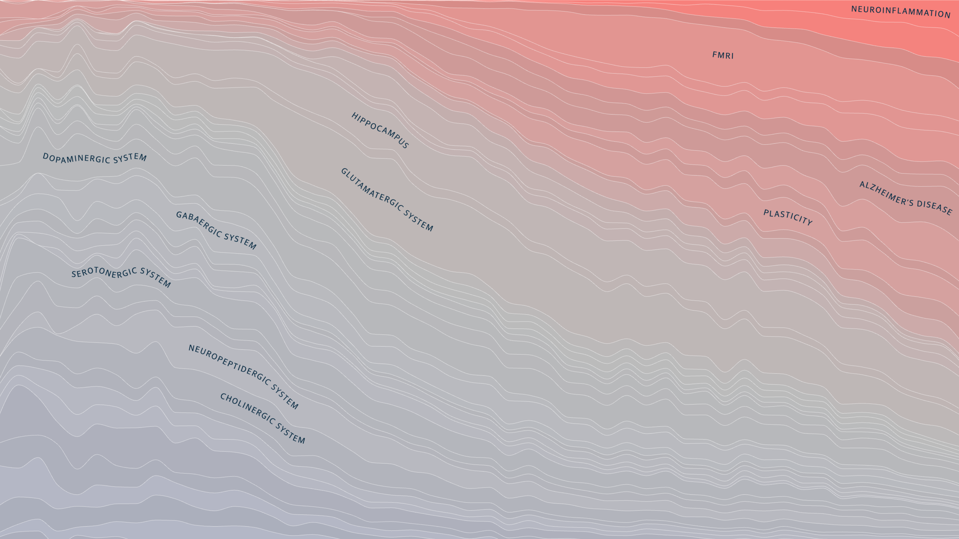 This visual puts 50 years of neuroscience research on the map — by analyzing nearly 350’000 research publications and extracting salient keywords. Based on this, we were able to map the semantic concept space of neuroscience research: how are topic related to each other — and where is the current focus of attention?