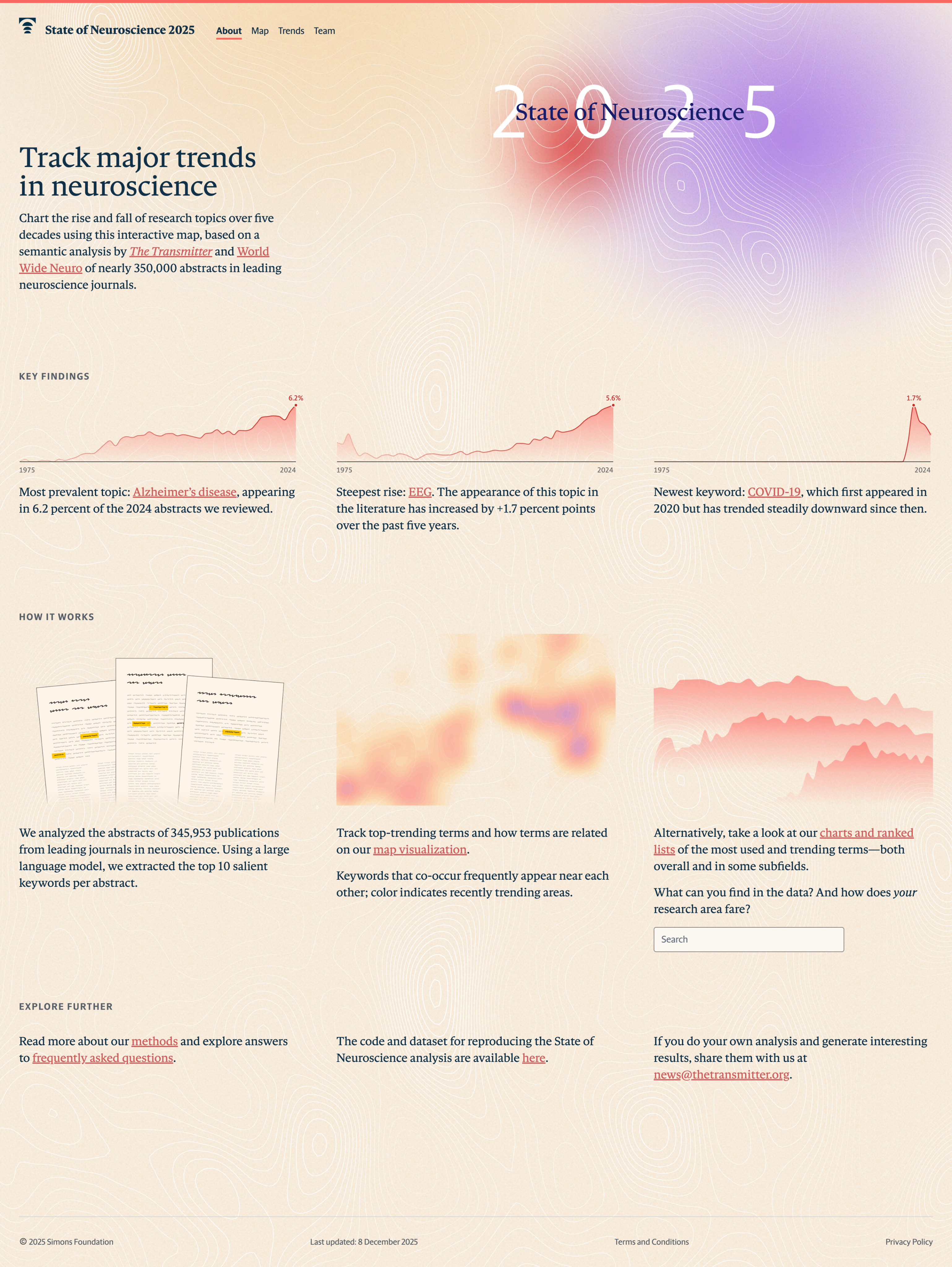 As the data‑visualization designer on the neuroscience mapping project, I led the transformation of 350,000 journal abstracts into an exploratory, term‑level landscape that invites discovery and surfaces meaningful patterns.