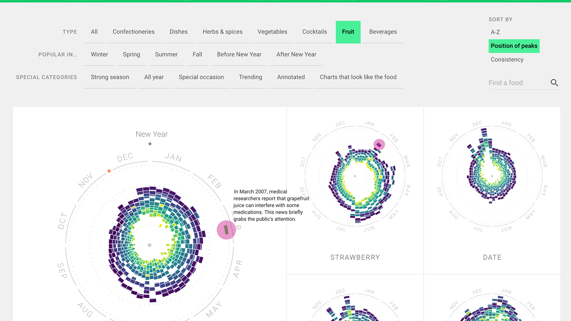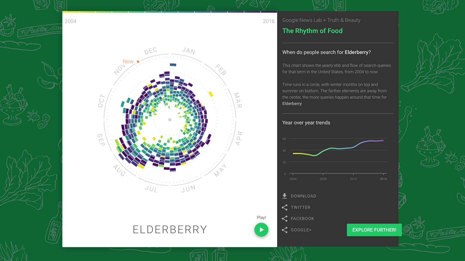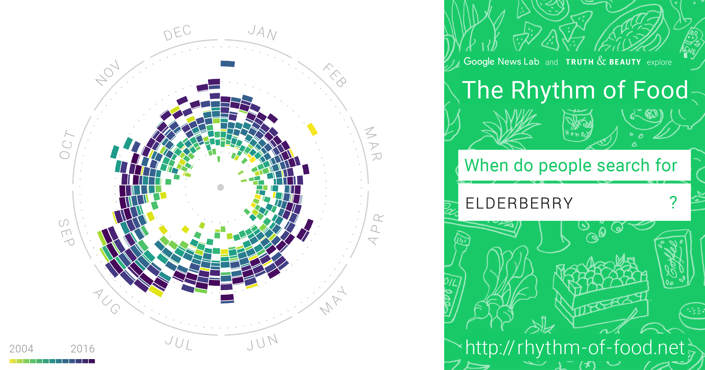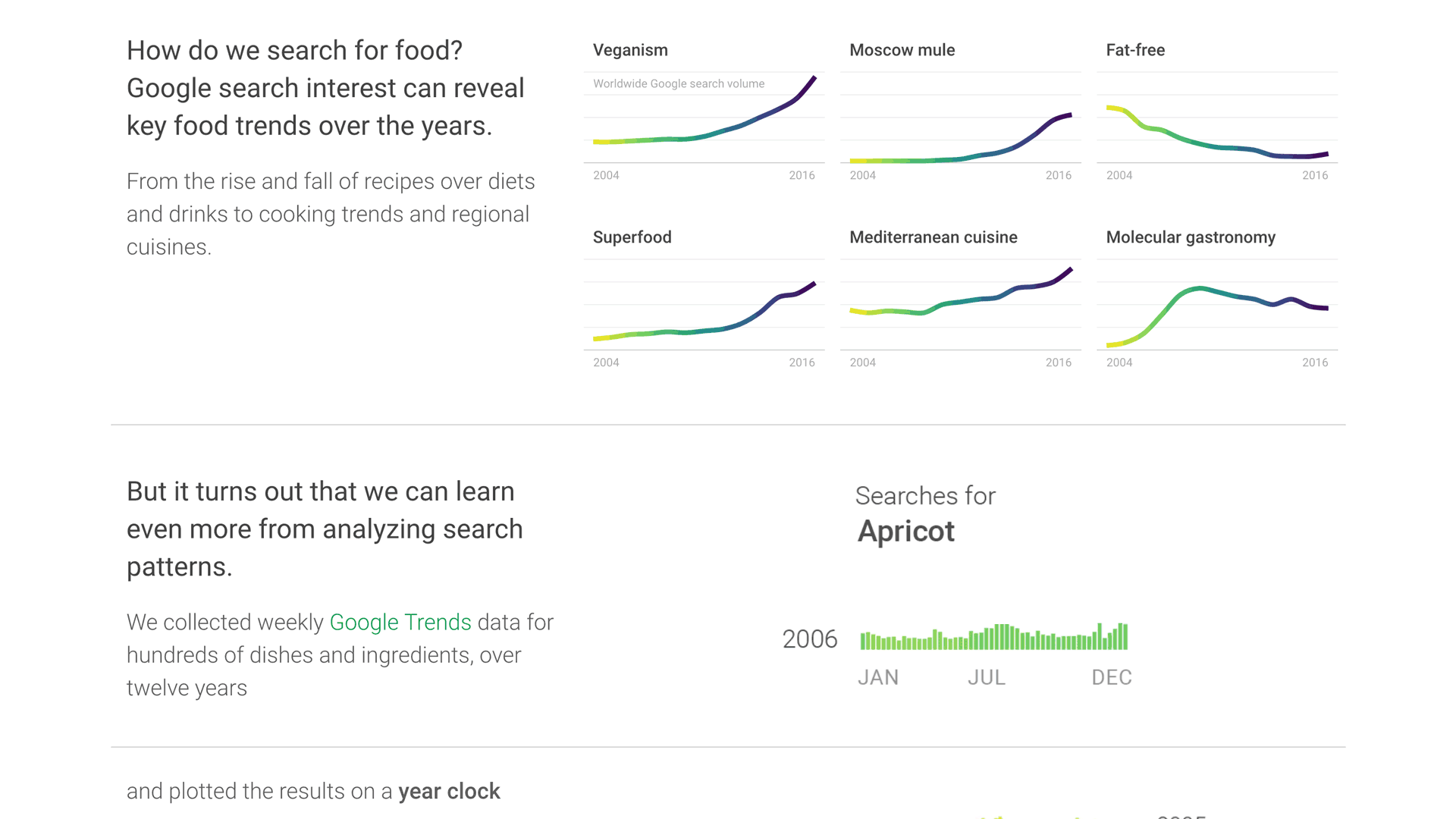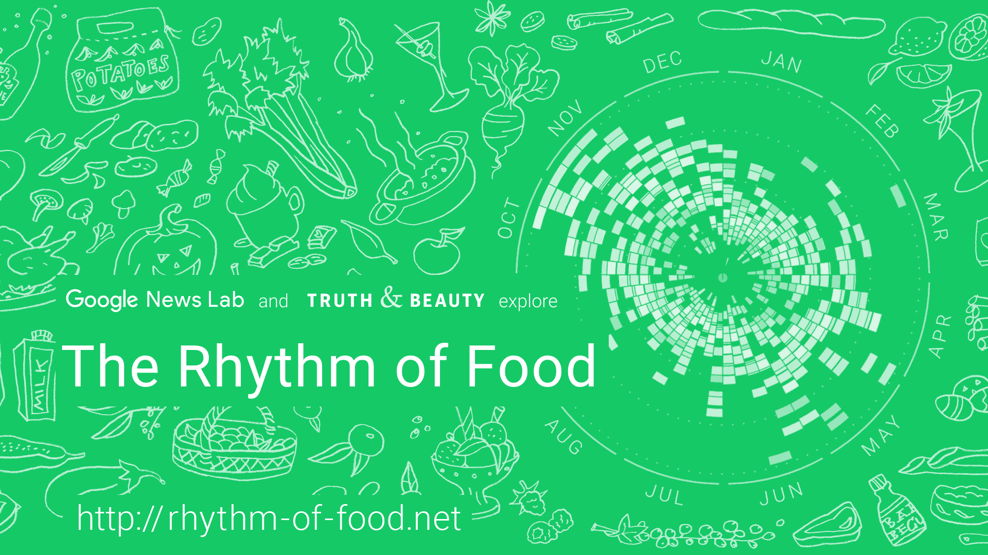 What can we learn about food culture by looking at Google search data? When do people search for smoothies, soup, or fruit salad? The Rhythm of Food, a visualization project in collaboration with Google News Lab, sheds light on the many facets of food seasonality, based on twelve years of Google search data.