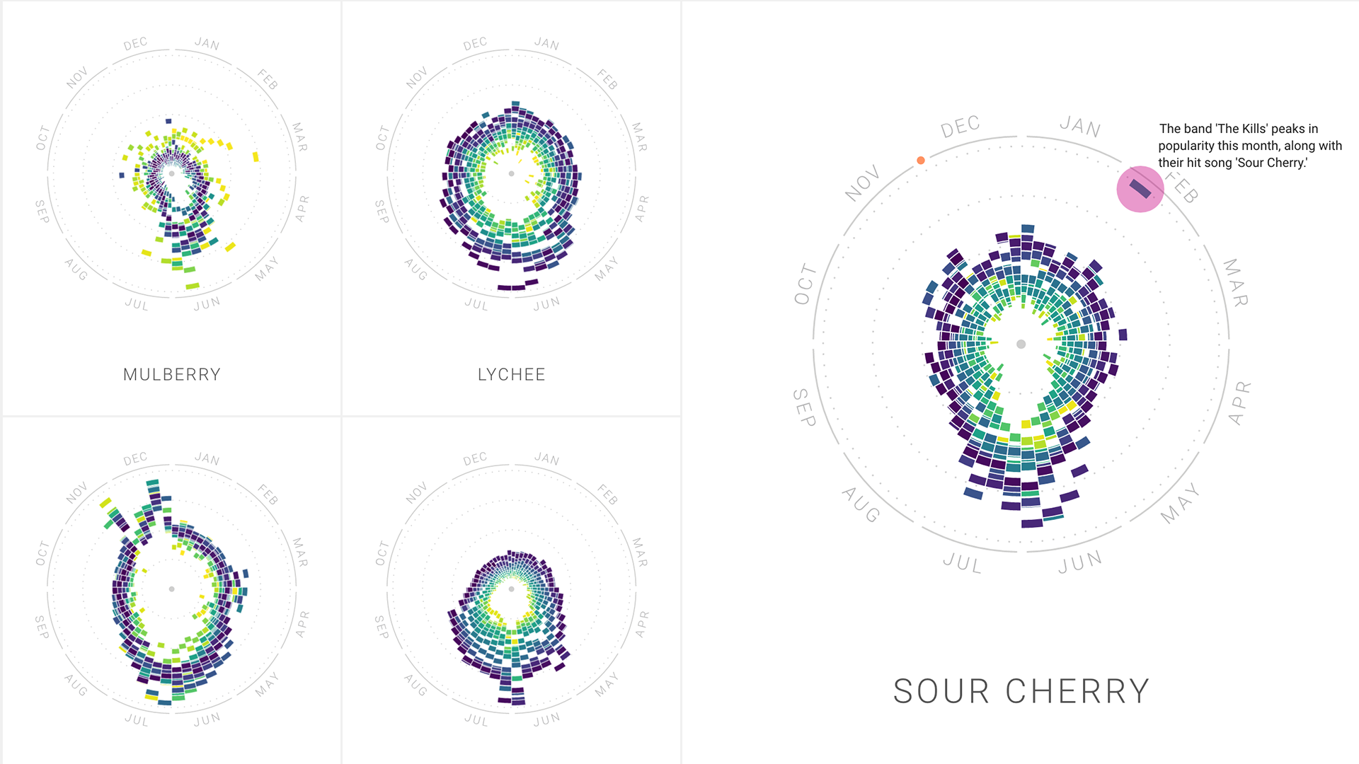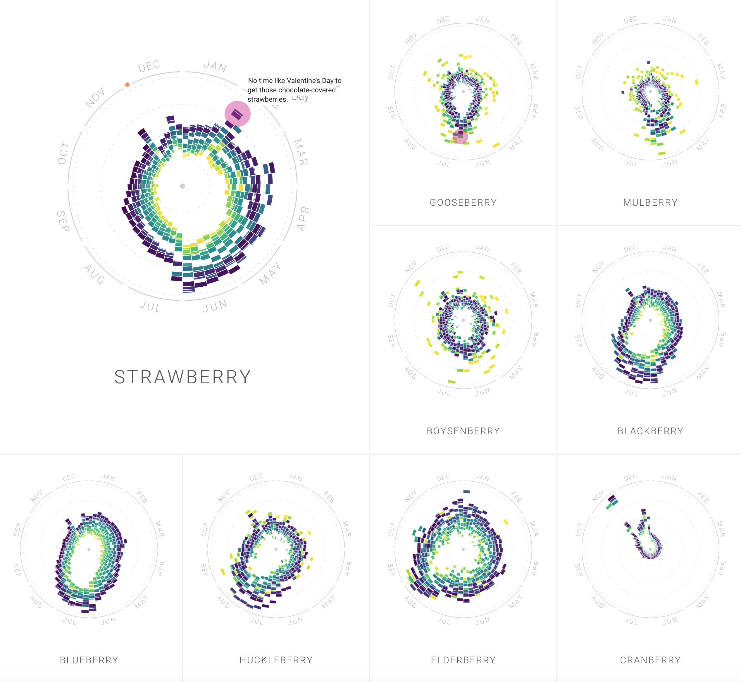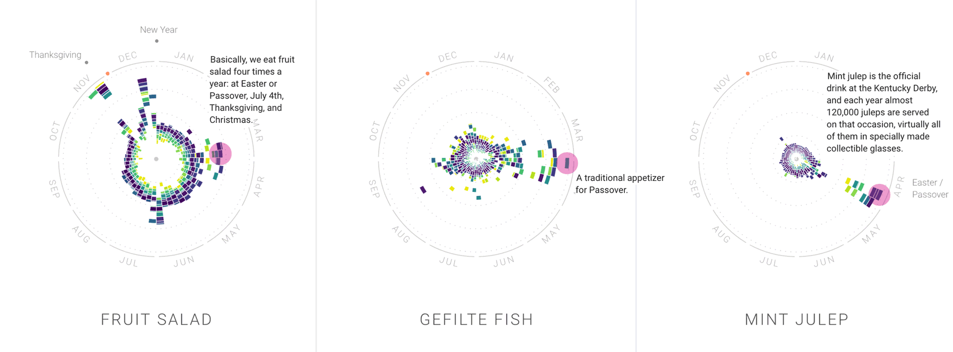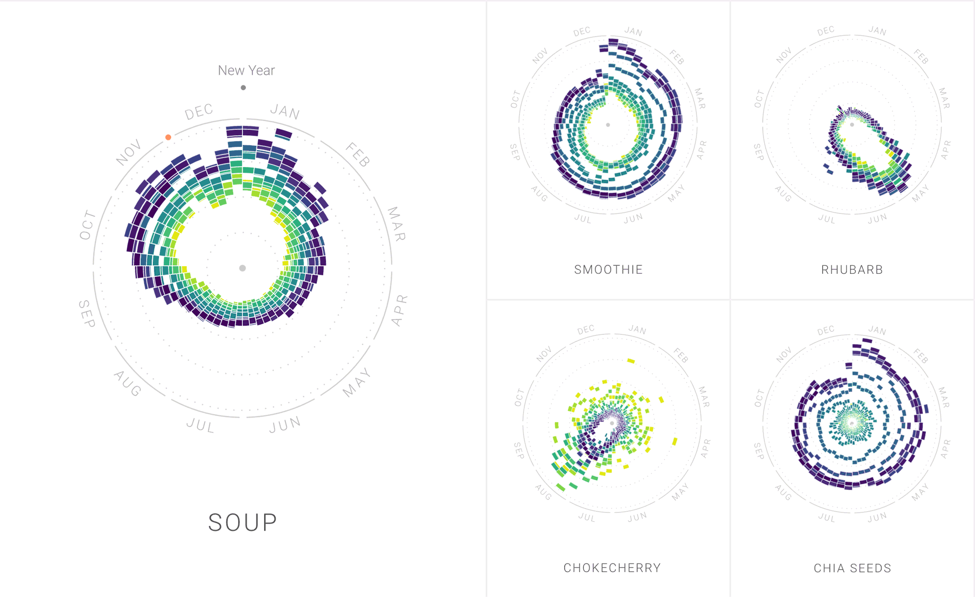 In order to investigate seasonal patterns in food searches, we developed a new type of radial “year clock” chart to reveal seasonal trends for food items. Each segment of the chart indicates the search interest in one of the weeks of the past 12 years, with its distance from the center showing the relative search interest, and the color indicating the year. This allows to spot both rhythms that repeat on a yearly basis (such as natural season, peaks at holidays, …) but also year-over-year trends (such as the rise of avocado or the collapse of interest in energy drinks).