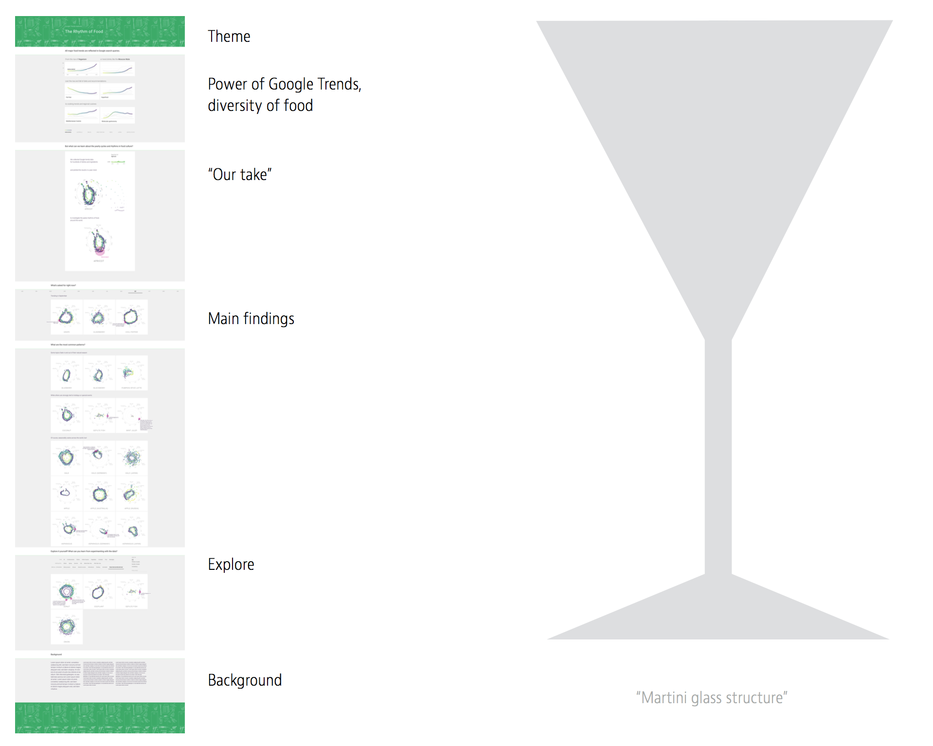 In the end, we settled on a single long web page, following a so-called “Martini glass structure”: Provide a wide overview and introduction to the topic first, then narrow down towards a single, narrative path through the key insights, and then open up to free, self-steered exploration.