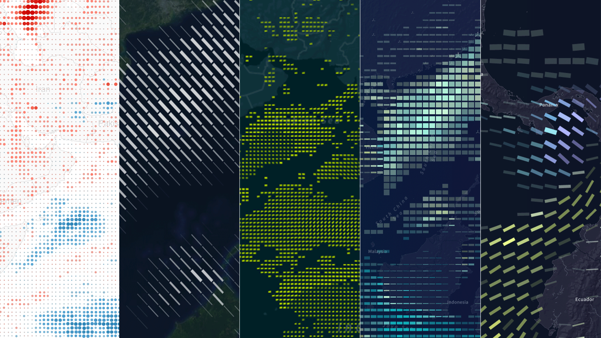 These encode prediction skill (i.e., how well the prediction model performed on historic data in that region) through opacity, predicted wind speed through line thickness and predicted trend of wind speed in line tilt and color.