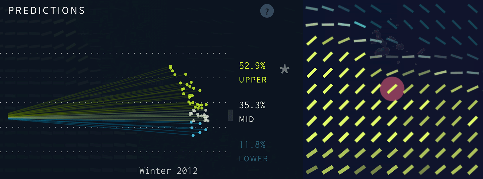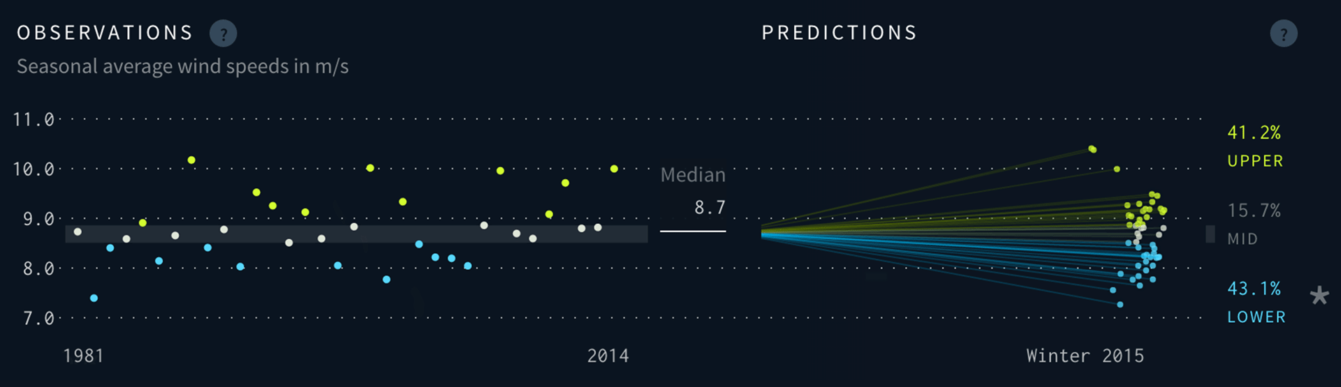 Our visualization allows energy traders, wind farm managers and others to spot global patterns and trends in future wind conditions, and drill into detailed prediction breakdowns on a regional level.