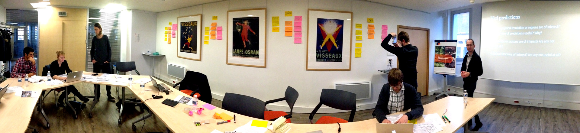 We kicked off the conceptual investigations with a user workshop, where we developed a series of persons and usage scenarios together with domain experts. It helped me understand the types of users who would be working with the prediction data and which angles or perspectives they would be interested in. For instance, a recurring theme was the importance of extreme changes in conditions in a specific region. The other insight I gained was that the tool would be used by expert users on a recurring basis, so this gave me some leeway in coming up with more powerful, but maybe not immediately intuitive visual encodings.