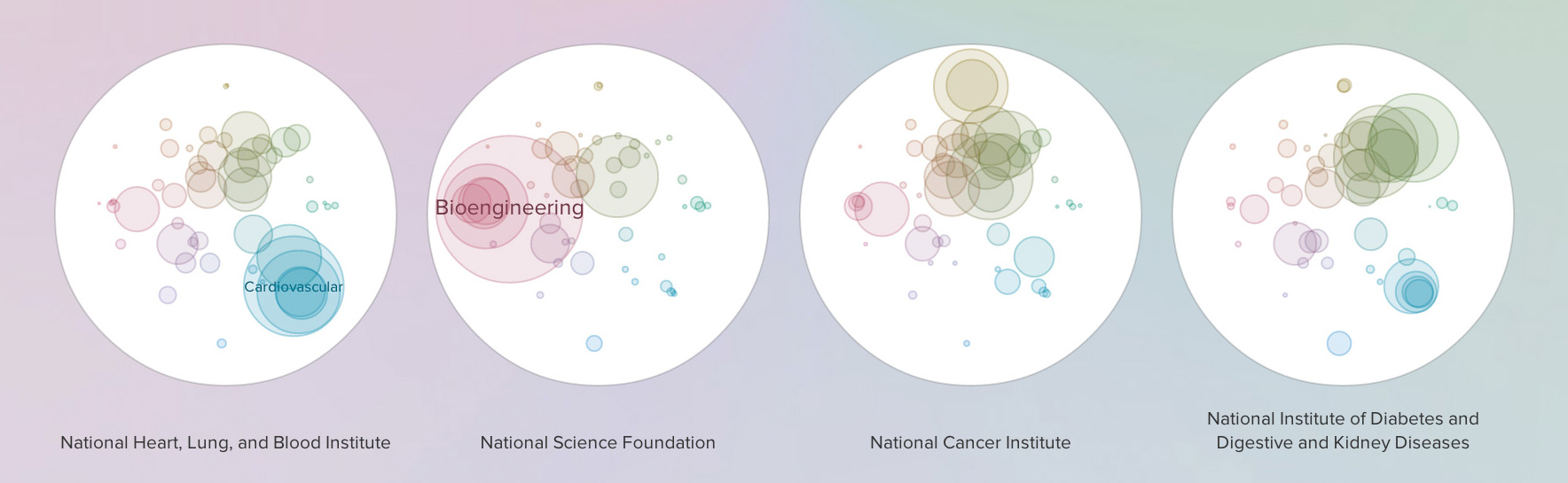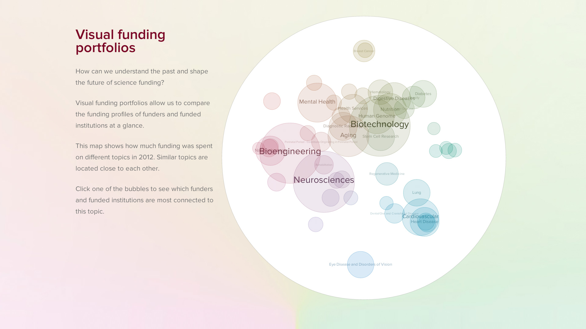 In this map, the bubble size shows the grant amounts spent on the topics, while the placement and coloring indicates similarities in the distribution of funding organizations for that topic.