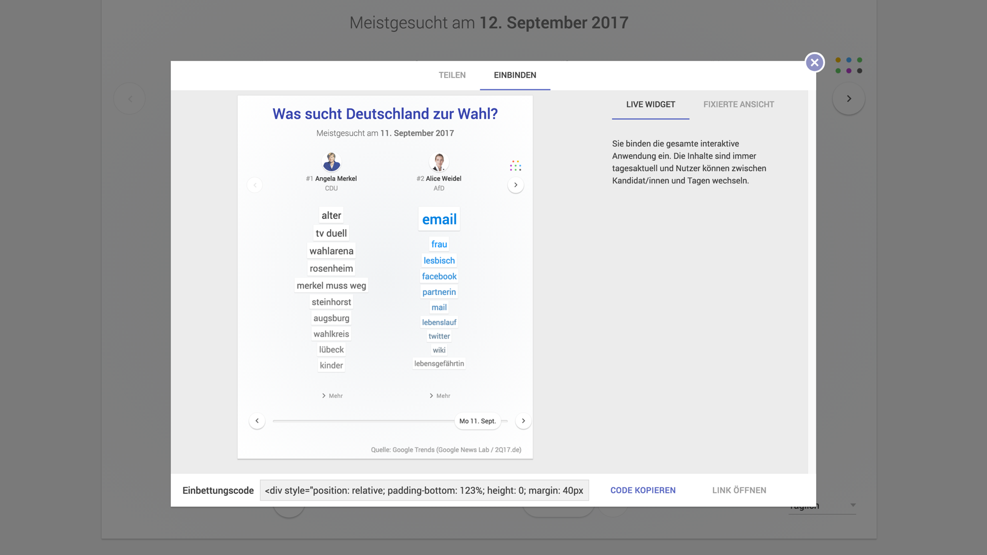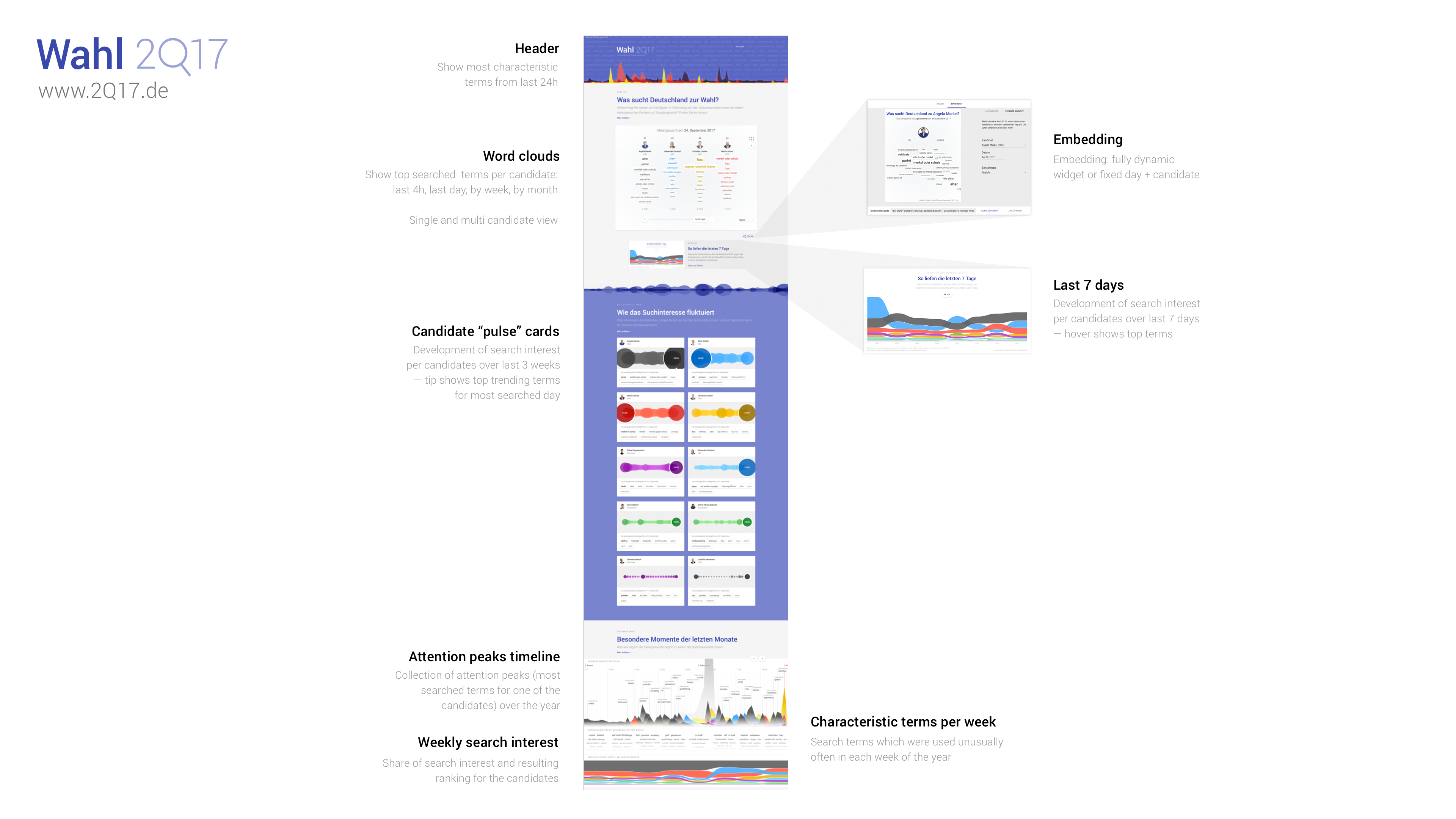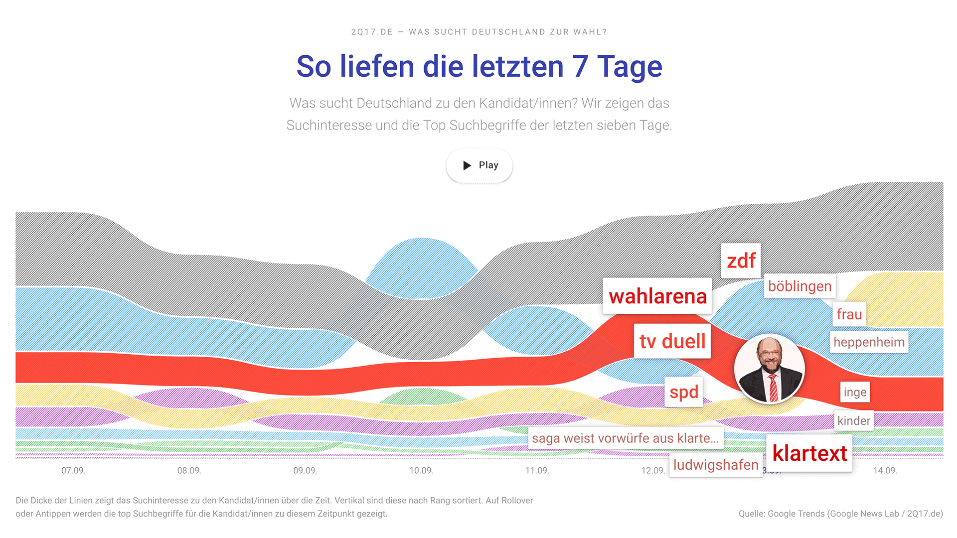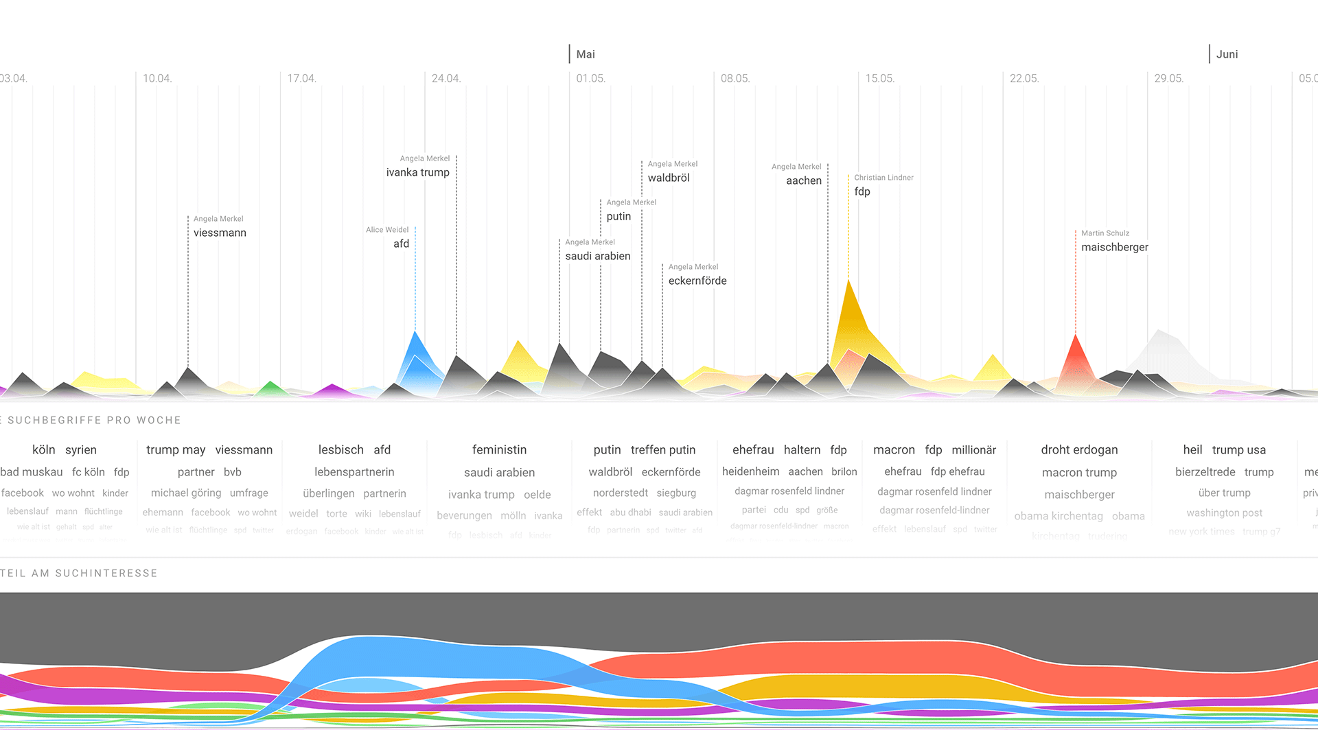 How do people search for candidates and political topics? And what are they really interested in? Wahl 2Q17 uses Google Trends data to visualize the Google Search interest in the top candidates of the seven most searched political parties in the German general election 2017. From near real-time to long-term search interest, the project provides a rich overview over the search activity of millions of people.