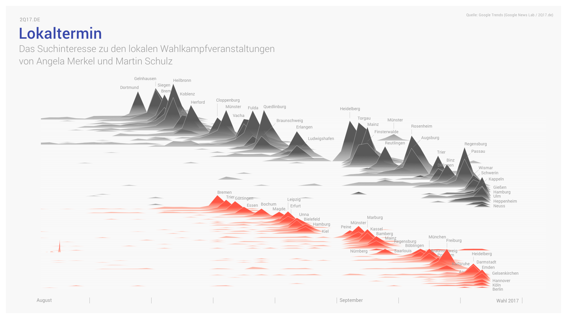 We produced this one by cross-referencing local campaign event dates with the relevant searches (e.g. "Schulz Fulda" or "Merkel Dortmund") If you look closely, it reveals how Merkel continuously manages to draw more attention, starts earlier. They both take a break in the middle - the weekend of the big TV duel. Finally, it's also notable how the pace increases towards the end.