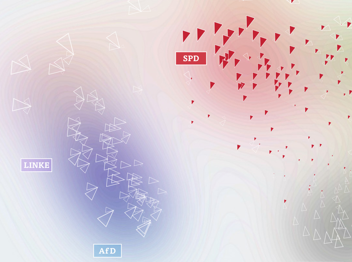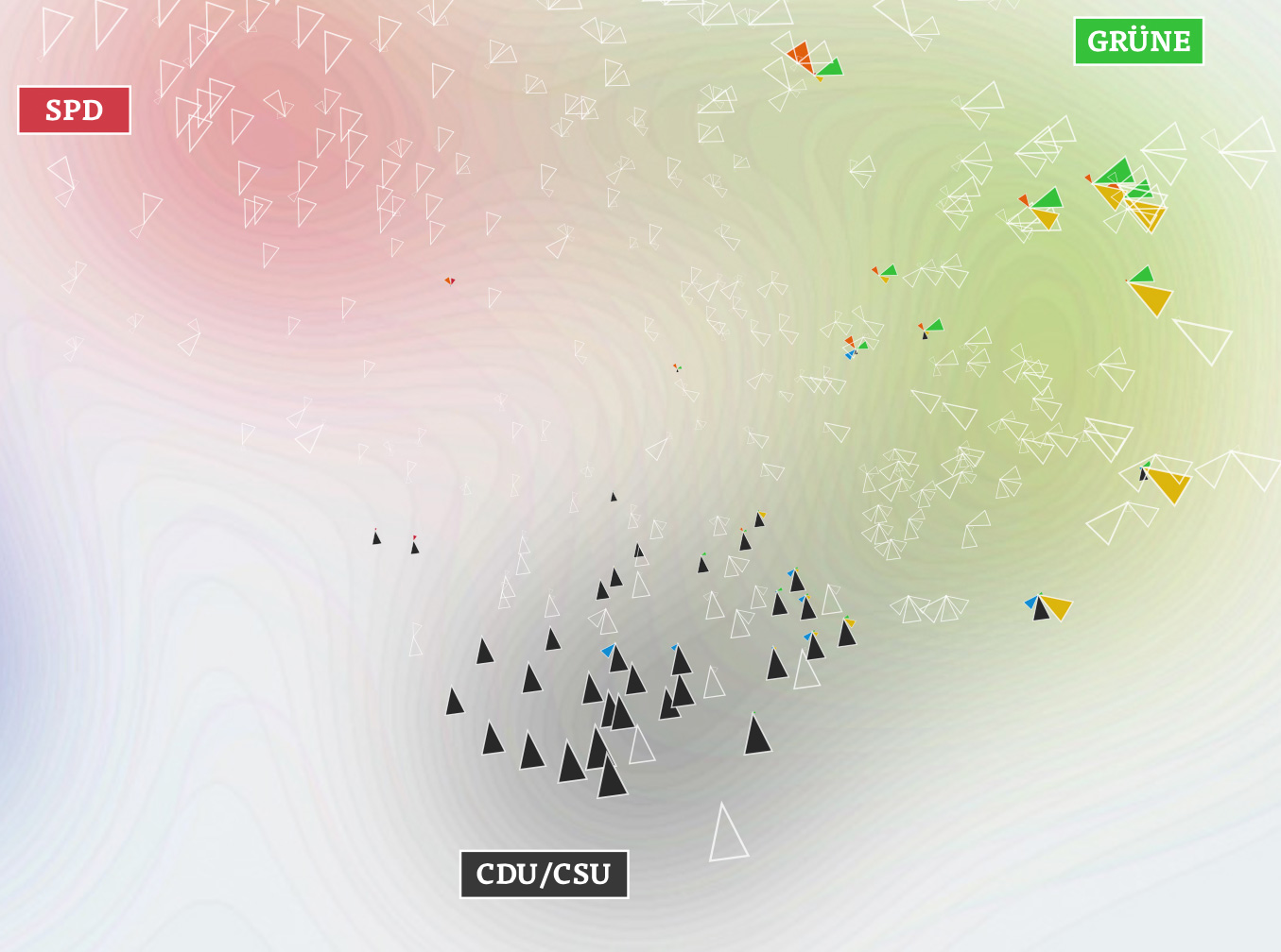 First of all, it is important to note that the rotation of the map is a purely aesthetic choice. The MDS algorithms defines only a relative space, where the positions of all elements with respect to each are important, but not on absolute axes. But within the data, some interesting axes seem to emerge nevertheless: top-to-bottom seems to be correspond quite well to the traditional left-to-right spectrum. The left-to-right axis to interpret is a bit trickier but definitely seems related to social status or income. Also interesting to see how the blue AfD party — a newly founded euro-sceptic protest party, sort of a wild card — seems to be all over the map in the vertical center. A bit shocking also to see how there still seems to be a gap in Germany (the island on the left in pretty much exclusively ex-east Germany), with only Leipzig and Postdam bridging the gap. A note on the huge orange triangles for the Pirate party — actually, their results were not that great, but this enabled them to be very much above average in some districts.
