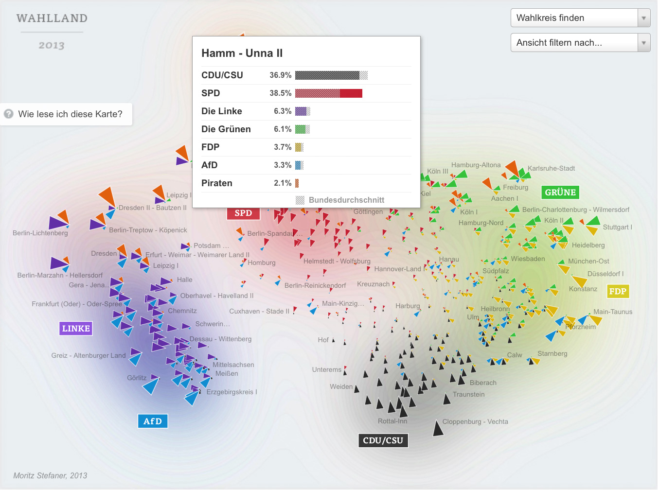 Wahlland presents a whole new kind of election map for the German Bundestag elections 2013, commissioned by ZEIT Online. Instead of showing the electoral districts results on a geographic map, or in a table, I decided use the data to map a new land: Electionland, where all the districts which vote in a similar way are located nearby. This new kind of map allows us to see a Germany grouped by lifestyles, preferences and attitudes.