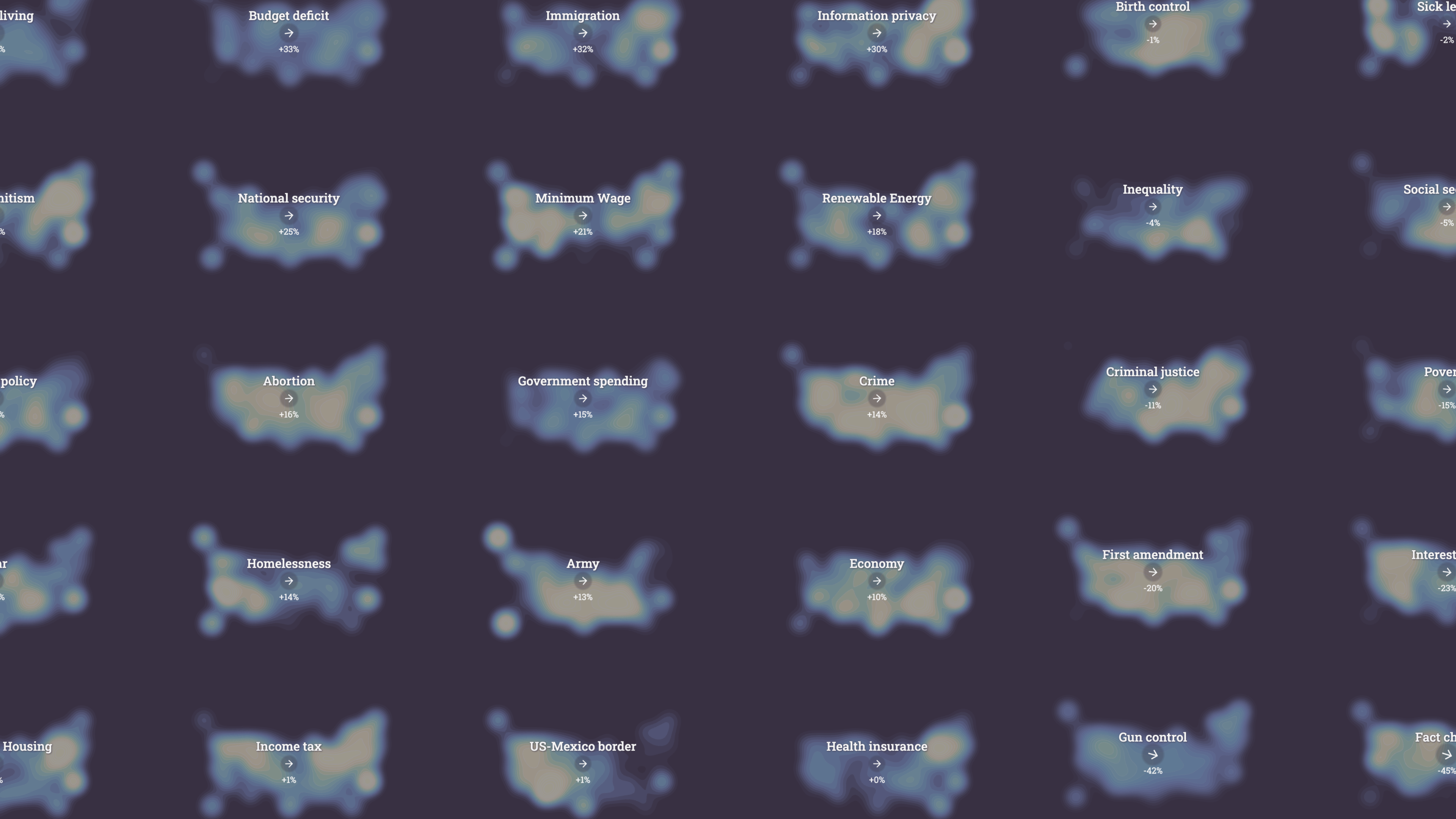 Classic political issues like foreign policy, national debt, education, … seem to have lost importance. On the flipside, issues around the election process or the administration, but also topics closer to personal situations and experiences (affordable housing, inequality, racism) have gained in interest.
