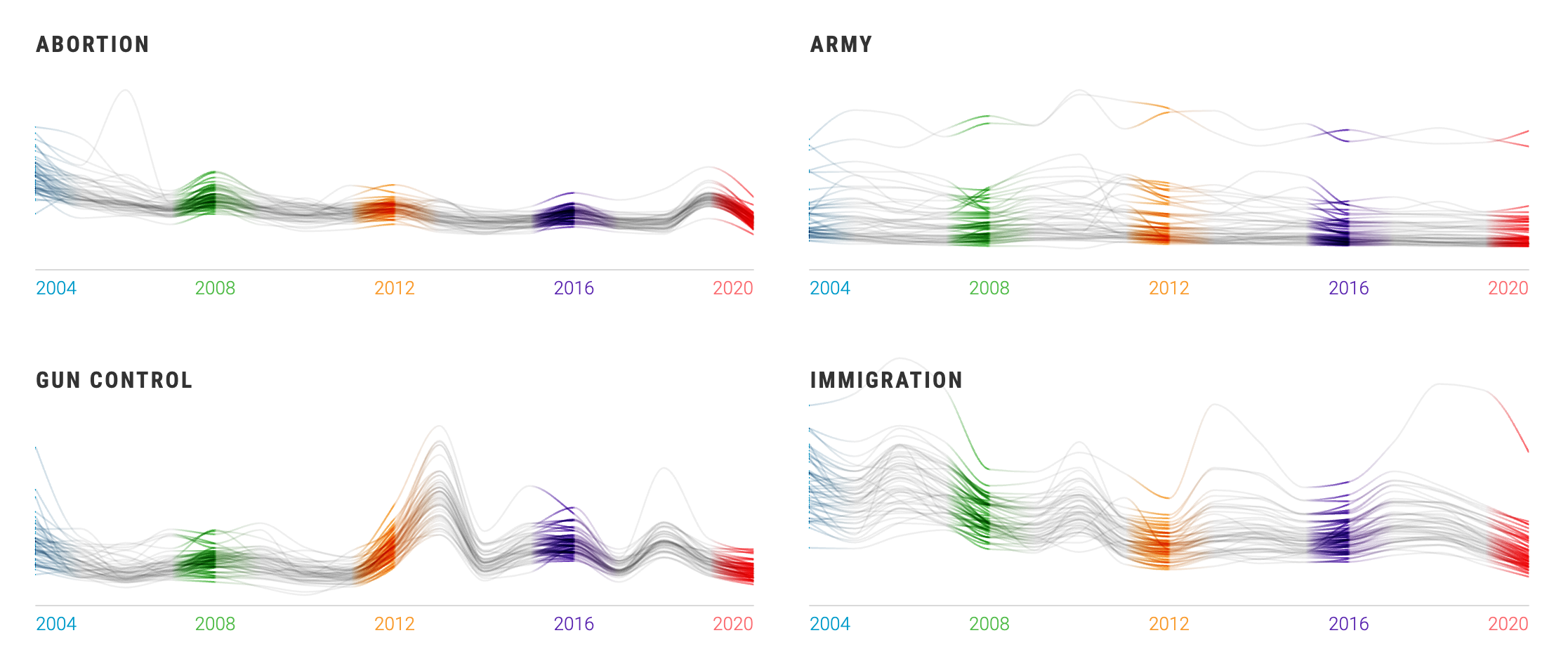 2016, and now 2020, are widely perceived as years of abrupt change, but interestingly, our data often shows smooth developments over longer periods of time, and less sudden shifts than we would have expected. Some individual topics surged in interest (like e.g. Tariffs in 2018), but many issues stayed very consistent with their previous developments.