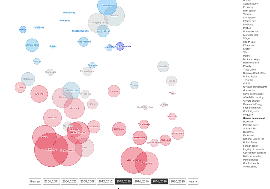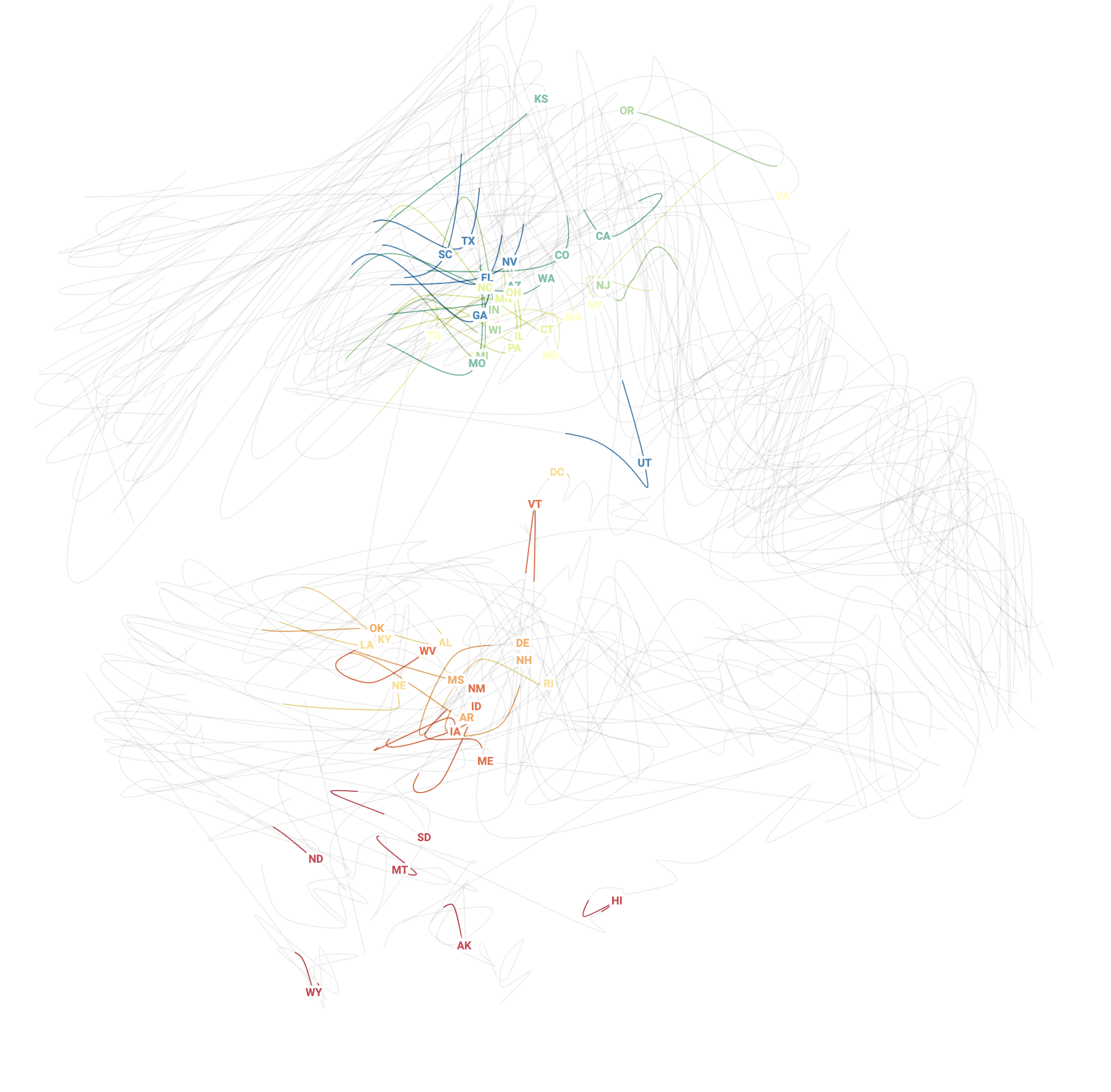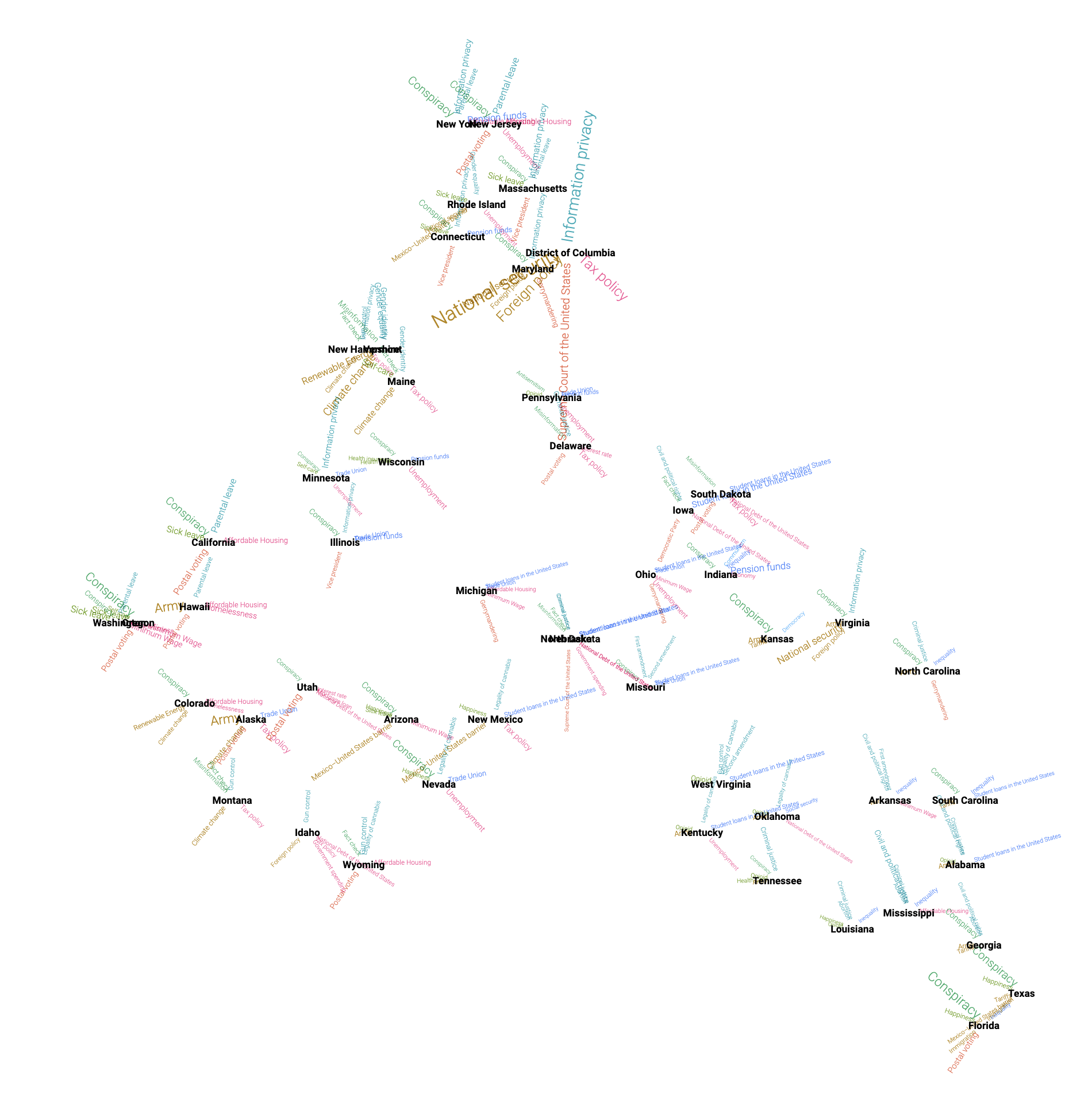 - At the same time, each topic does have a unique "fingerprint" on the map. The topic landscape of interests is indeed more diverse than we expected. "Red" and "blue" states are visibly different, but that's not the only story in the dataset. There are definitely more than "two Americas".