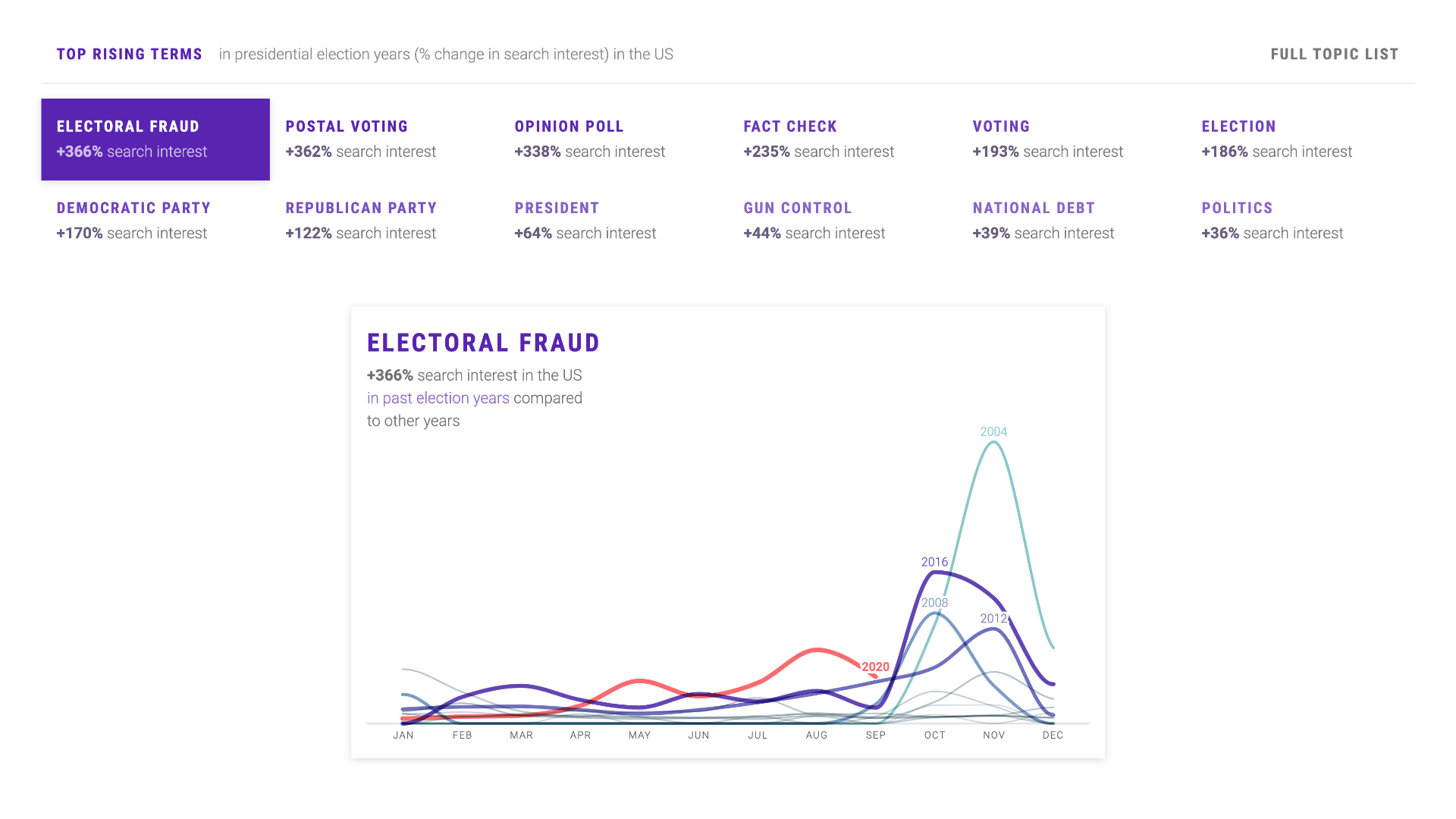 We show both a list of top rising topics in election years, as well as a detailed chart of how their search interest values unfolded over the years.