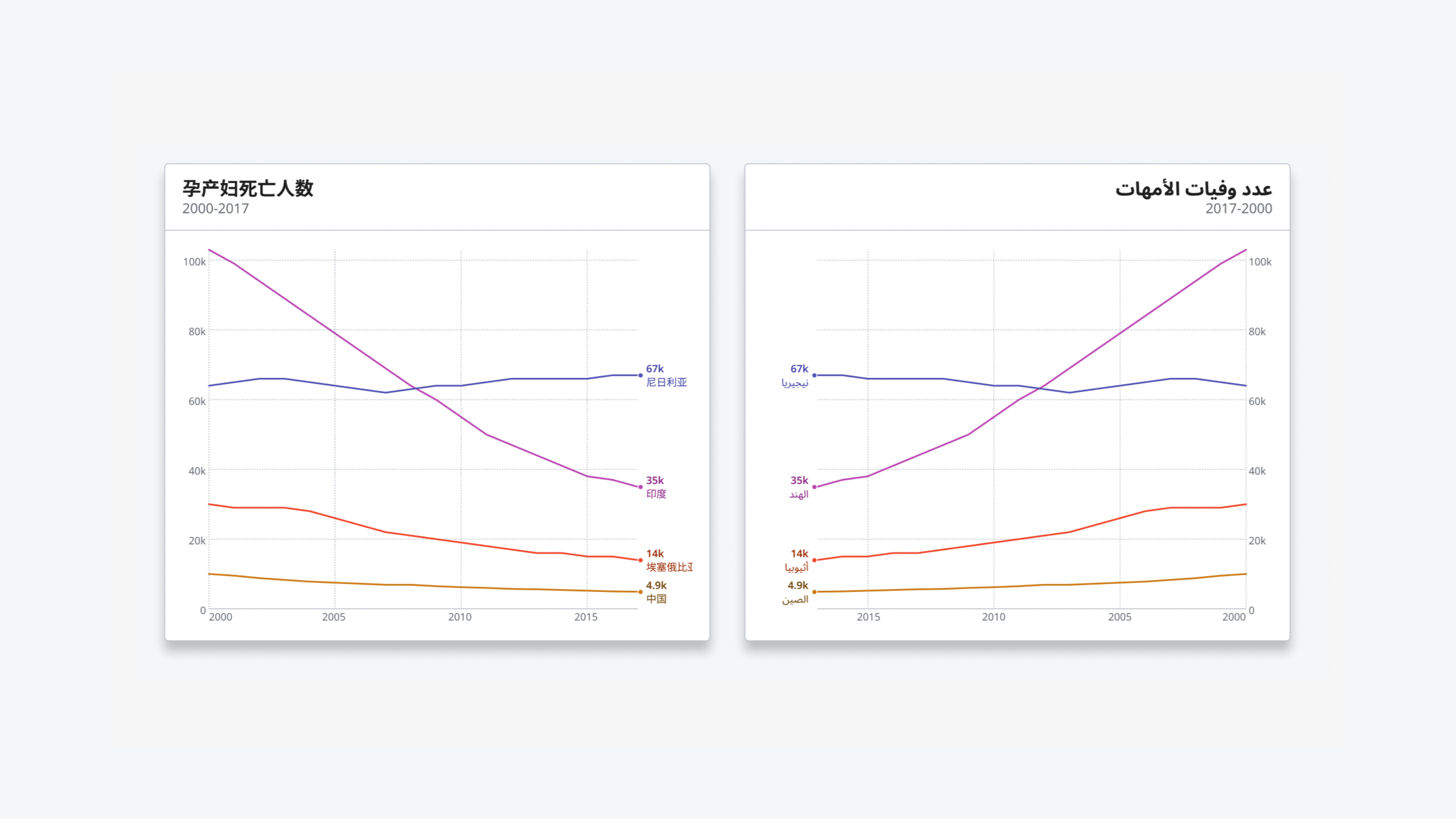Inline label placement is an important feature in the chart implementations. External legends and tooltips cause extra cognitive load, and might not show up in screenshots or static image exports. Consequently, we aim at providing inline labels wherever possible. They can be challenging to place without overlap, but the effort pays off — through highly improved readability and versatility of the charts.