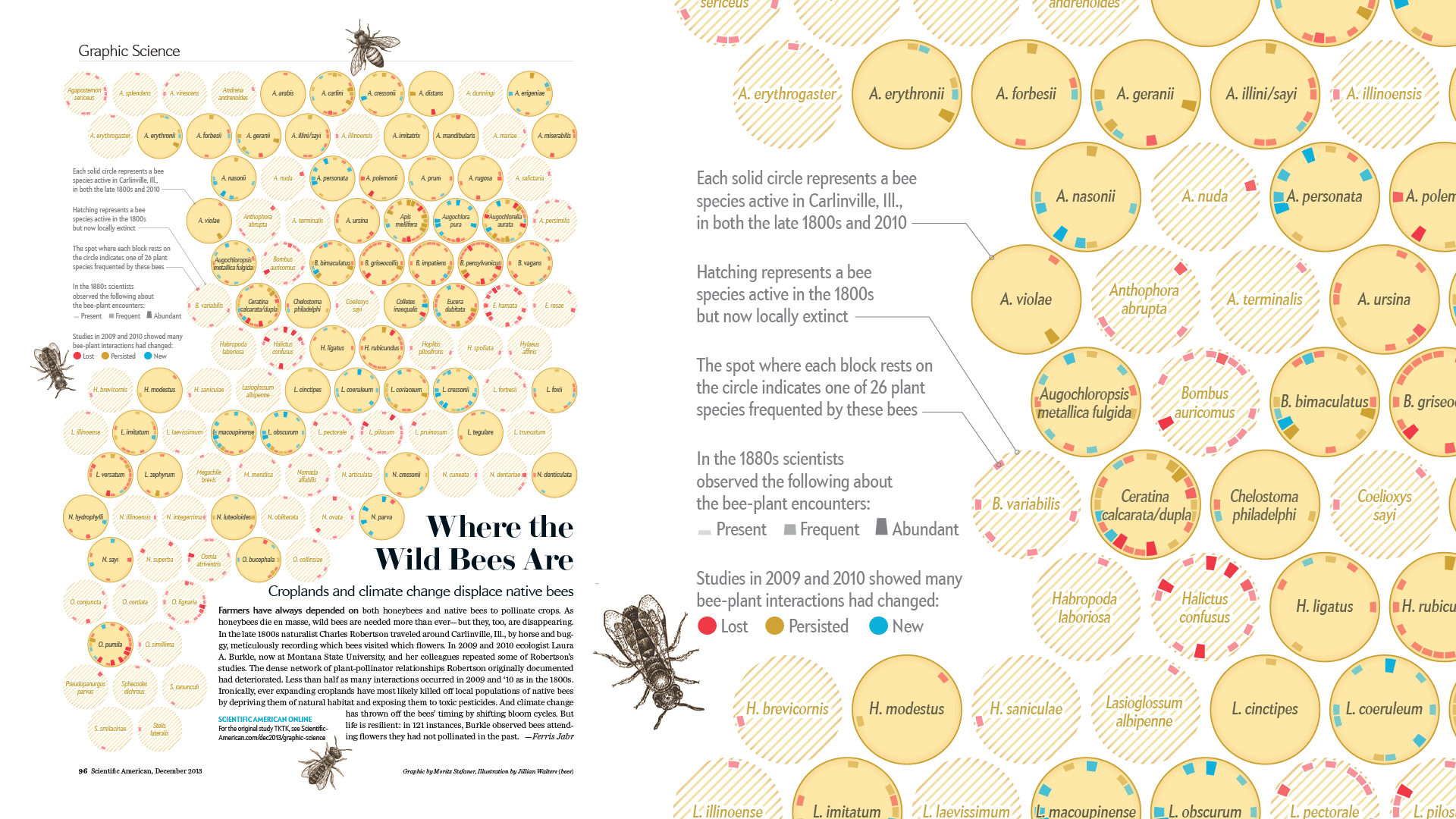How has the bee population changed over the last 120 years, and how has that affected bee-plant interactions? Scientific American commissioned me to design a custom visualization of a complex dataset.